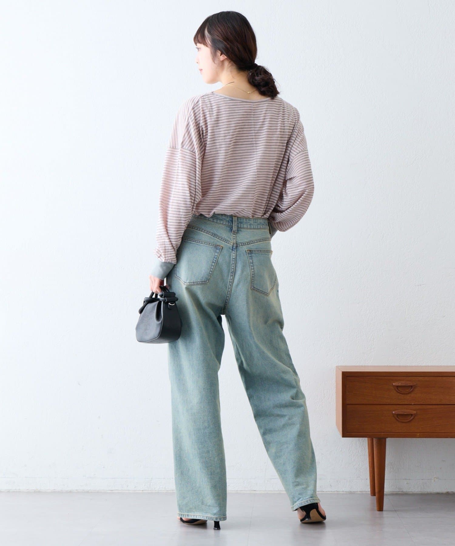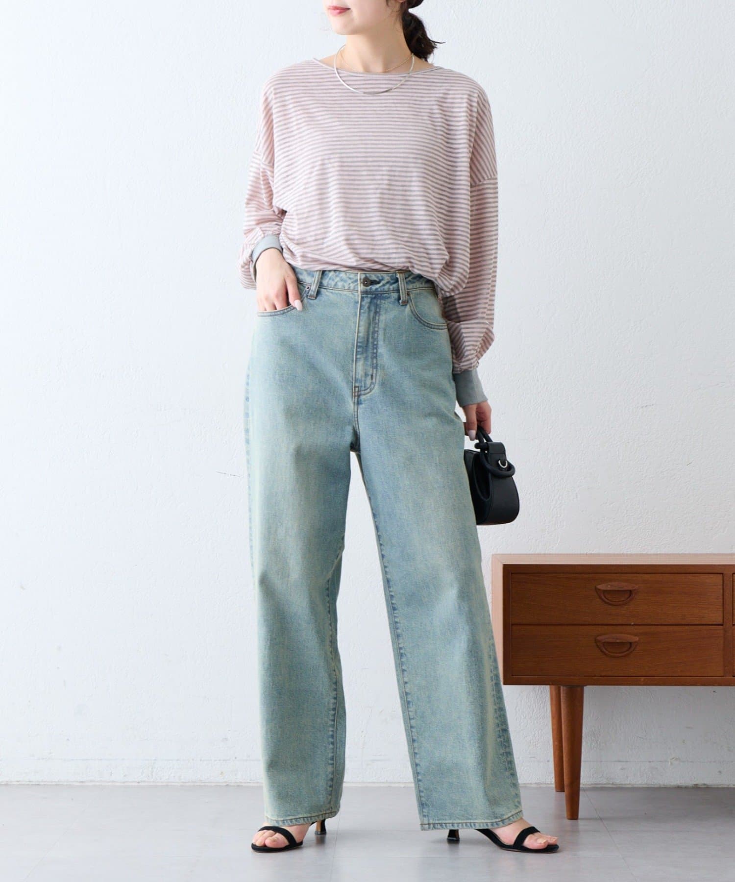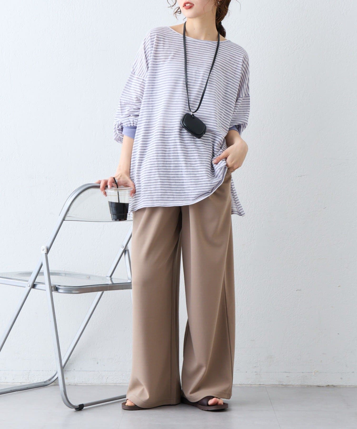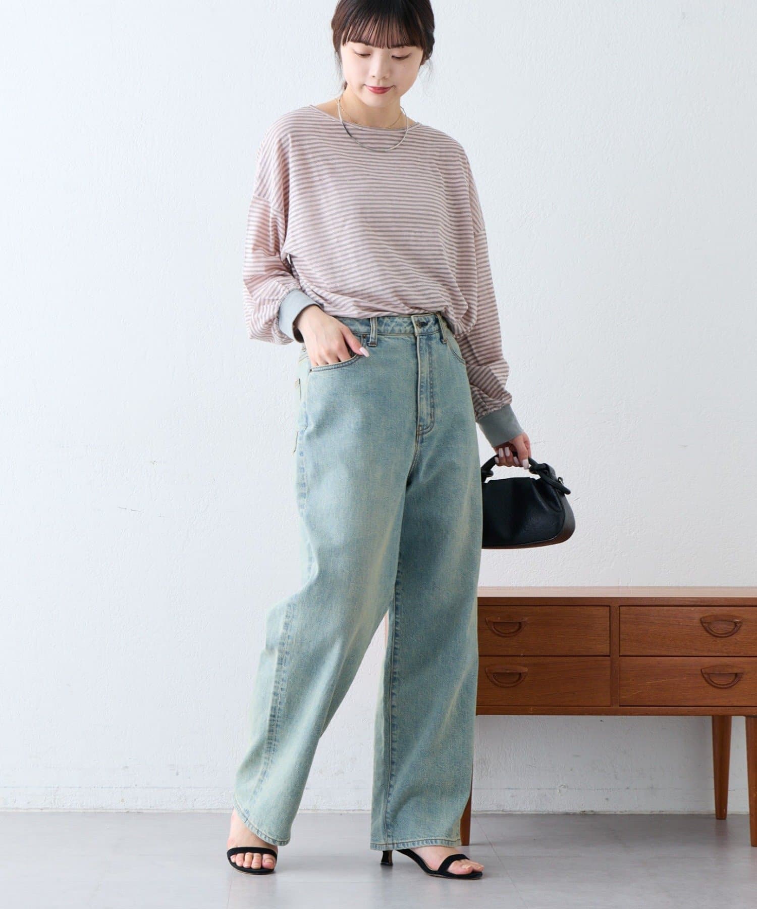 細く淡いコントラストのボーダーがカジュアルすぎず女性らしい印象に。