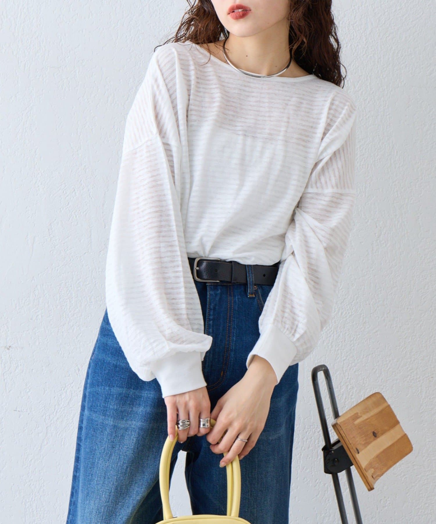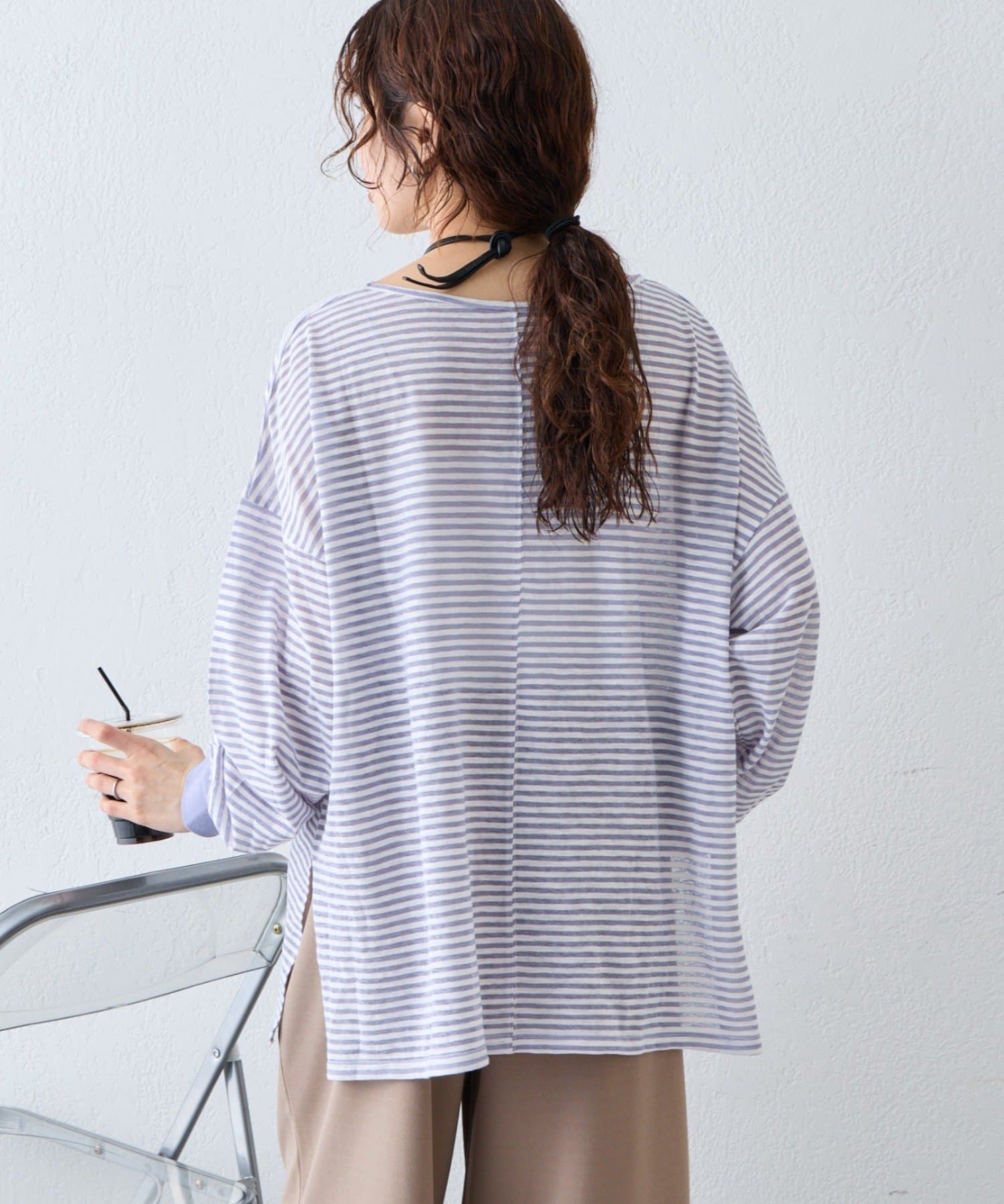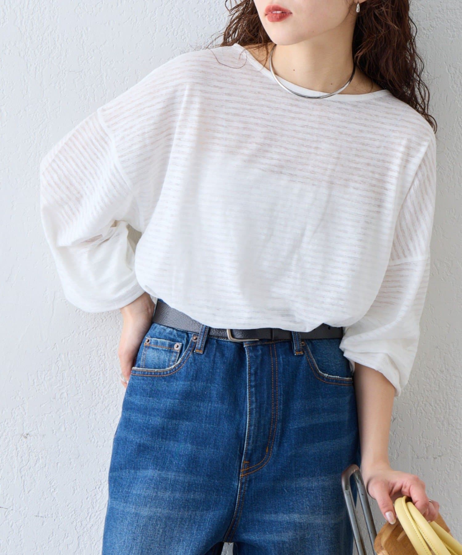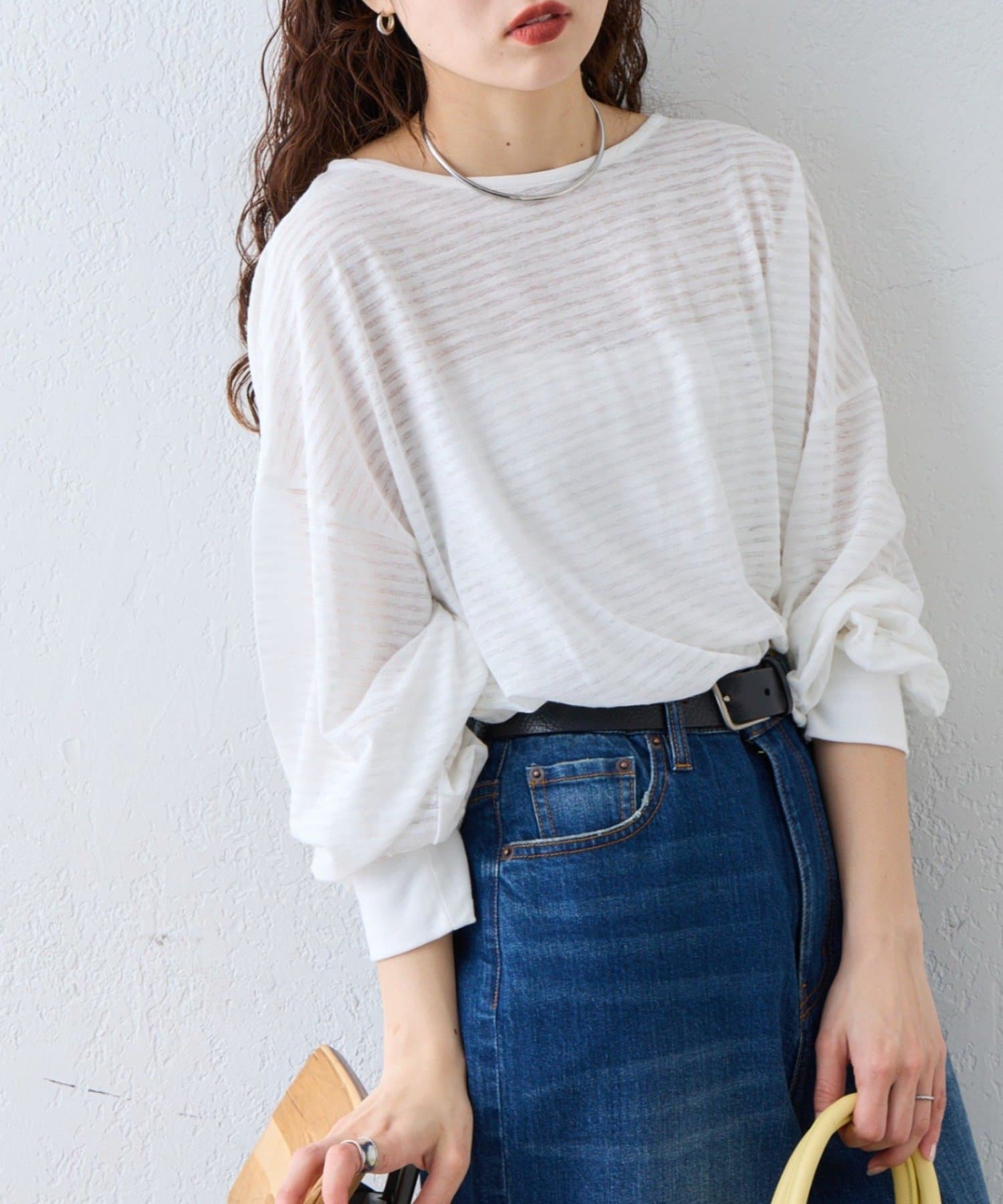 薄くシアーな生地が自然と肩に落ち感を演出し、ゆったりサイズながら華奢に演出。