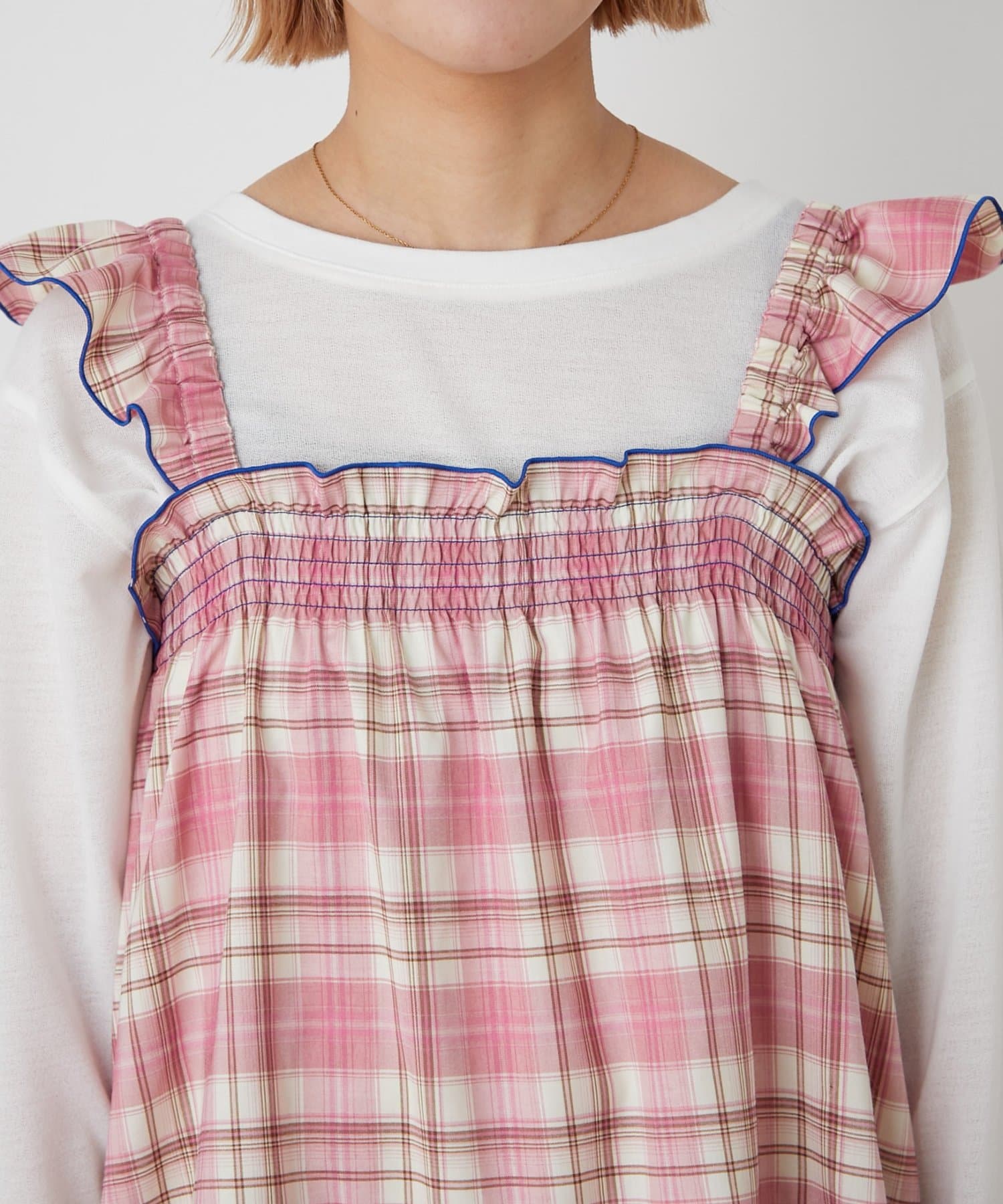 肩紐にもフリルを施し、より華やかな印象に。胸元はシャーリング仕様で、程よく体にフィットし、着心地も快適です。