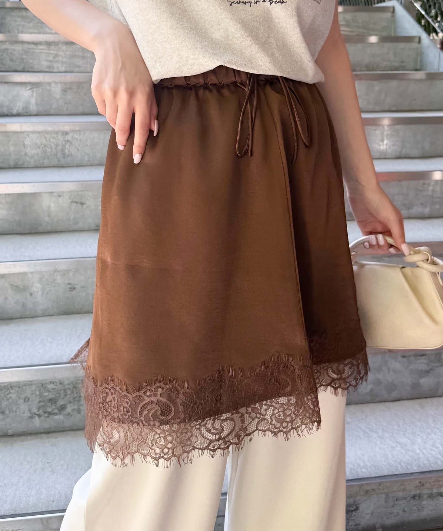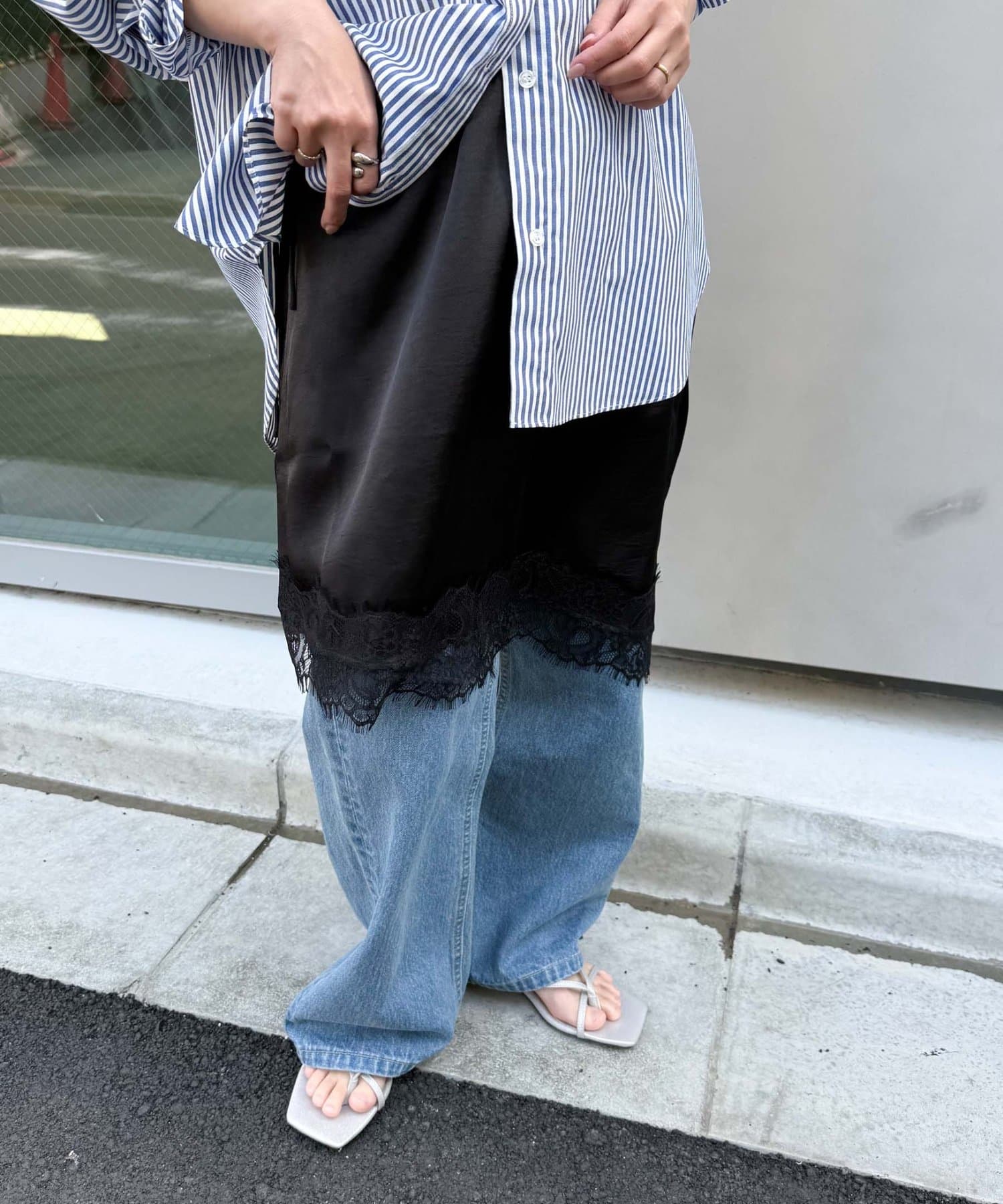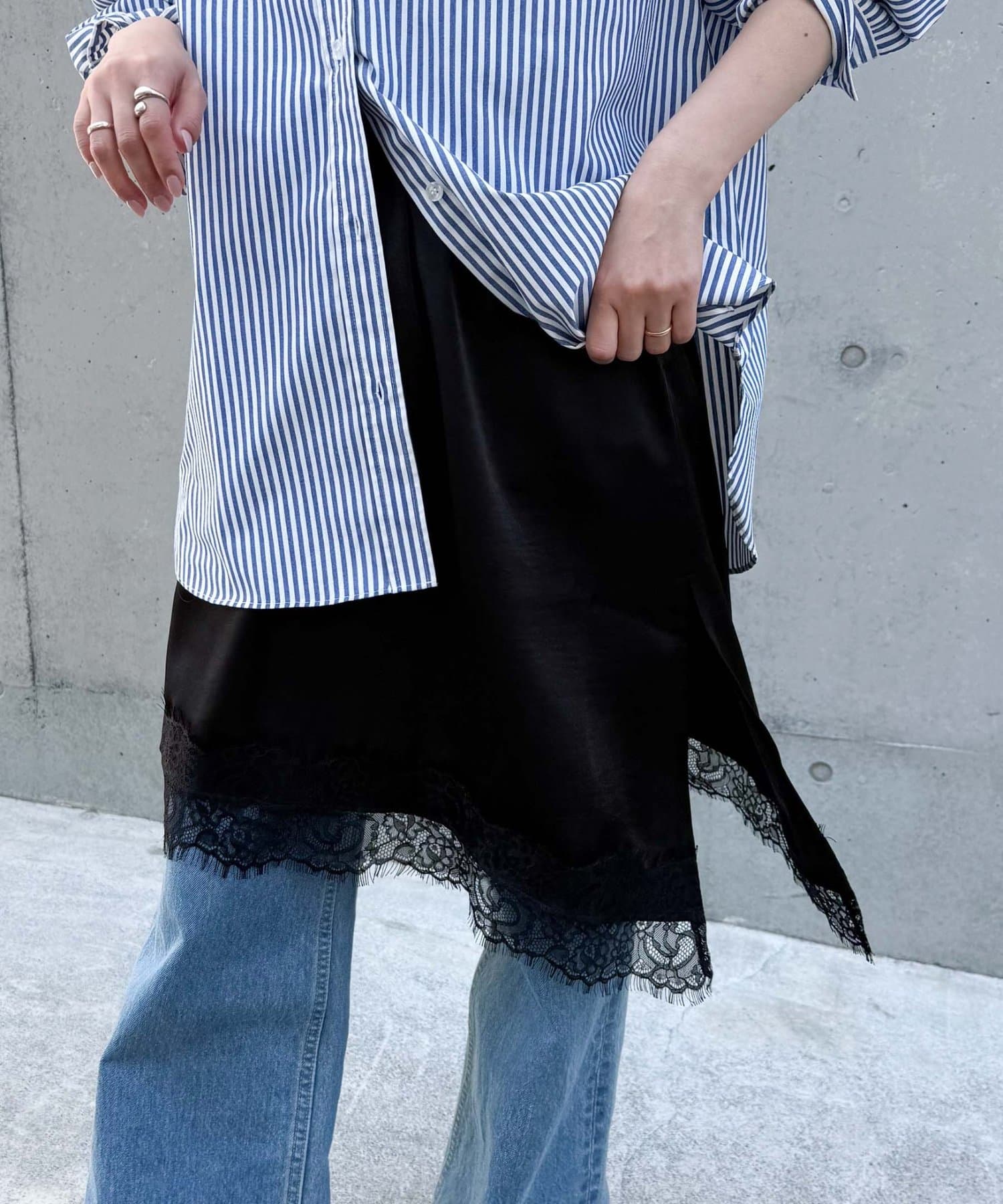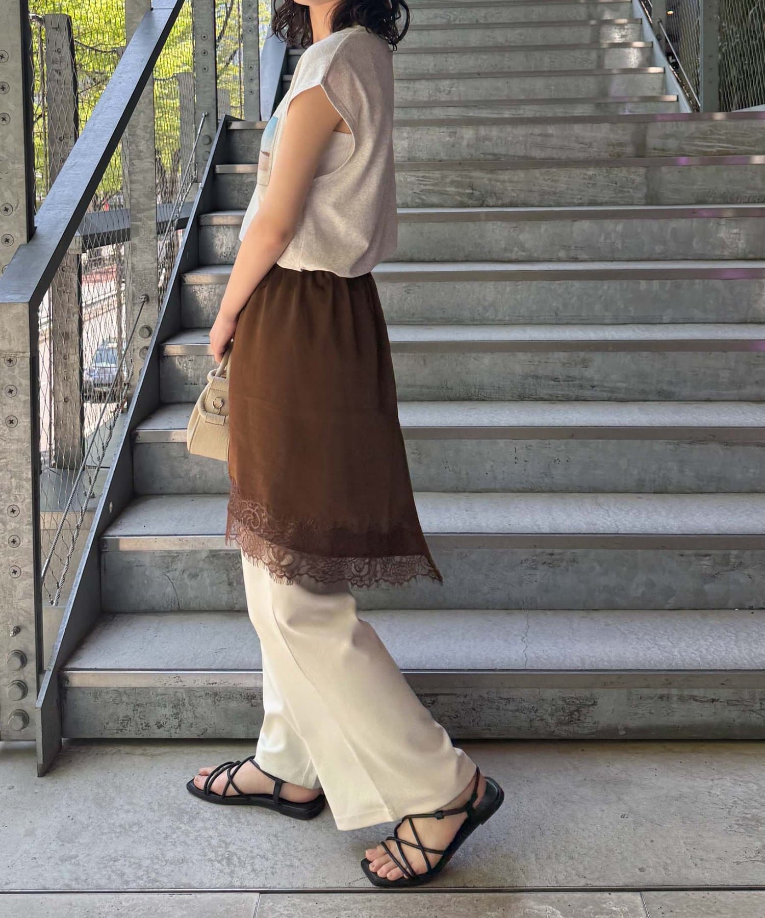 トレンドのレースは、裾のみにすることで甘くなりすぎず