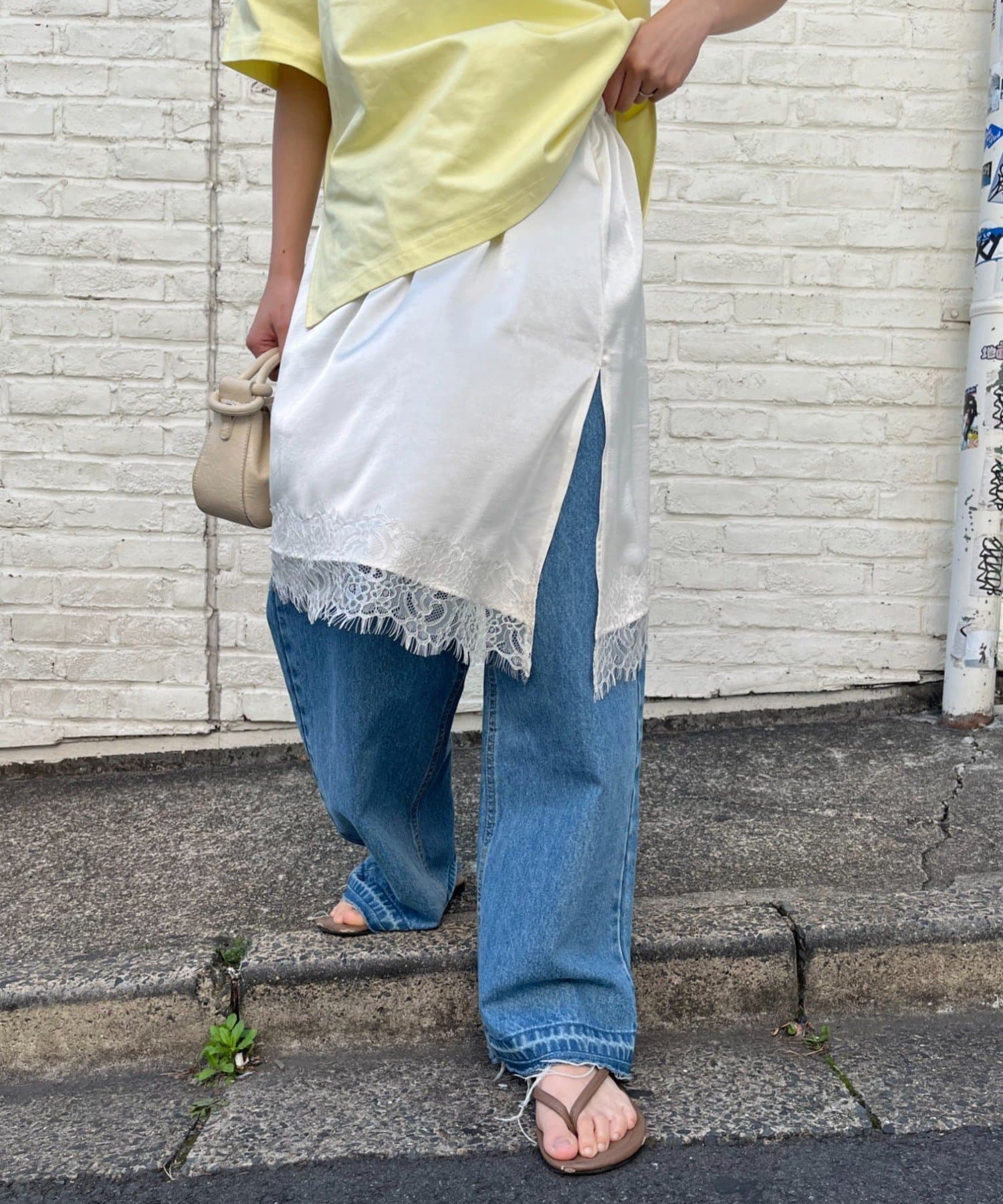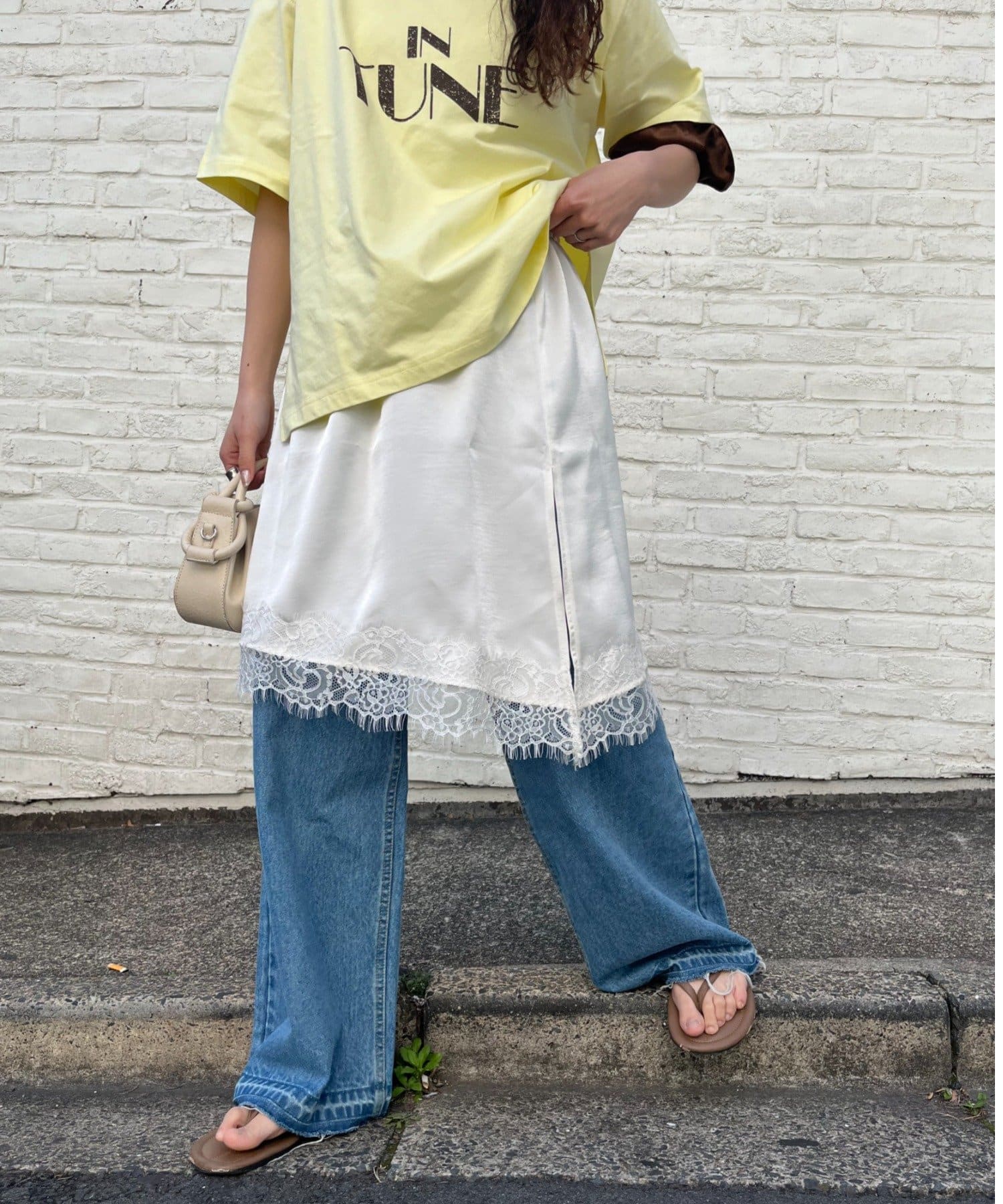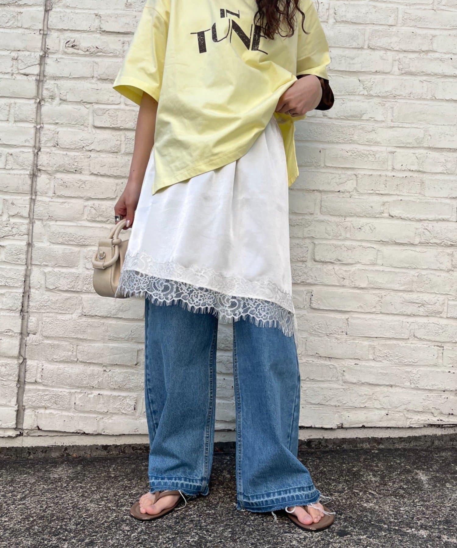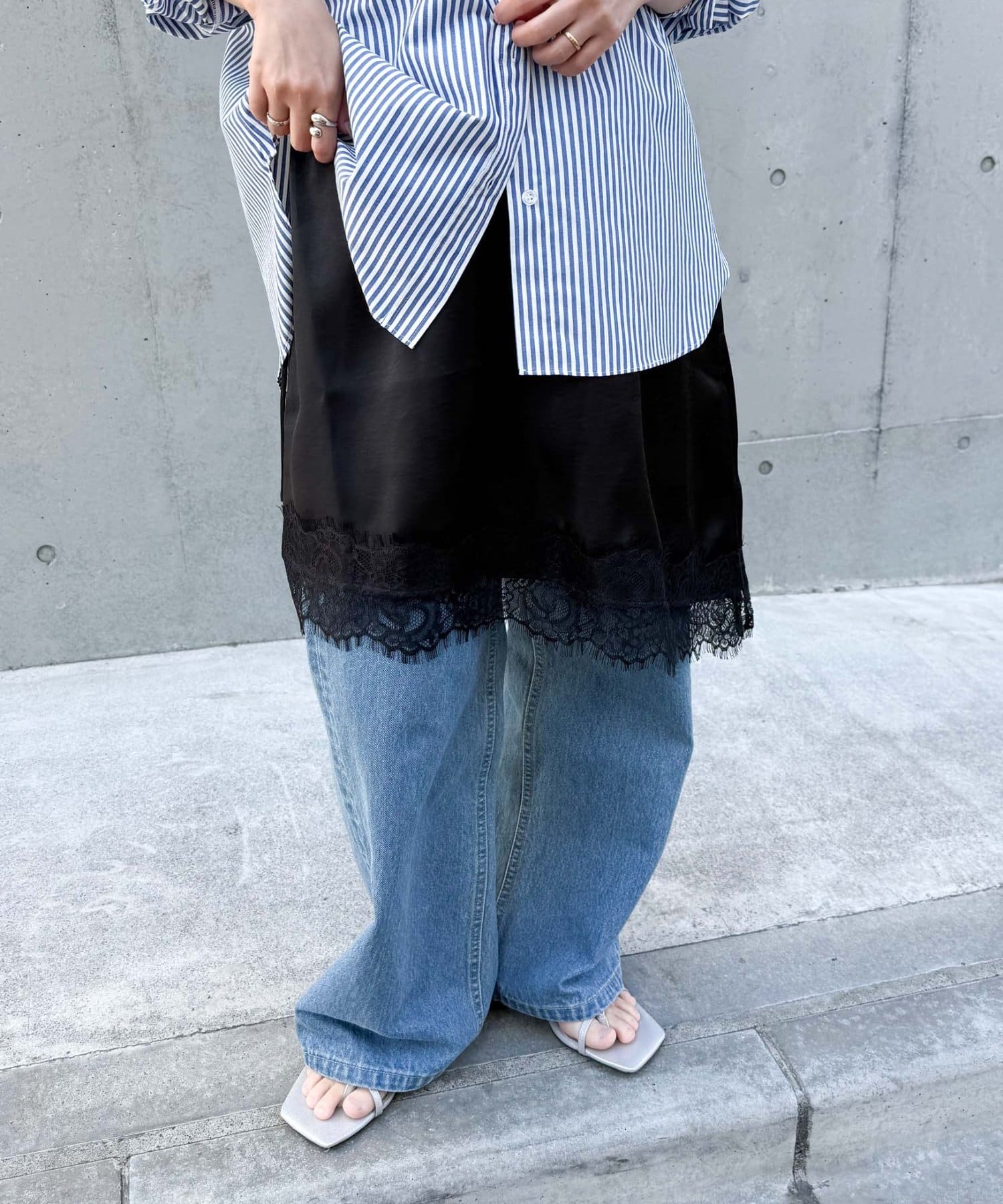 トレンドのレースは、裾のみにすることで甘くなりすぎず