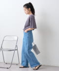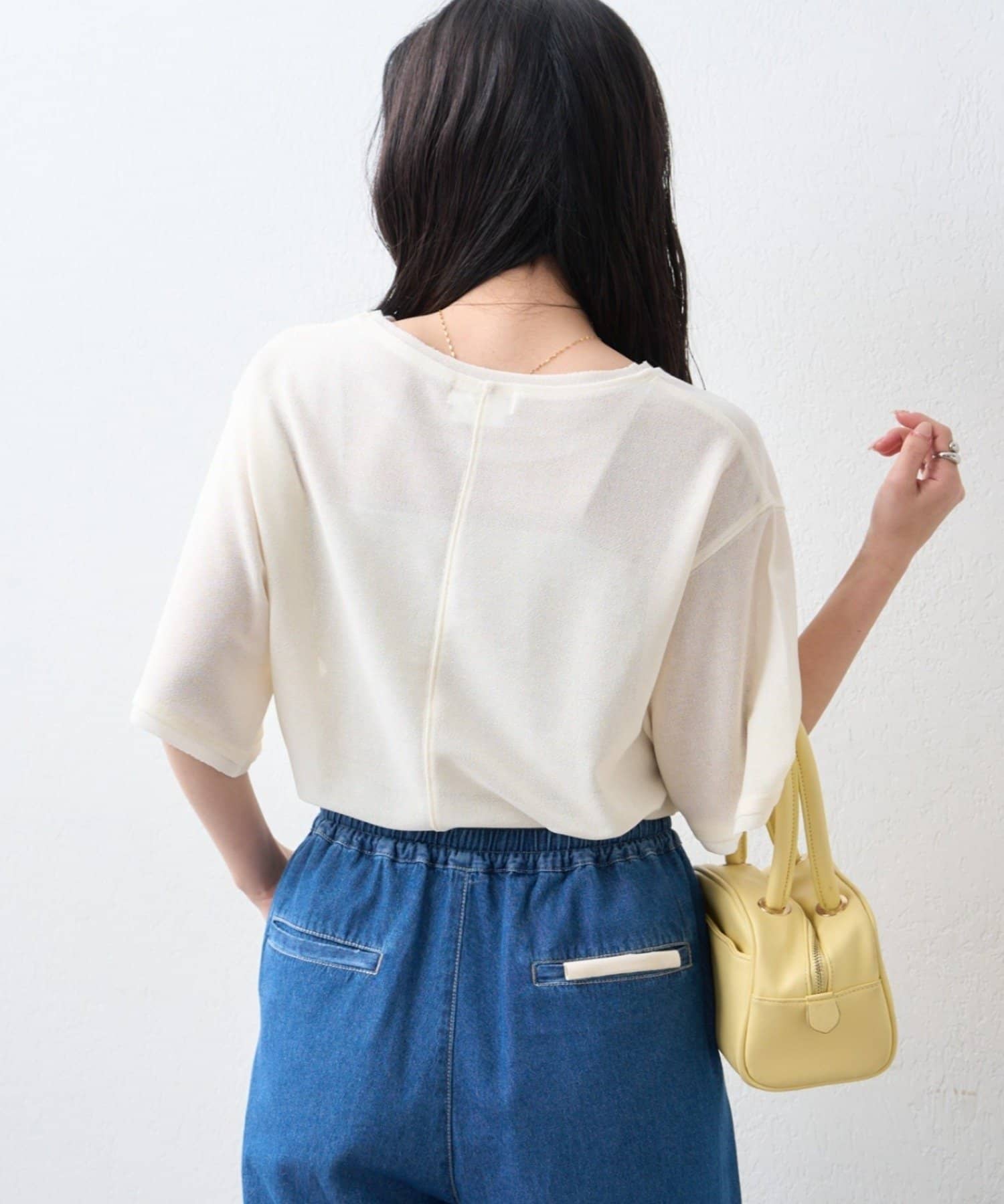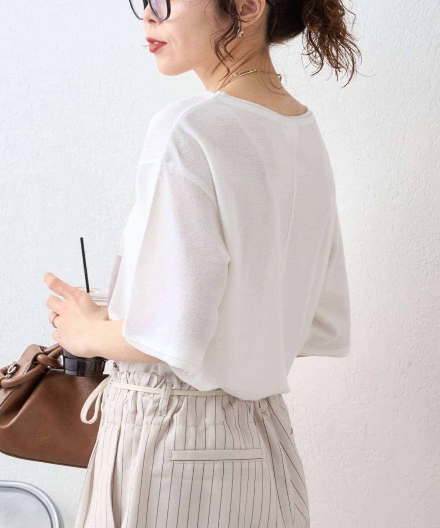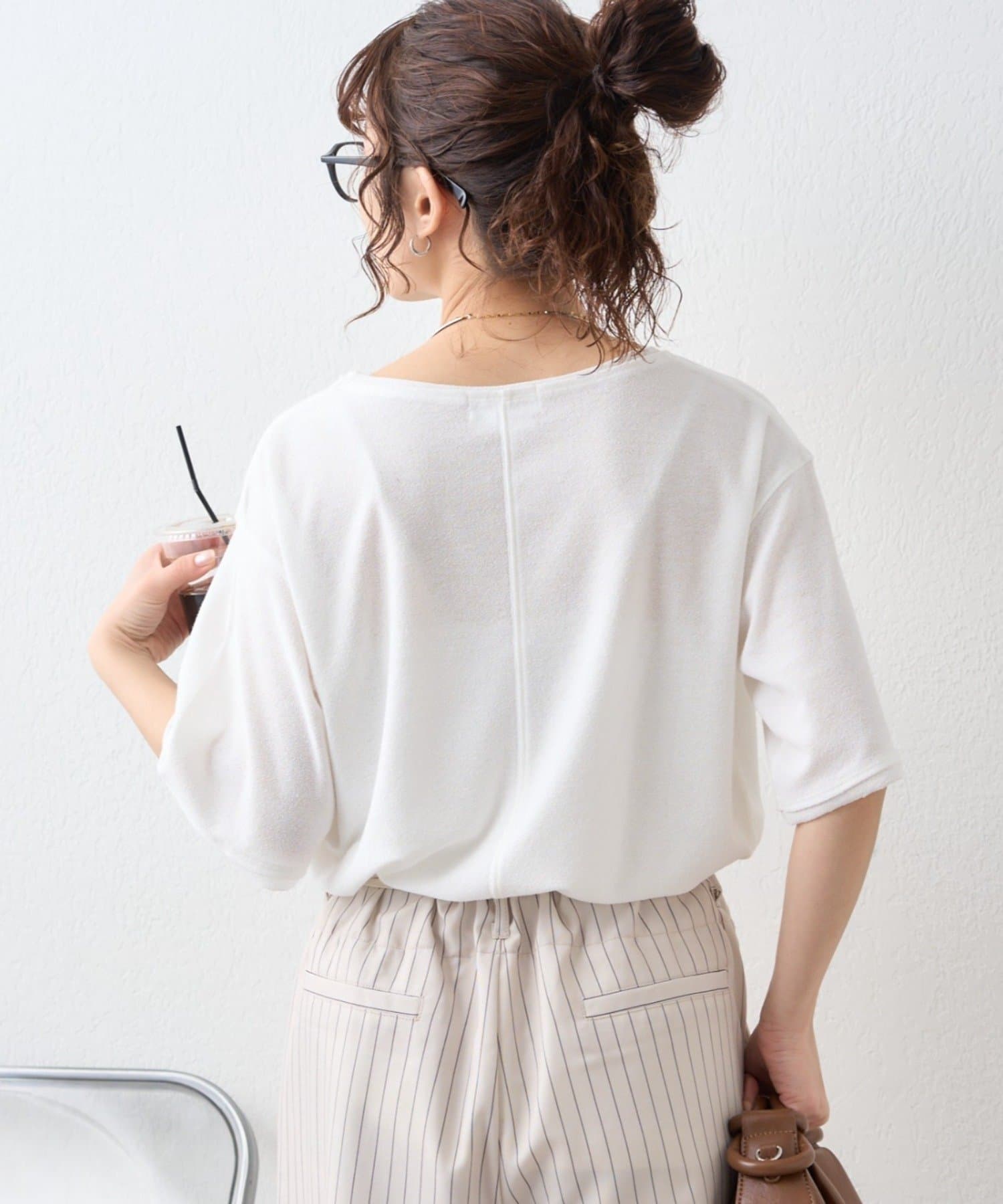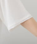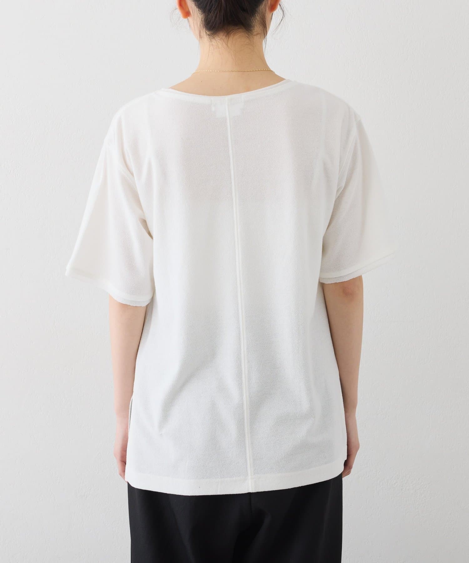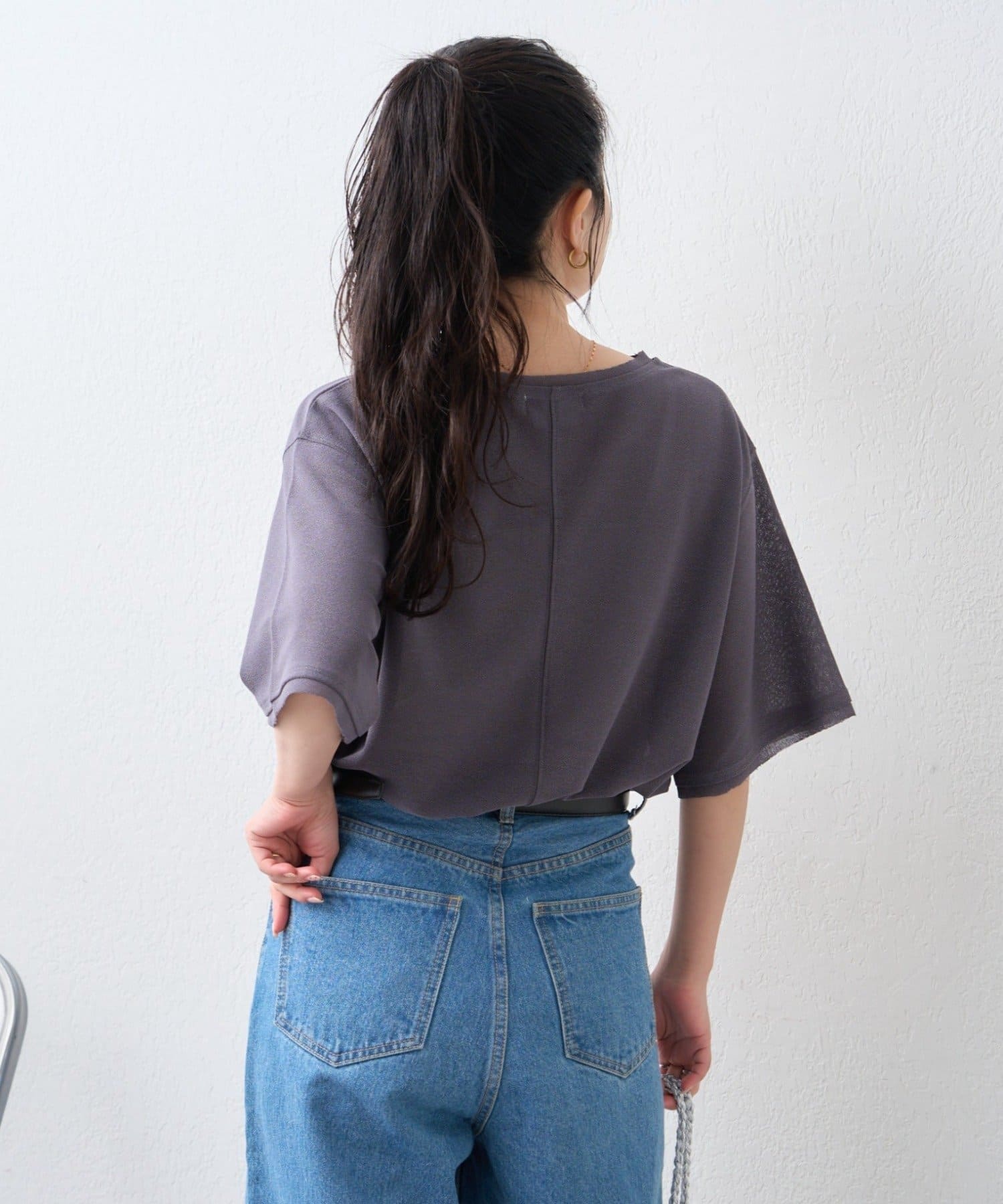 首元はやや広めのクルーネックに仕上げ、顔まわりもすっきり見せてくれます。