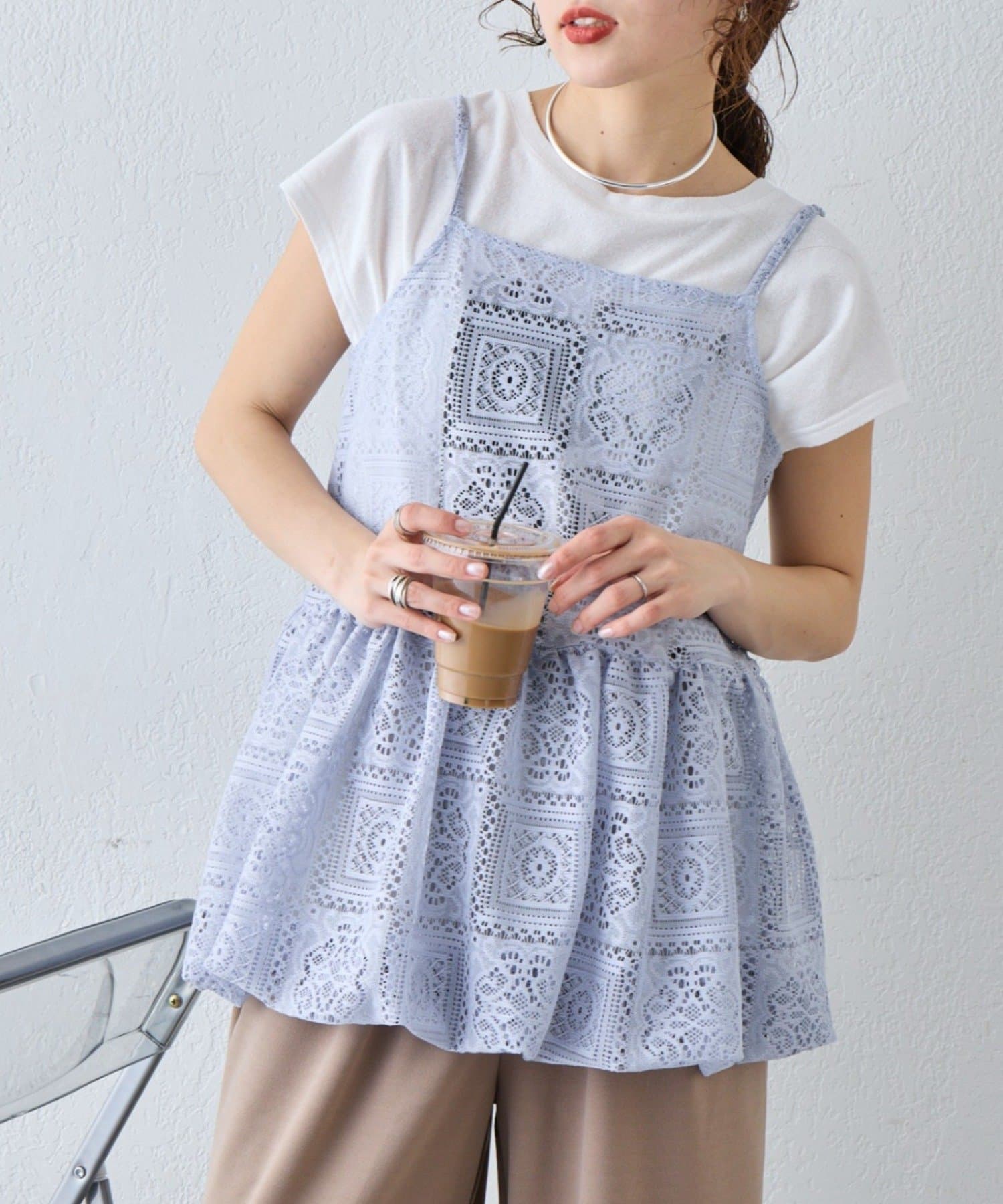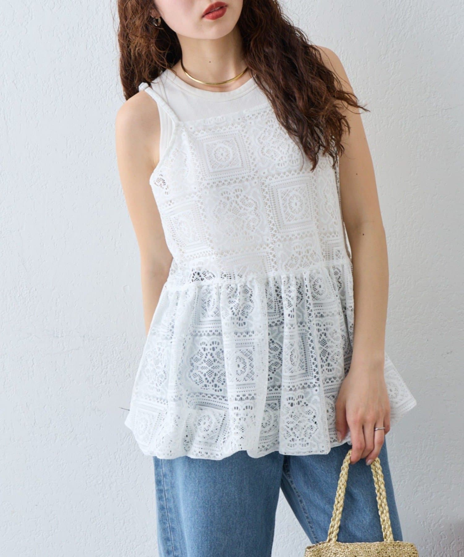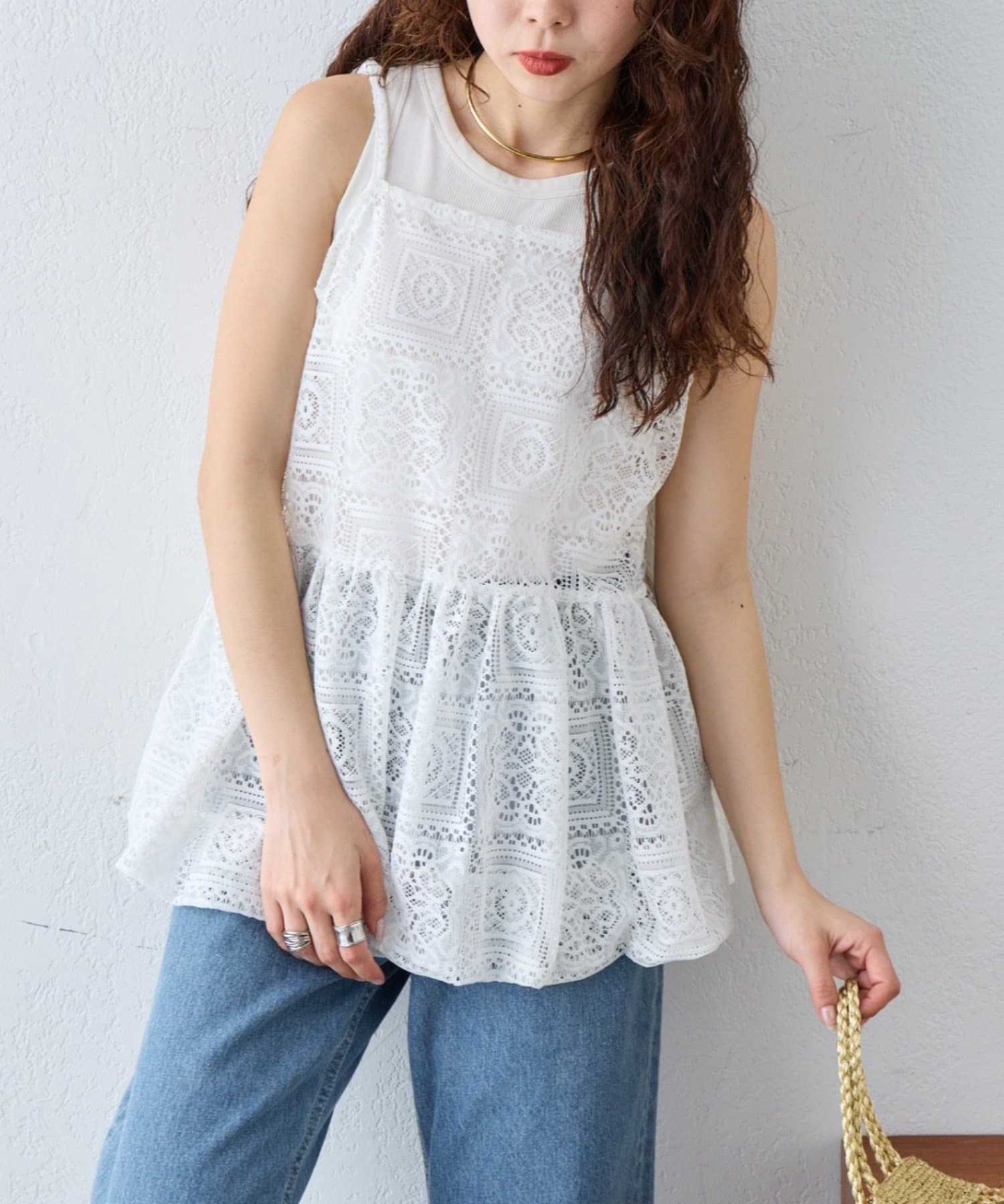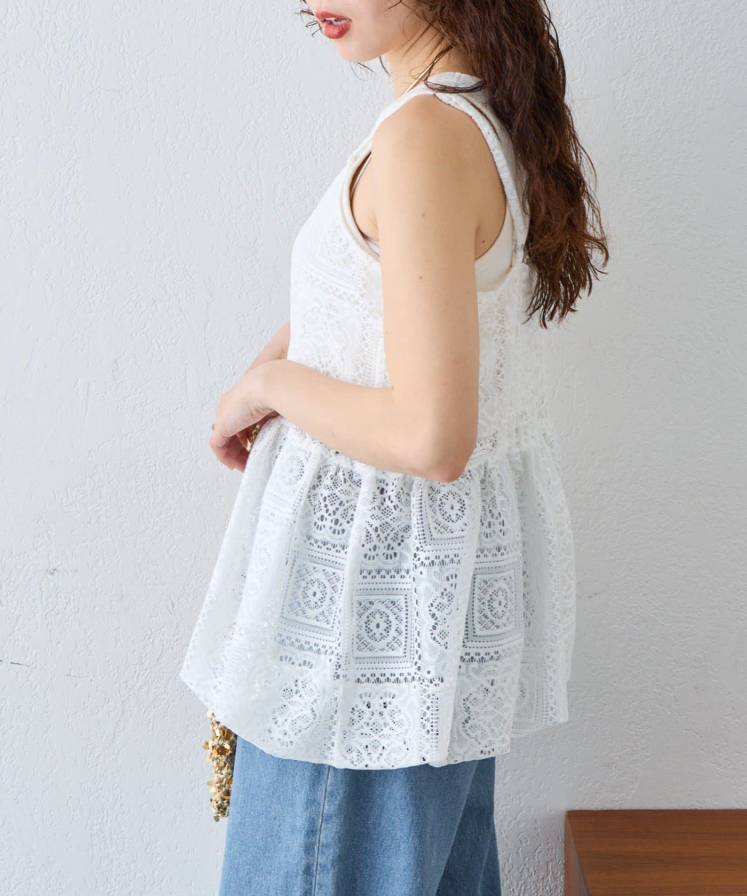 レースの透け感を活かして、Tシャツやタンクトップに重ねるだけでこなれたレイヤードスタイルが完成します。デニムやカーゴパンツと合わせると甘さを程よく抑えたカジュアルコーデに仕上がり、スカートと合わせればよりフェミニンな印象に。肌寒い時期はロンTやニットと合わせることでロングシーズン楽しめます。インナー次第で雰囲気を変えられるのも魅力です。