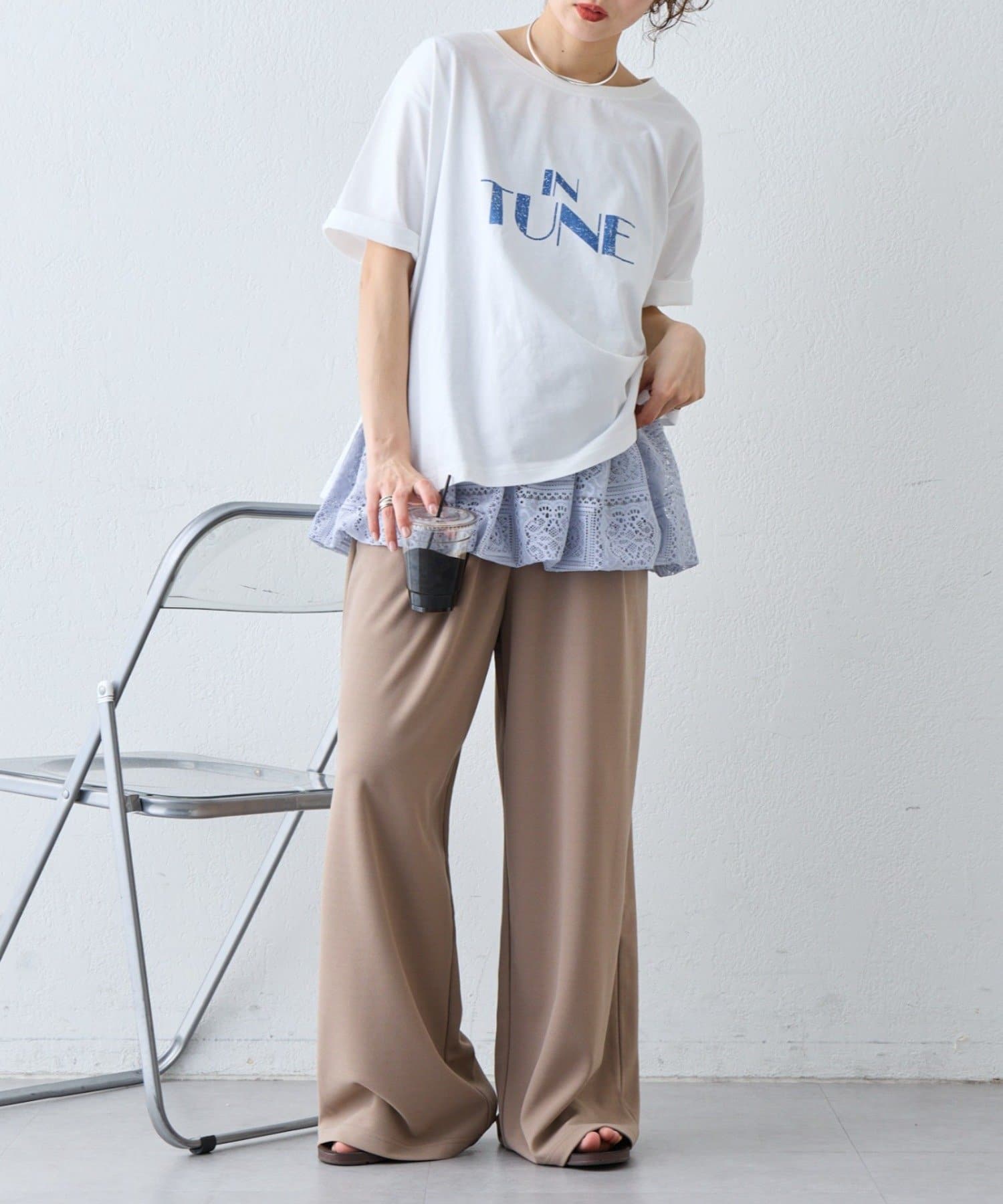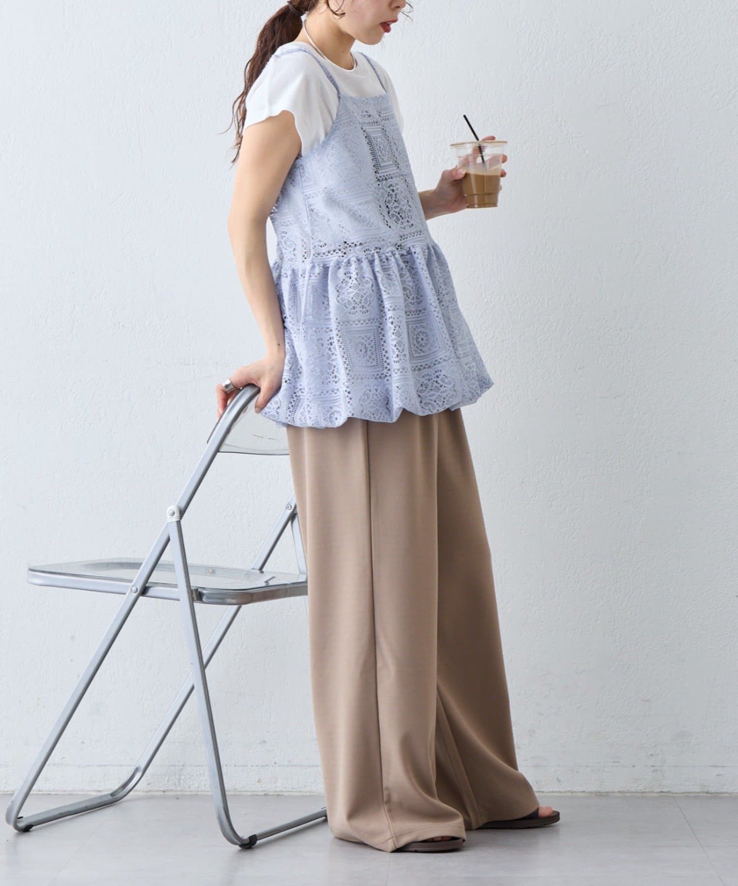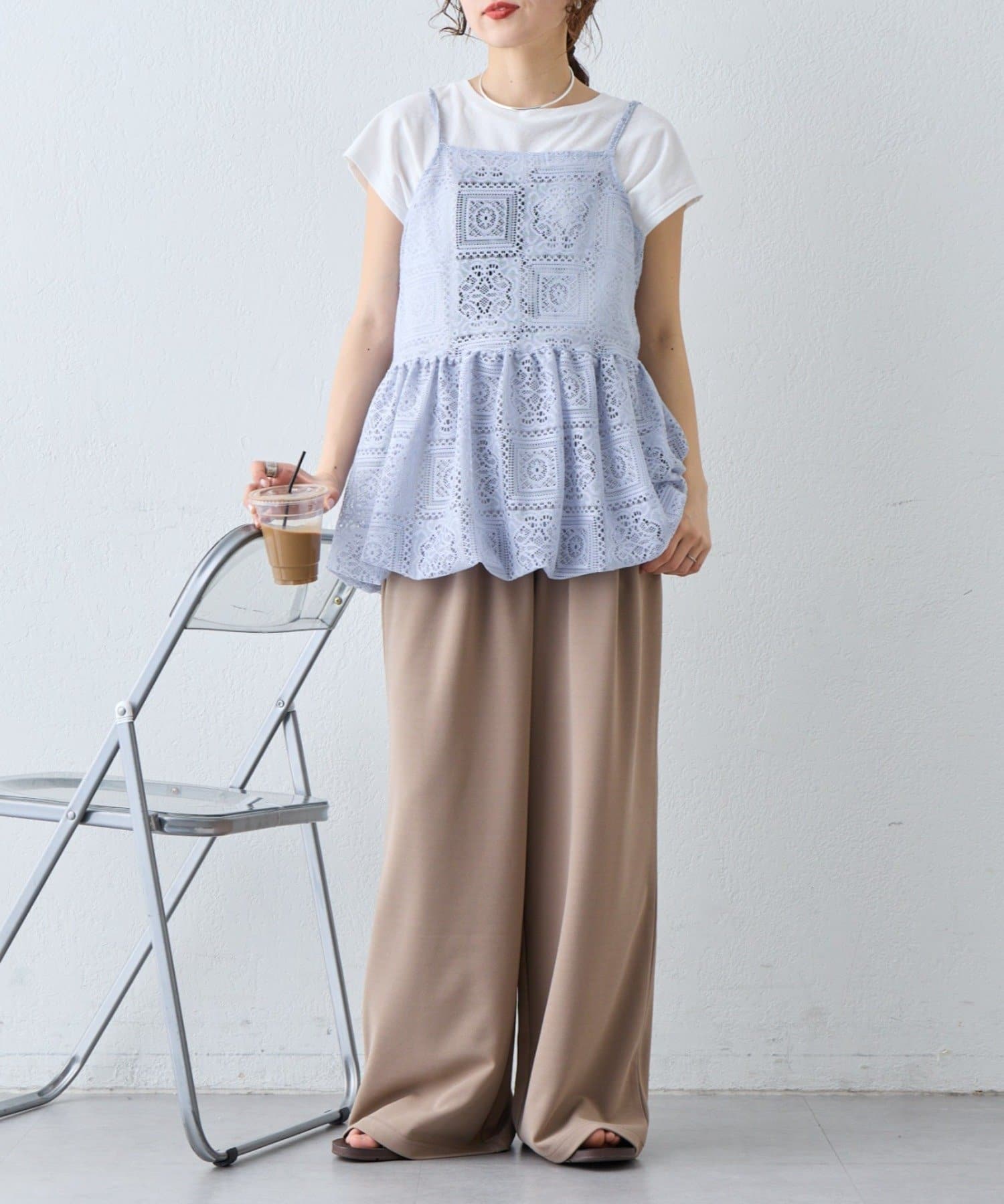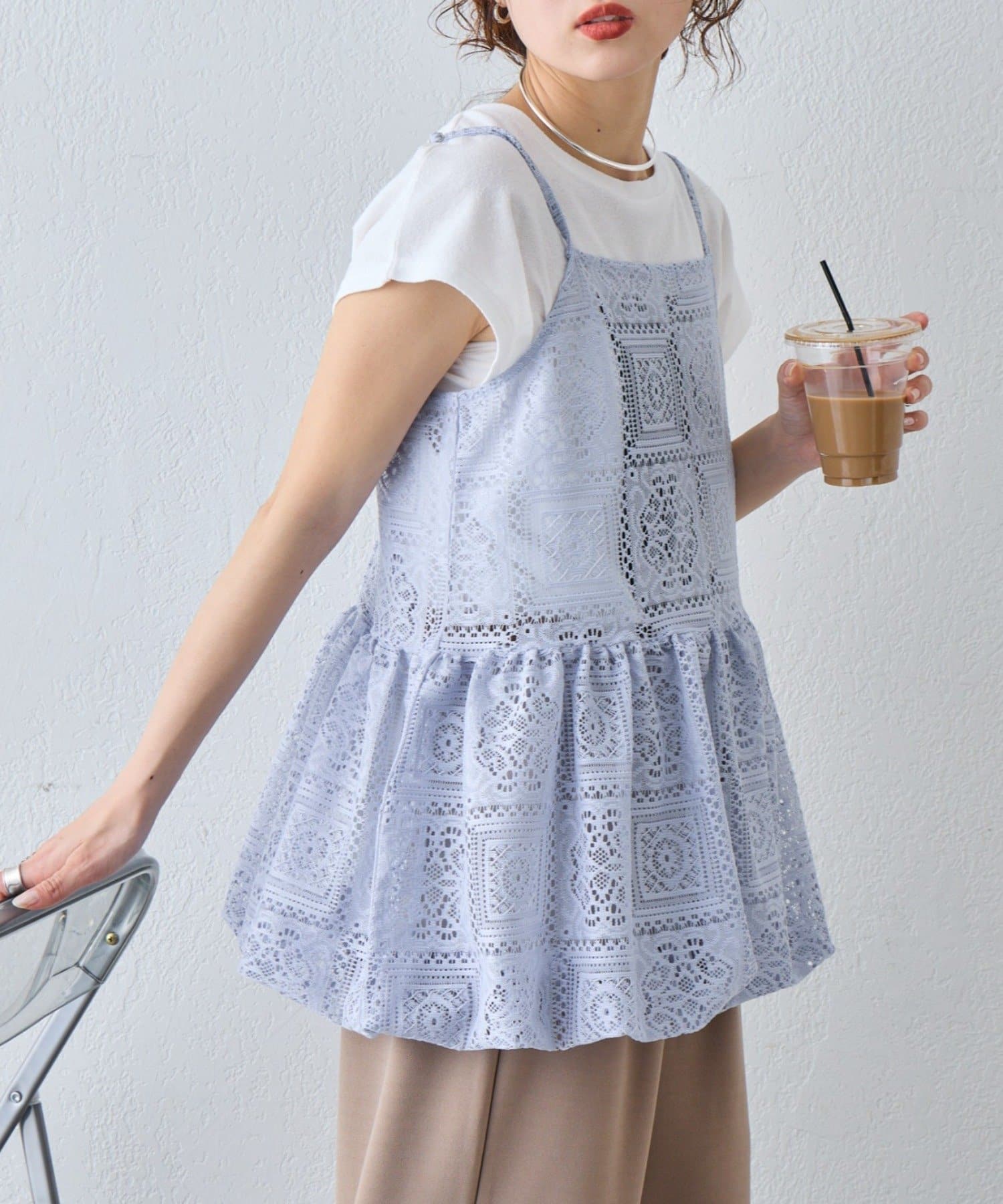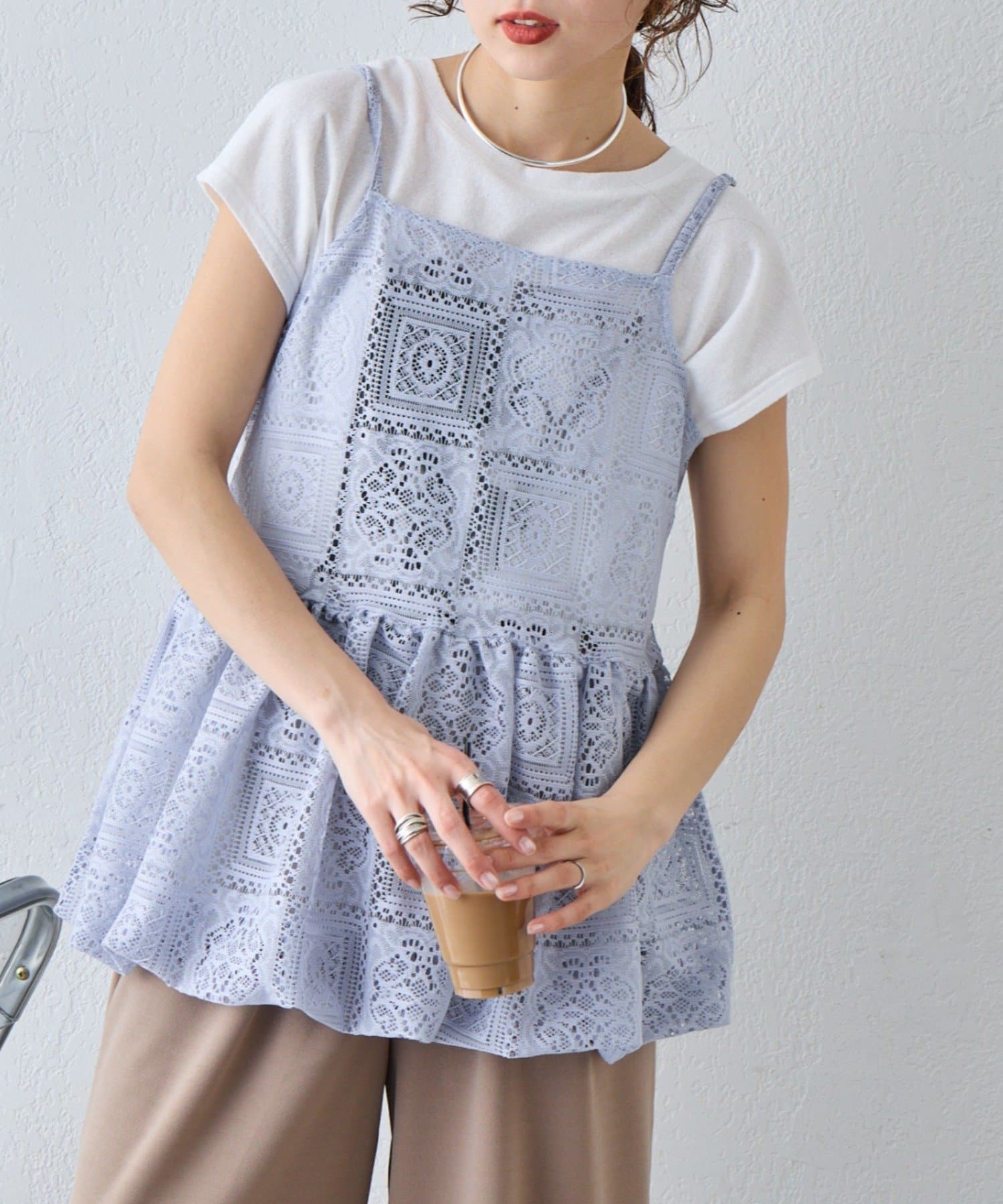 レースの透け感を活かして、Tシャツやタンクトップに重ねるだけでこなれたレイヤードスタイルが完成します。デニムやカーゴパンツと合わせると甘さを程よく抑えたカジュアルコーデに仕上がり、スカートと合わせればよりフェミニンな印象に。肌寒い時期はロンTやニットと合わせることでロングシーズン楽しめます。インナー次第で雰囲気を変えられるのも魅力です。