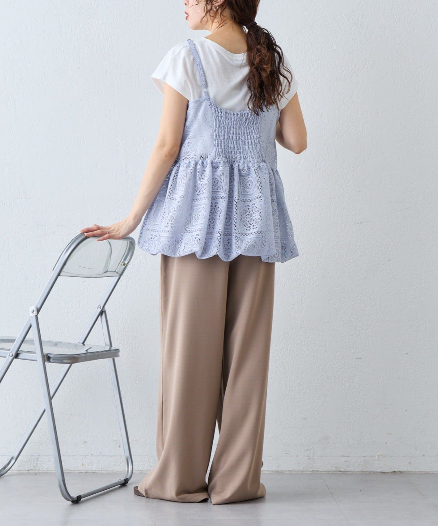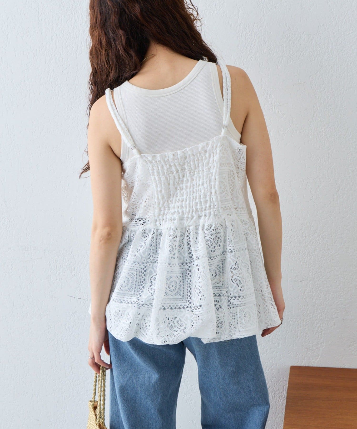 レースの透け感と背中のギャザーで重ねる服を選ばないレイヤードアイテム!