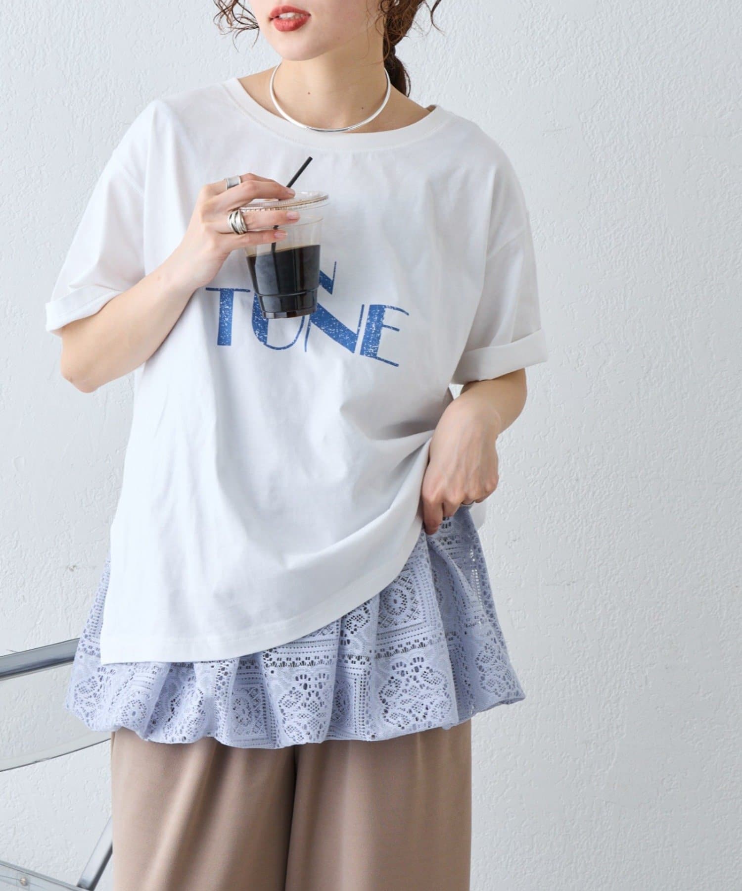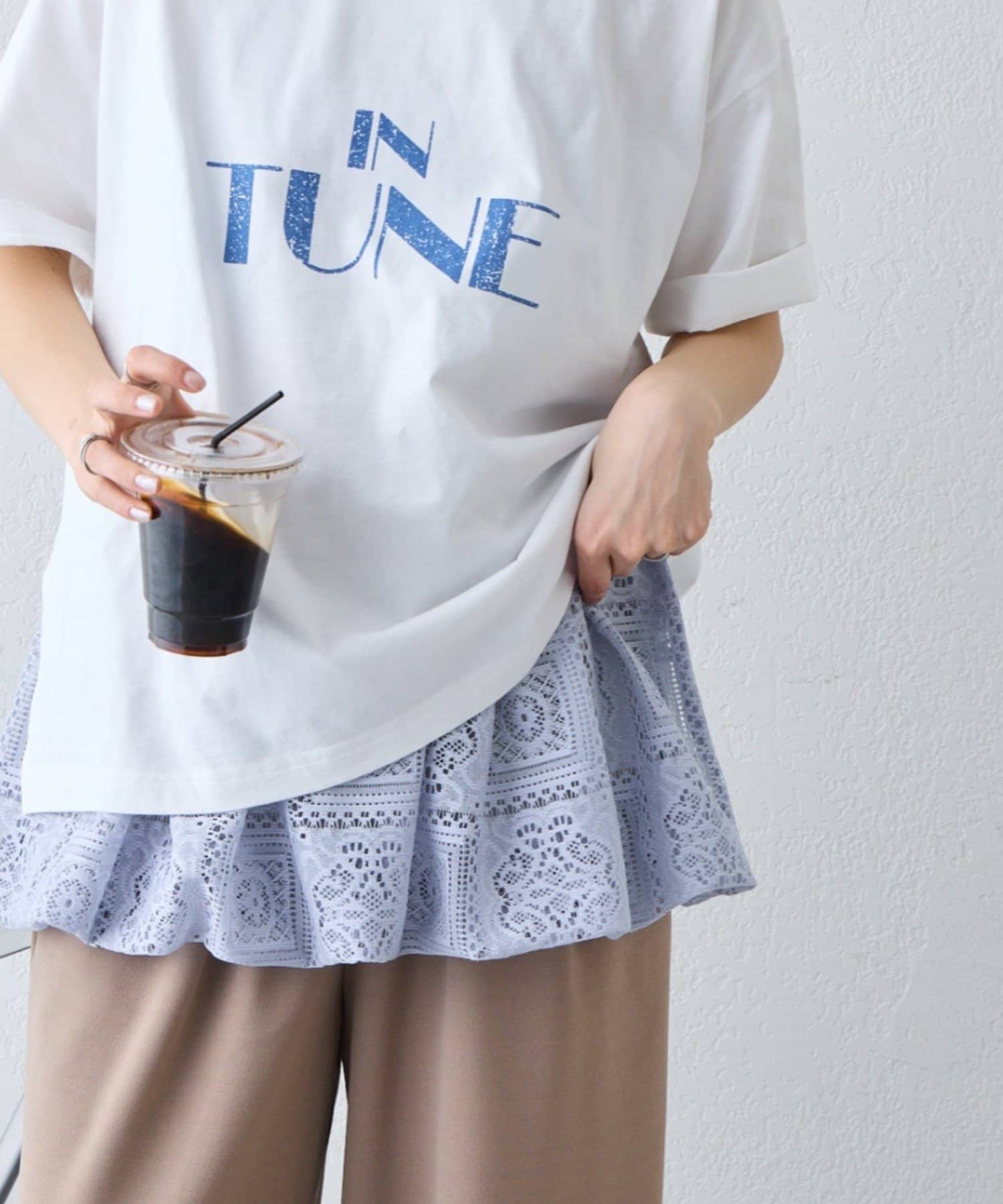 パッチワーク風のレースにすることで、無地トップスと重ねても自然とお洒落に。