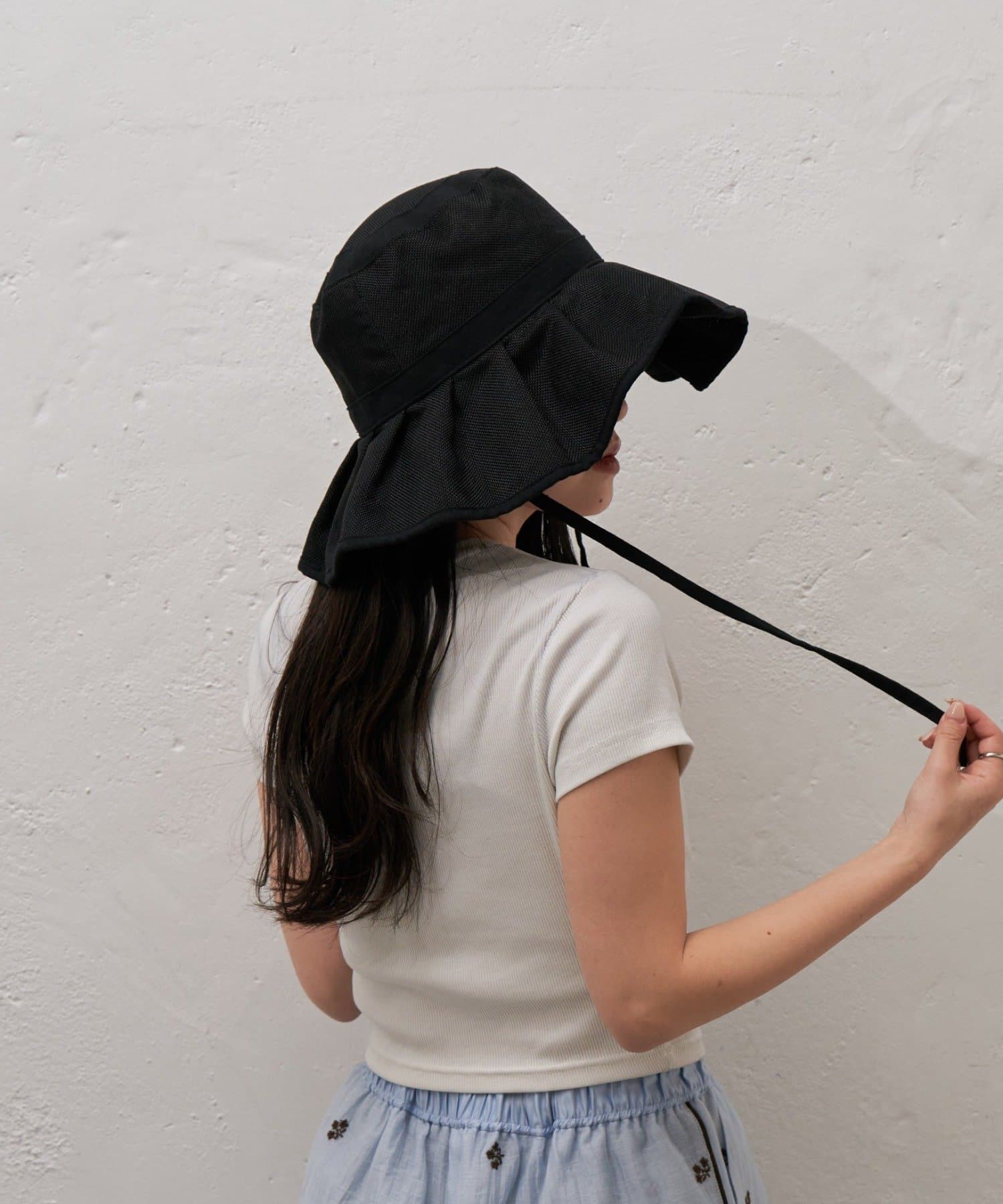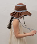 紐はそのまま垂らしたり、あご下でキュッと結んだりと違う雰囲気で楽しむことが出来ます♪