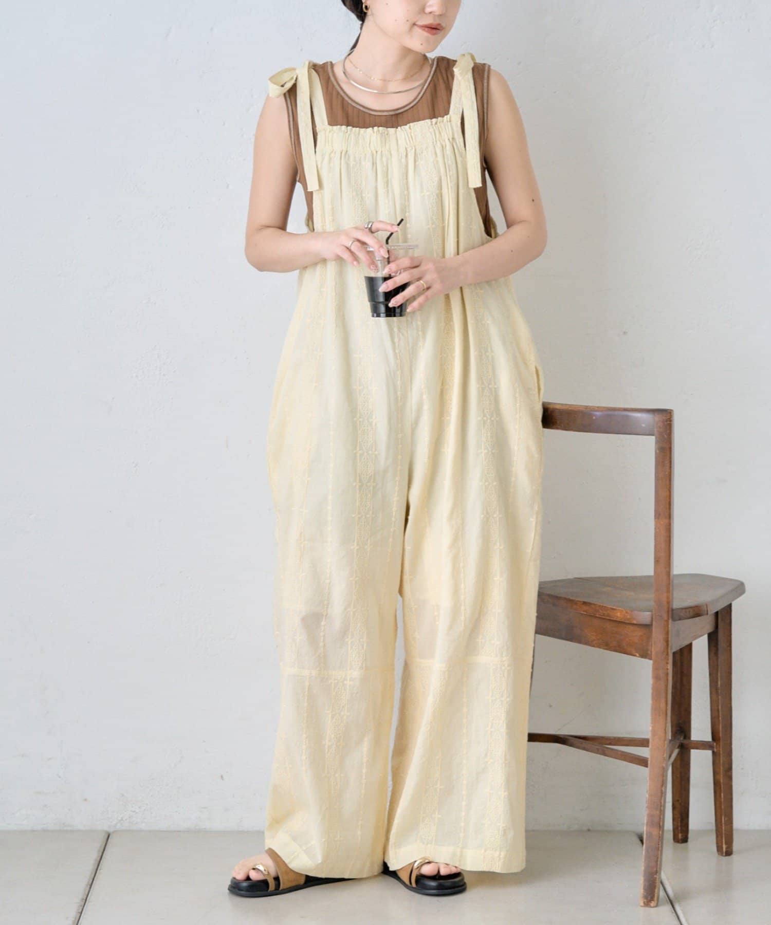 シアートップスやブラウス、ノースリーブを合わせた女性らしいスタイリングもオススメ。