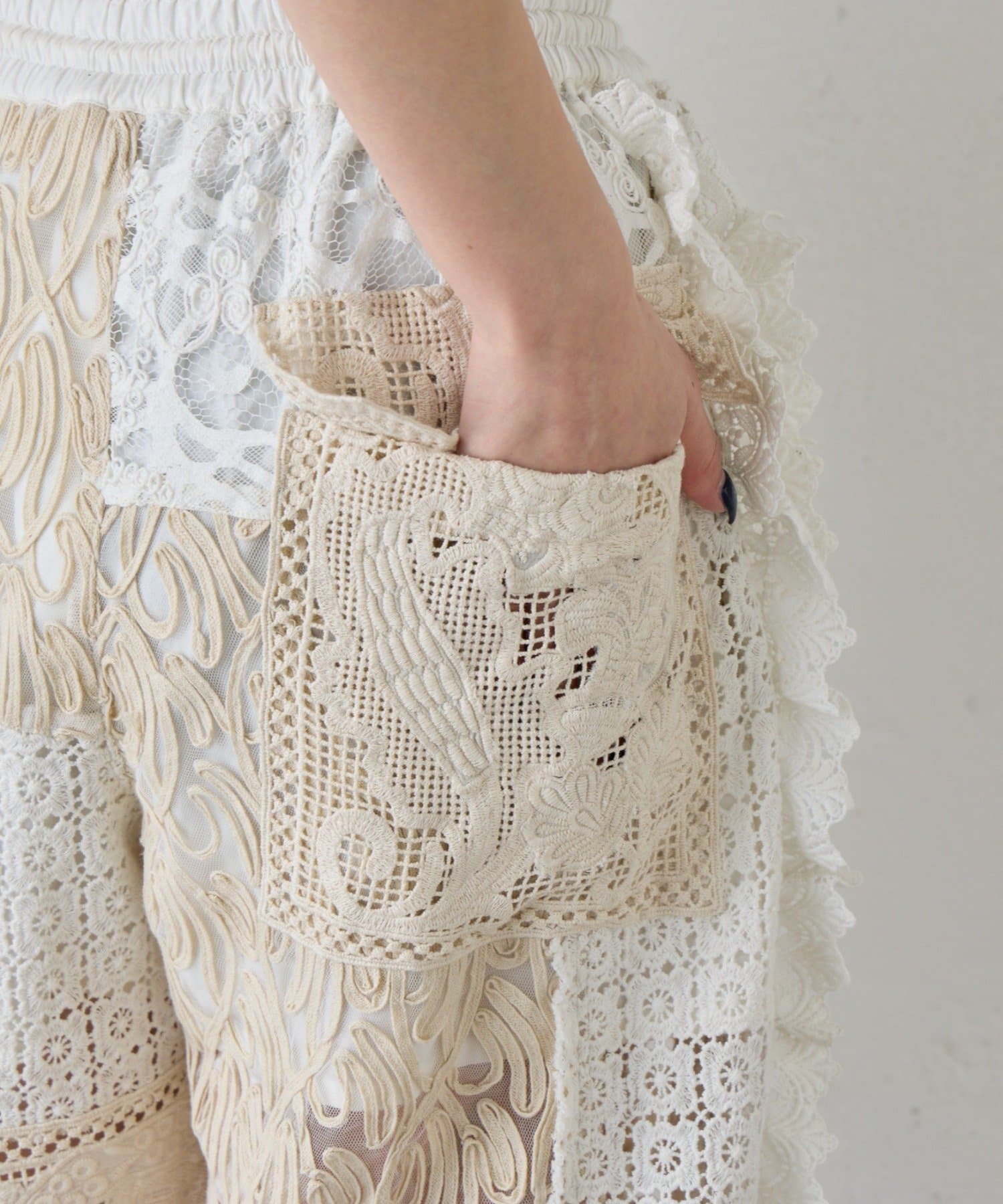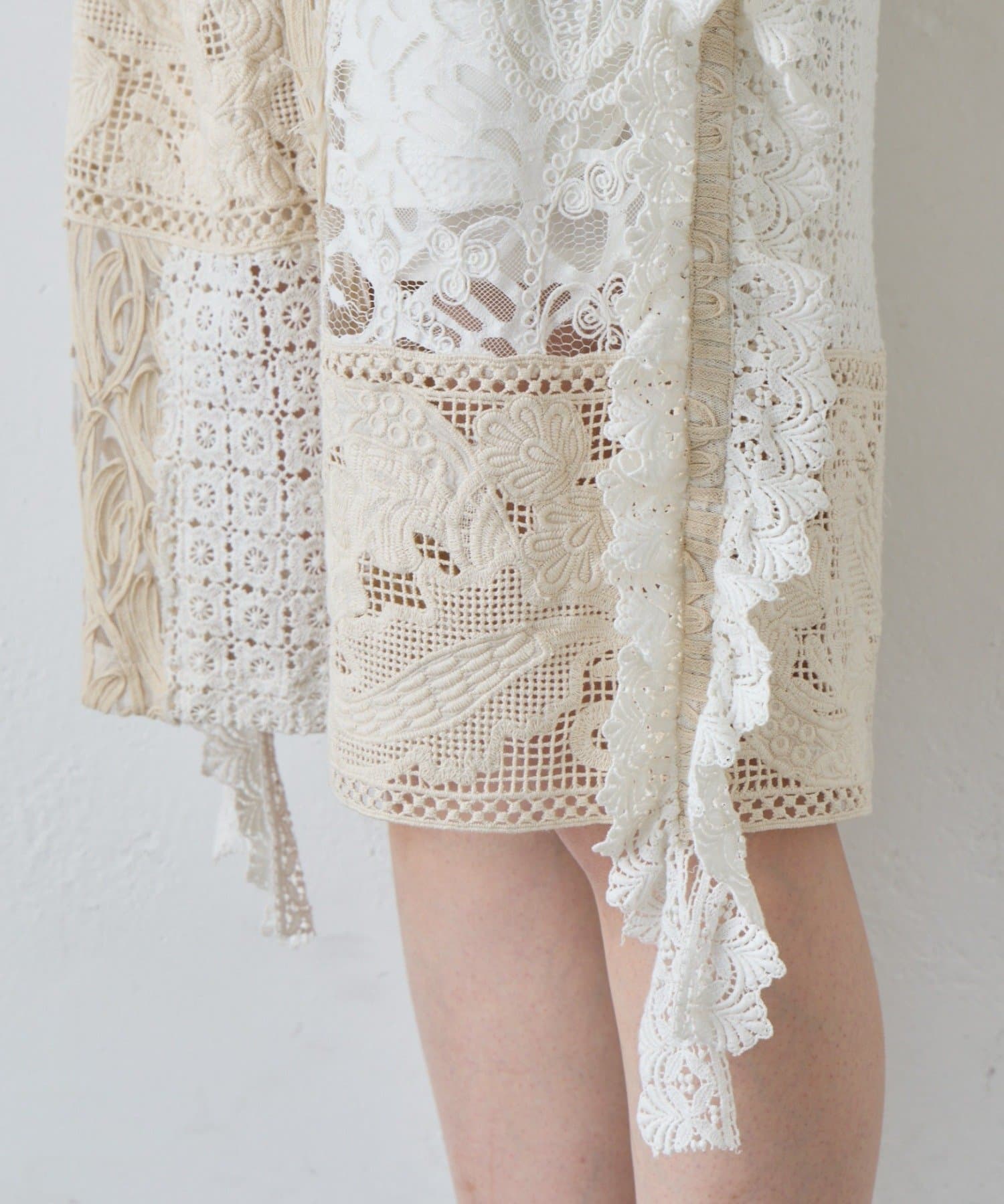 異なるレースパターンを組み合わせることで、奥行きのある表情を生み出しています。