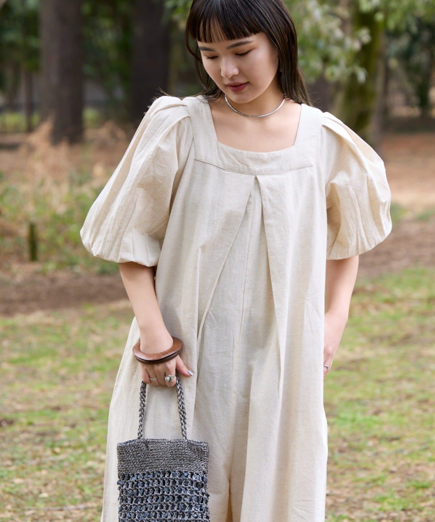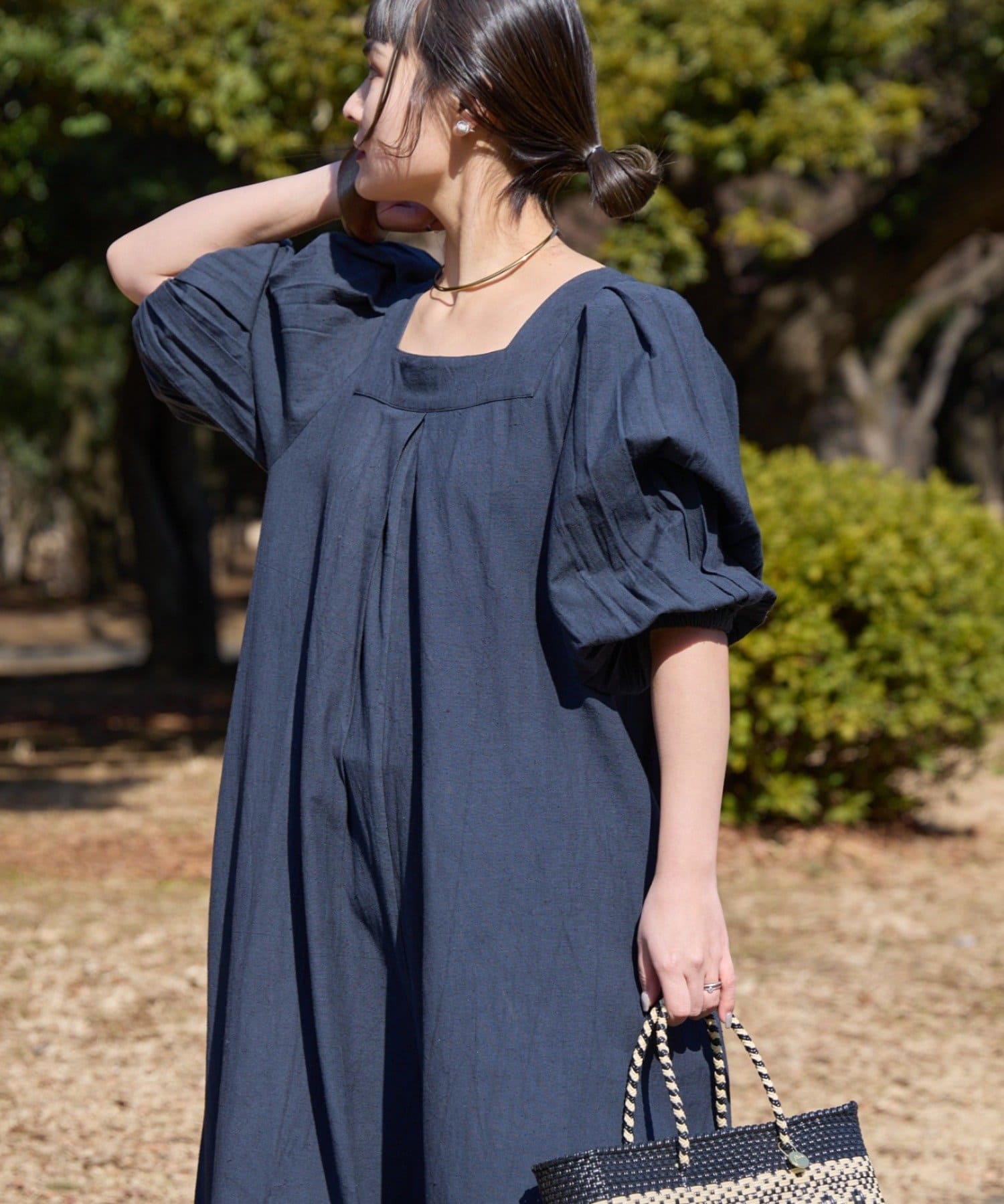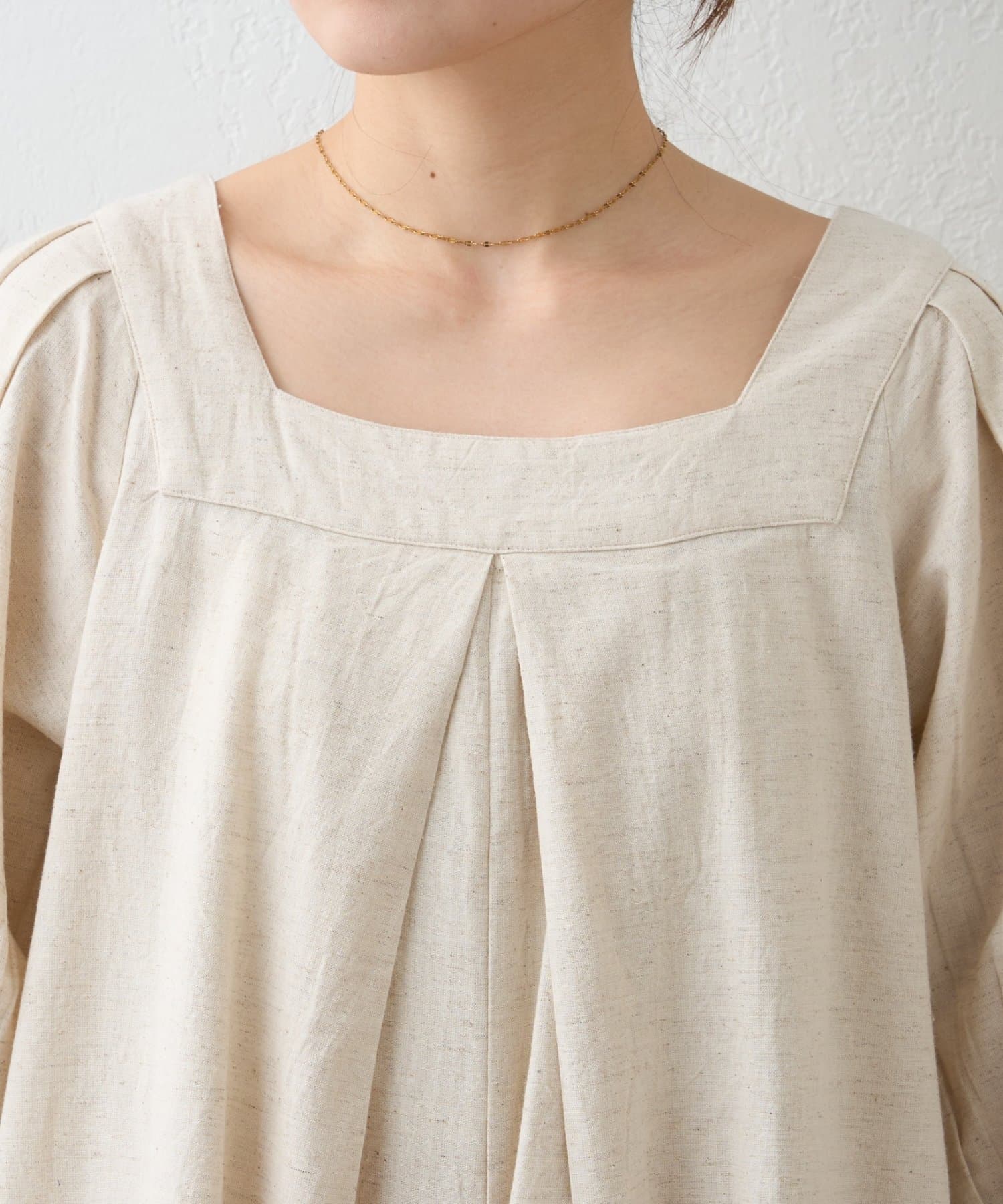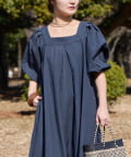 スクエアですっきりさせたデコルテやふわっとした袖が女性らしい印象に。