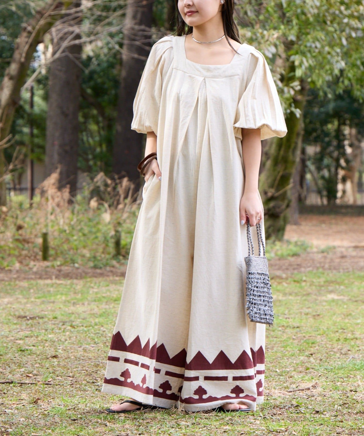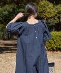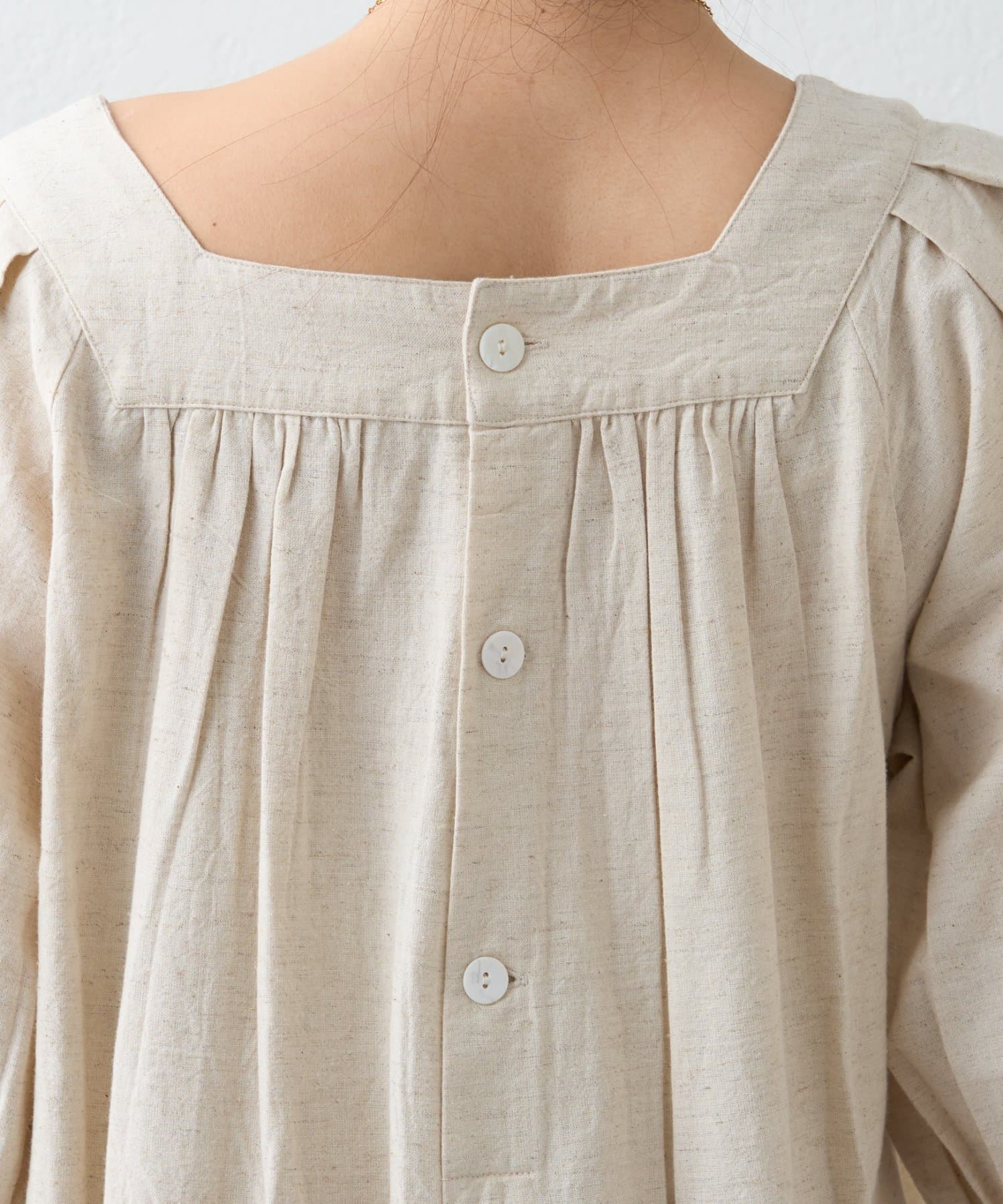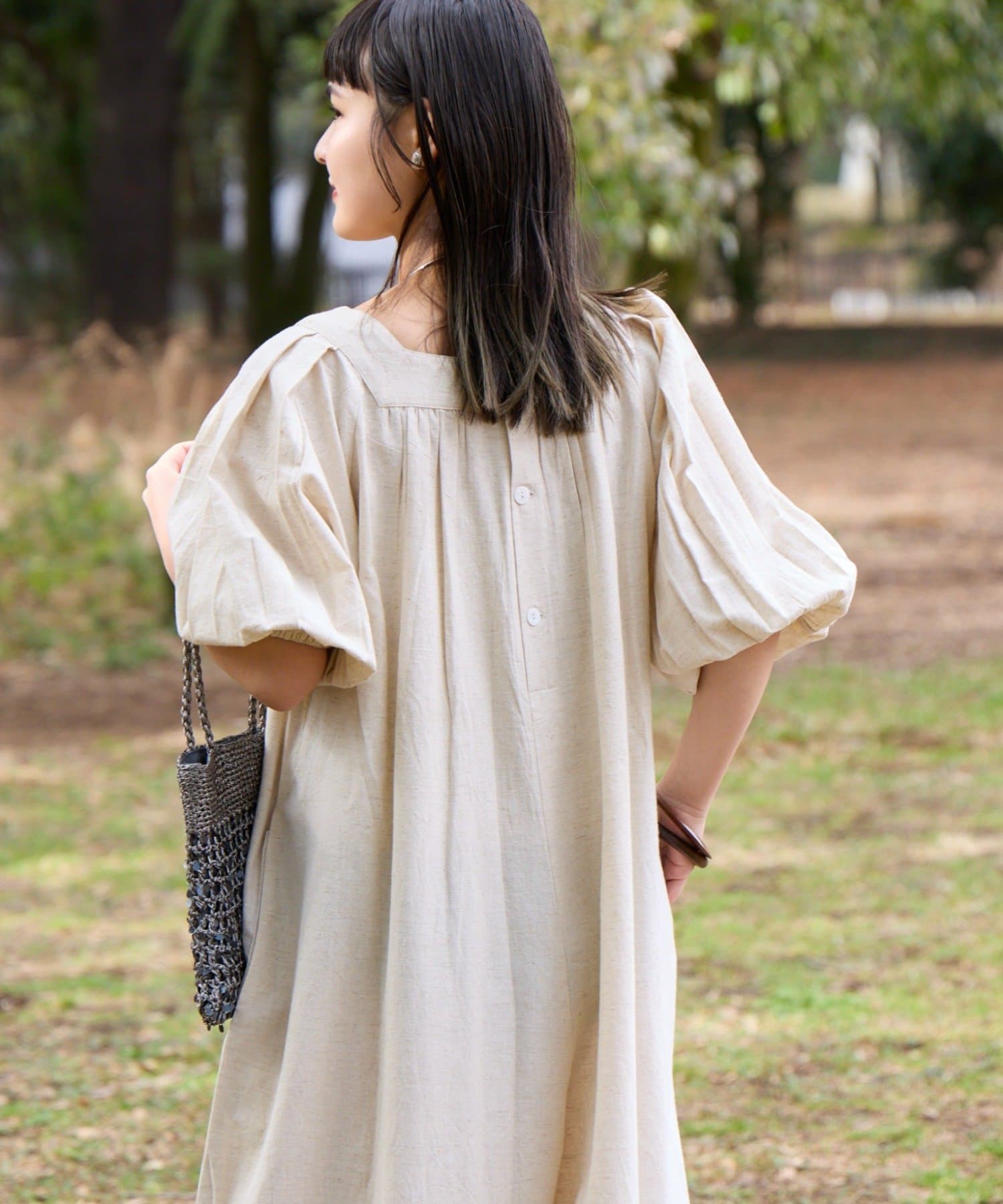 スクエアですっきりさせたデコルテやふわっとした袖が女性らしい印象に。