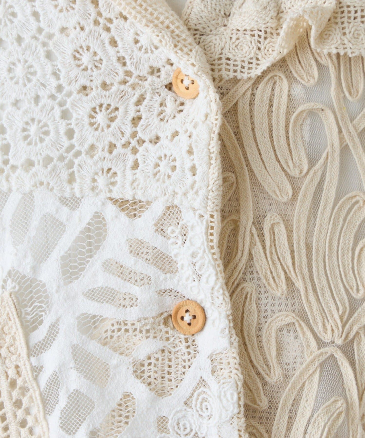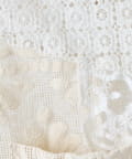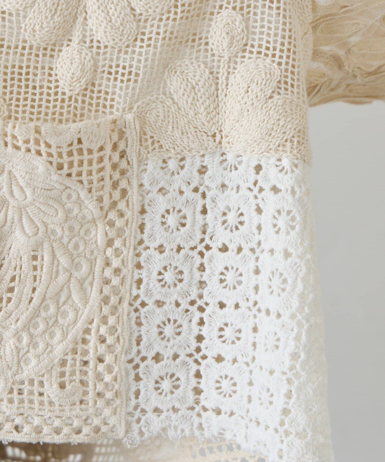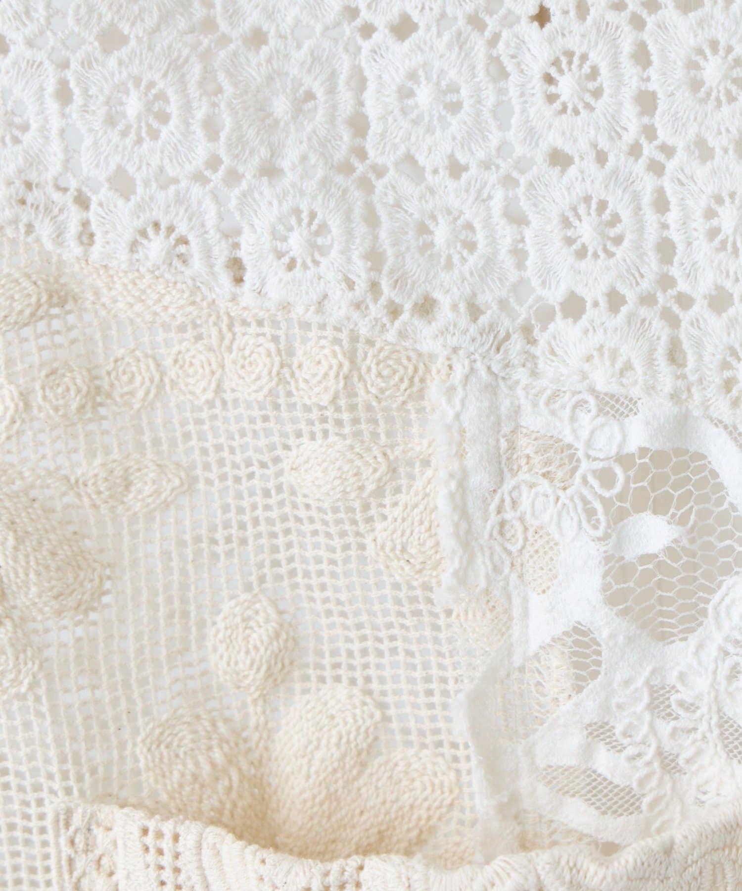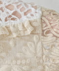 繊細なレースを贅沢に使用した、パッチワーク風の個性的なデザイン。異なる柄のレースを組み合わせることで、奥行きのある表情豊かな仕上がりになっています。