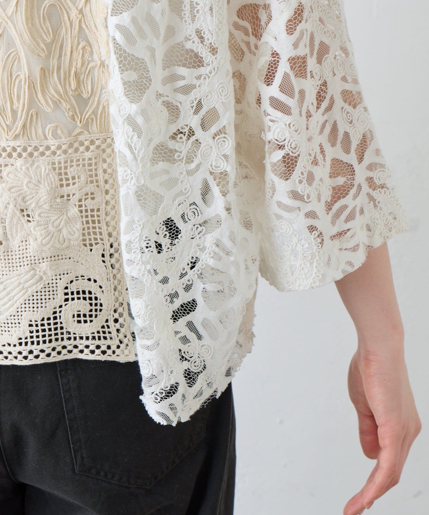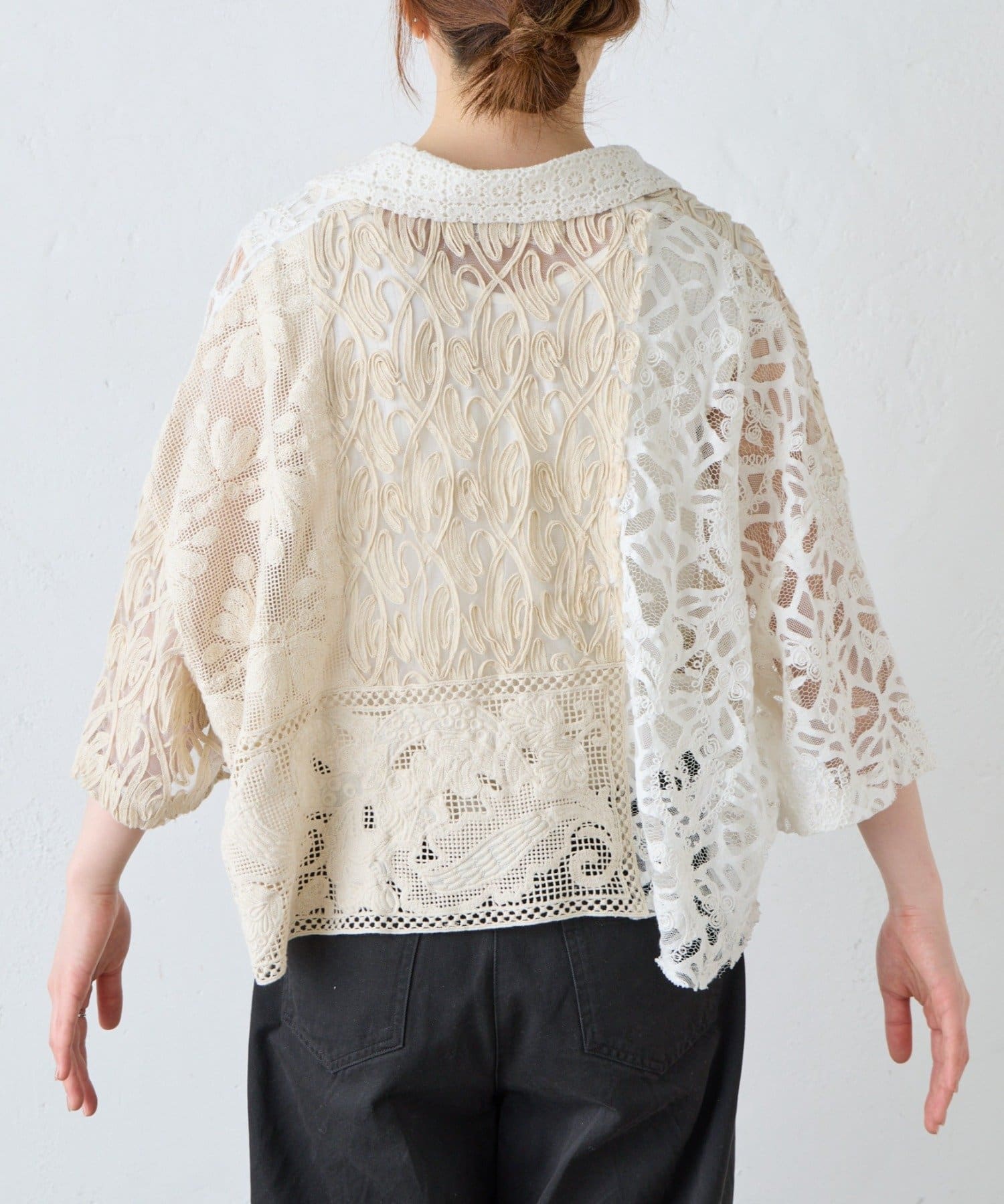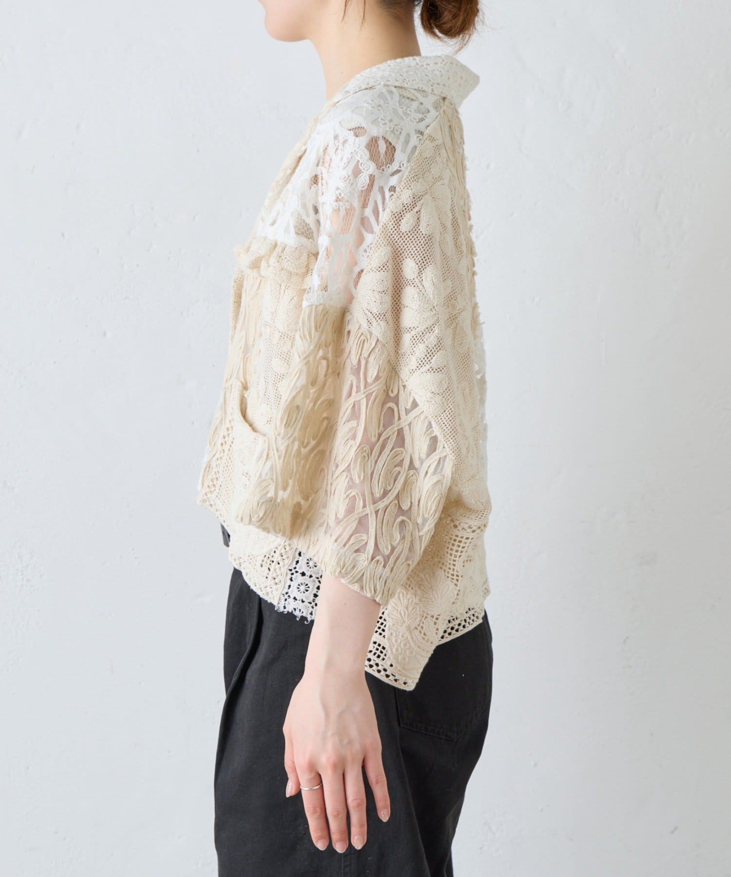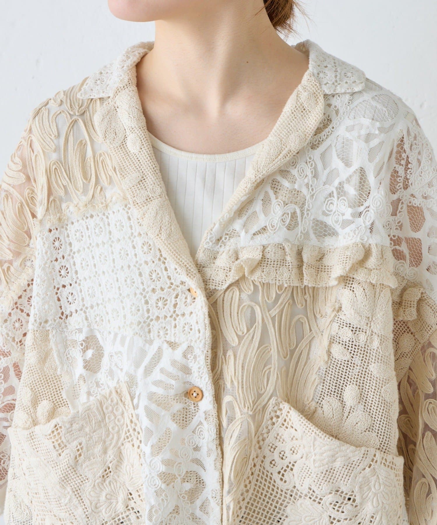 繊細なレースを贅沢に使用した、パッチワーク風の個性的なデザイン。異なる柄のレースを組み合わせることで、奥行きのある表情豊かな仕上がりになっています。