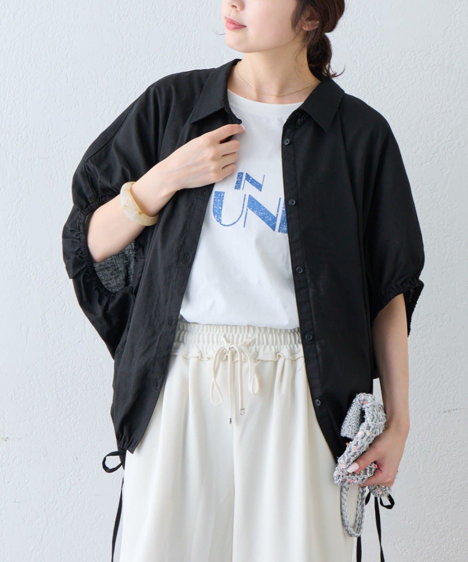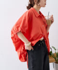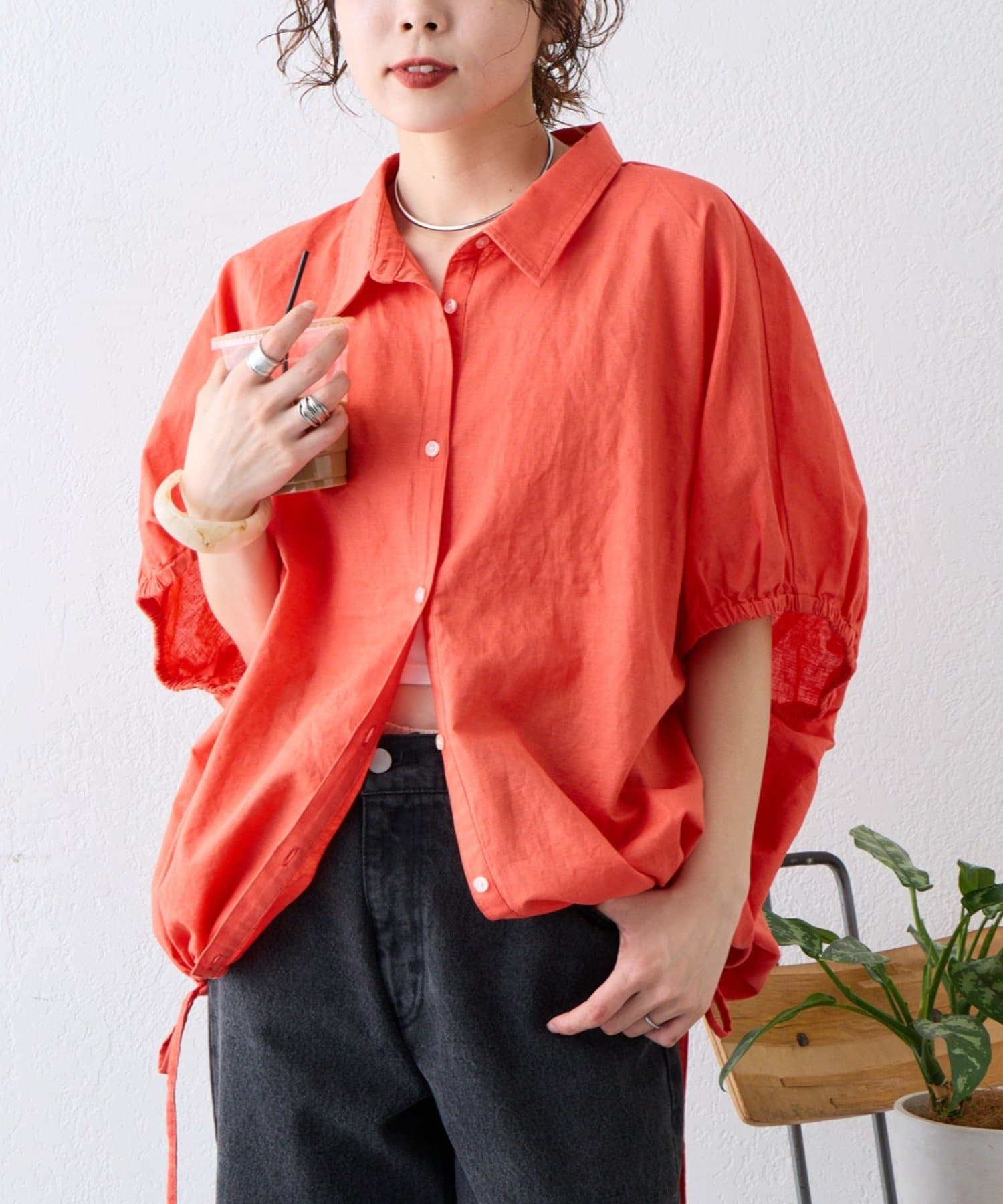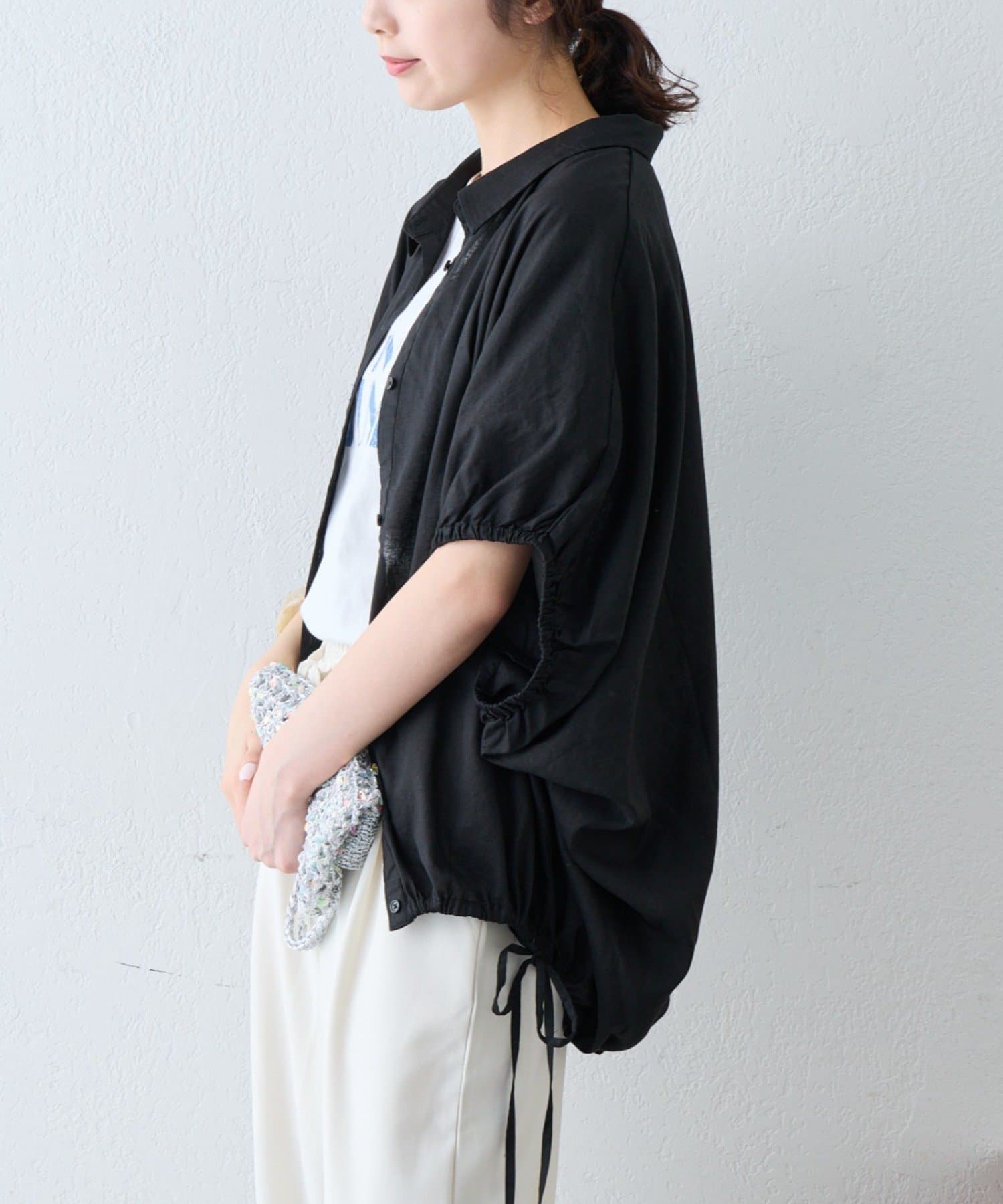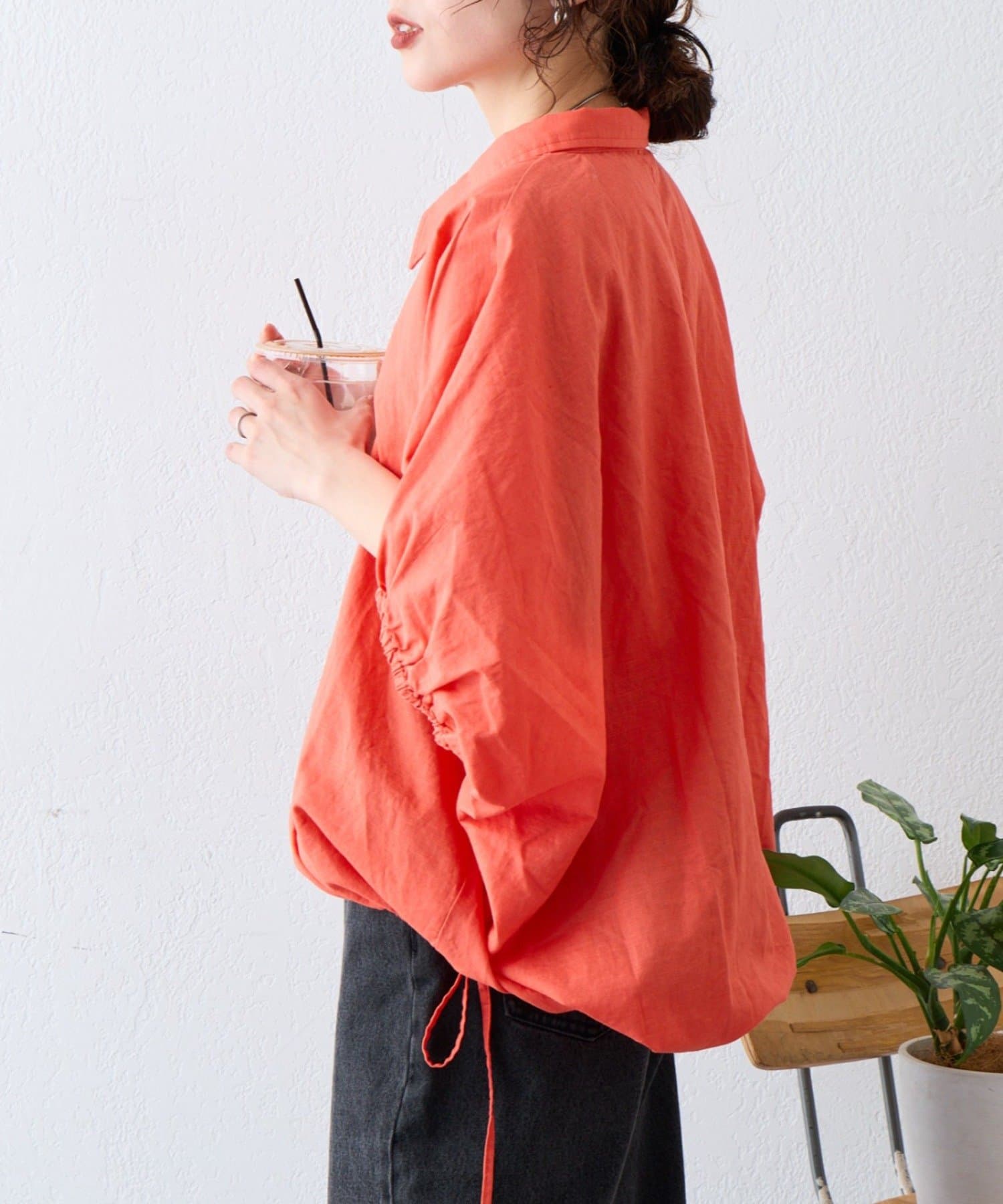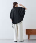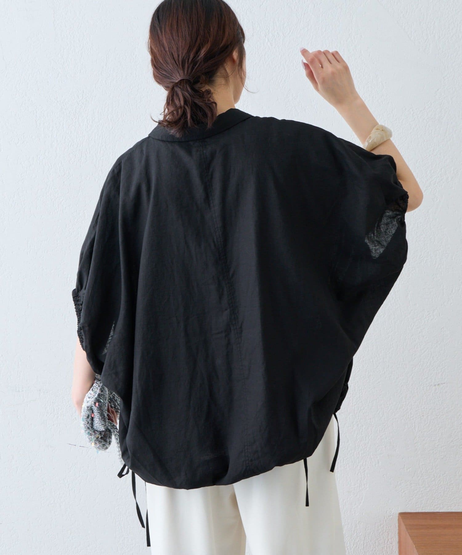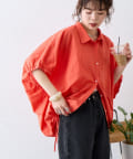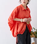 綿麻袖ギャザー裾リボンバルーンシャツ