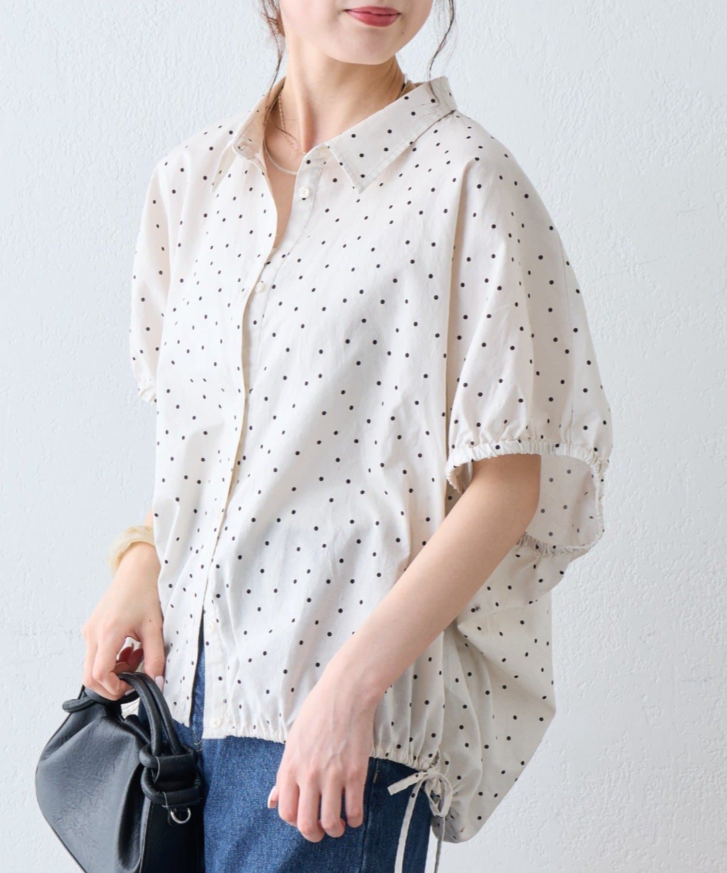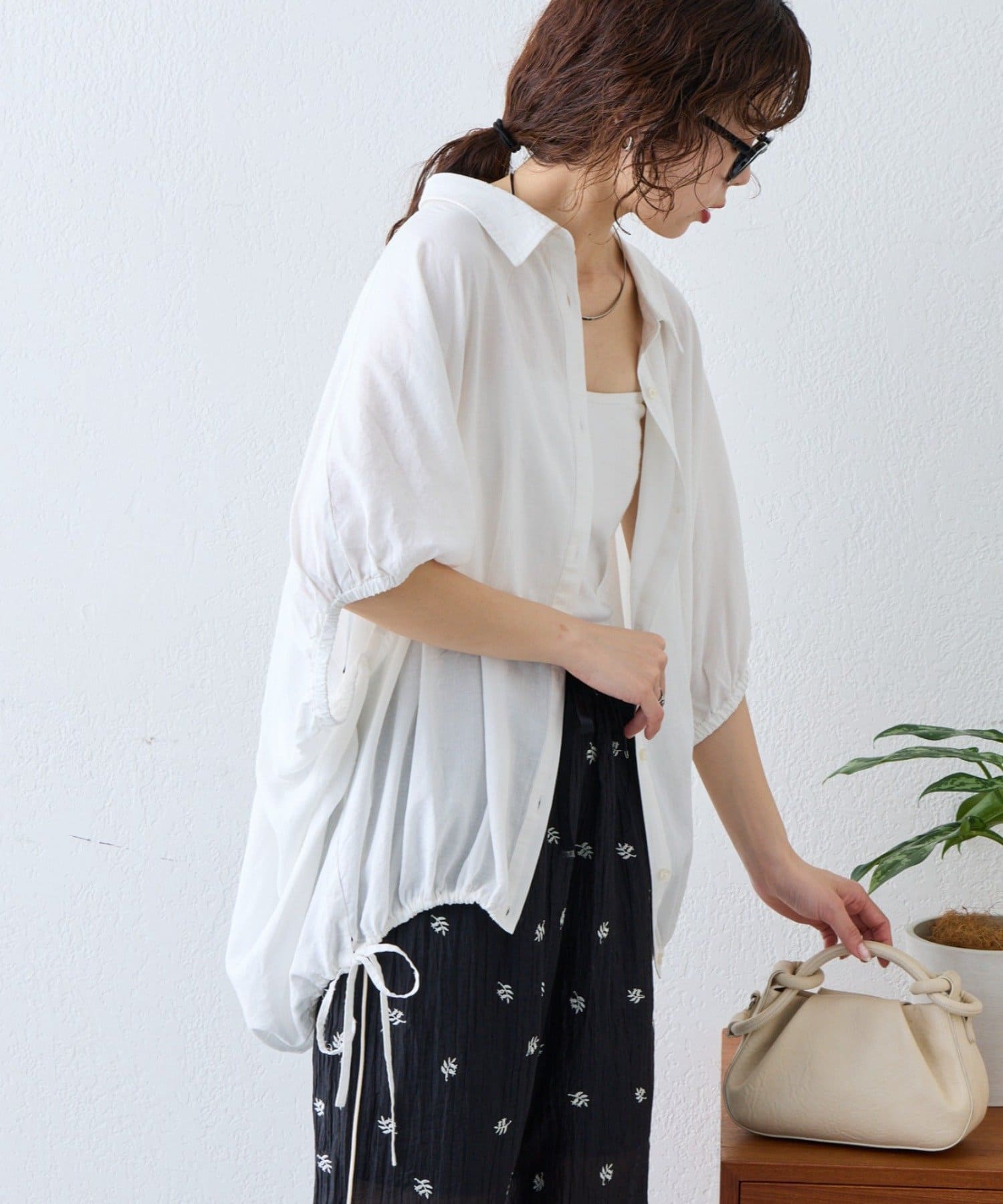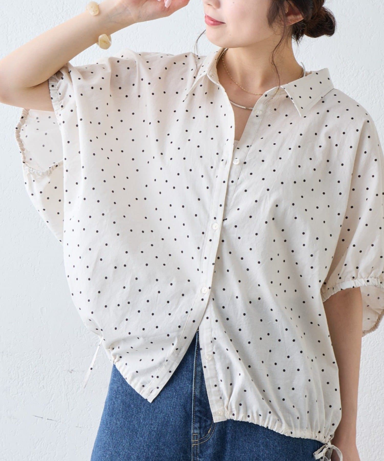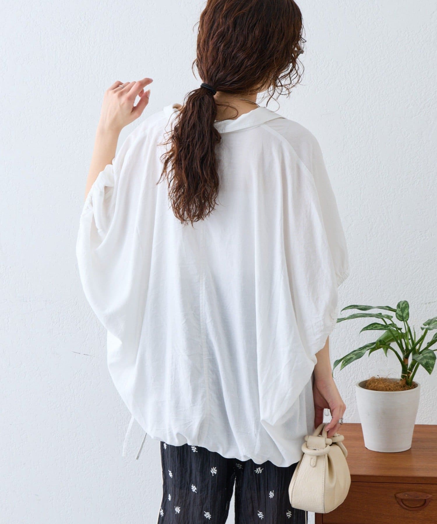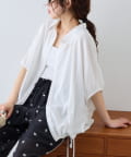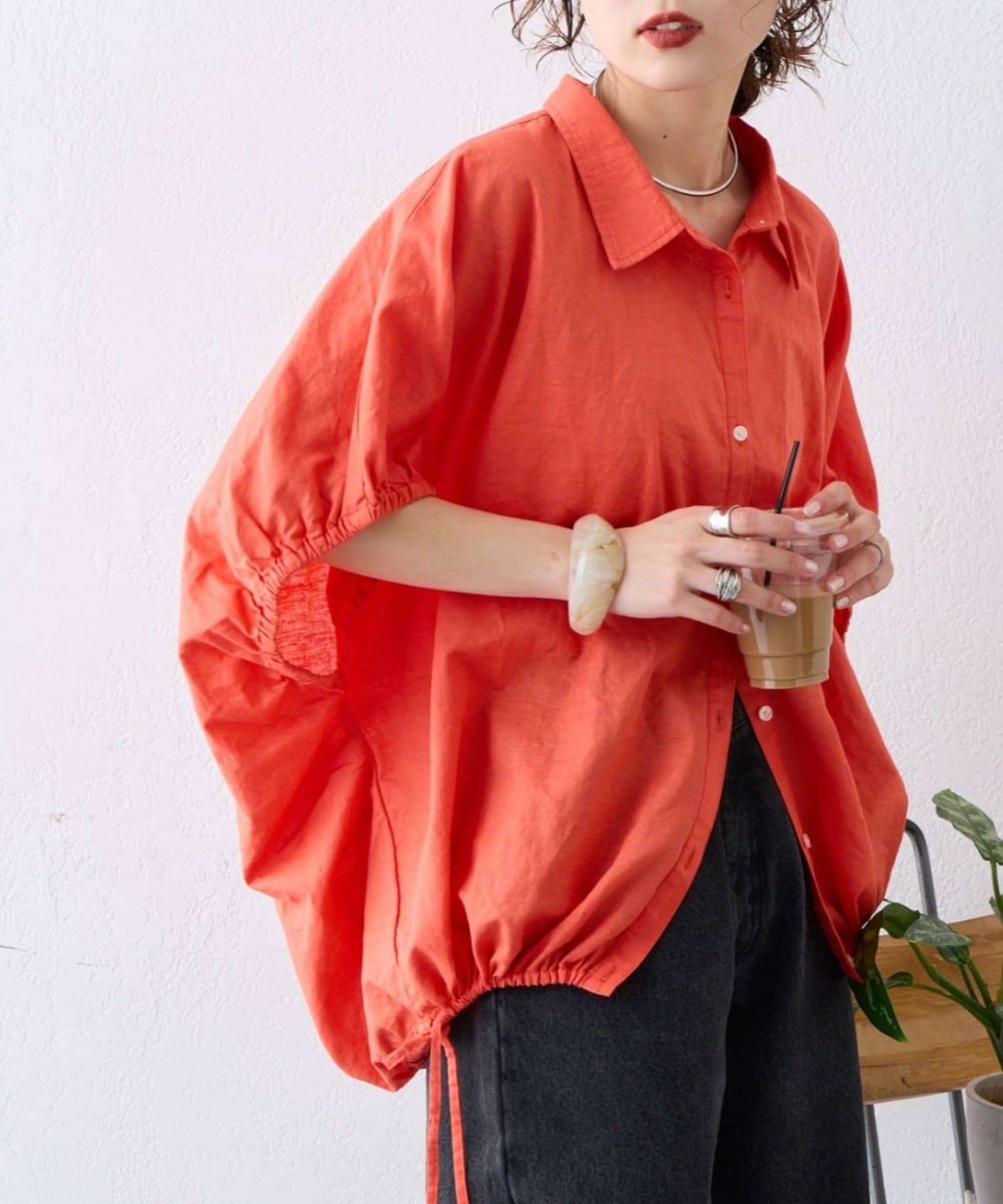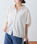 綿麻袖ギャザー裾リボンバルーンシャツ