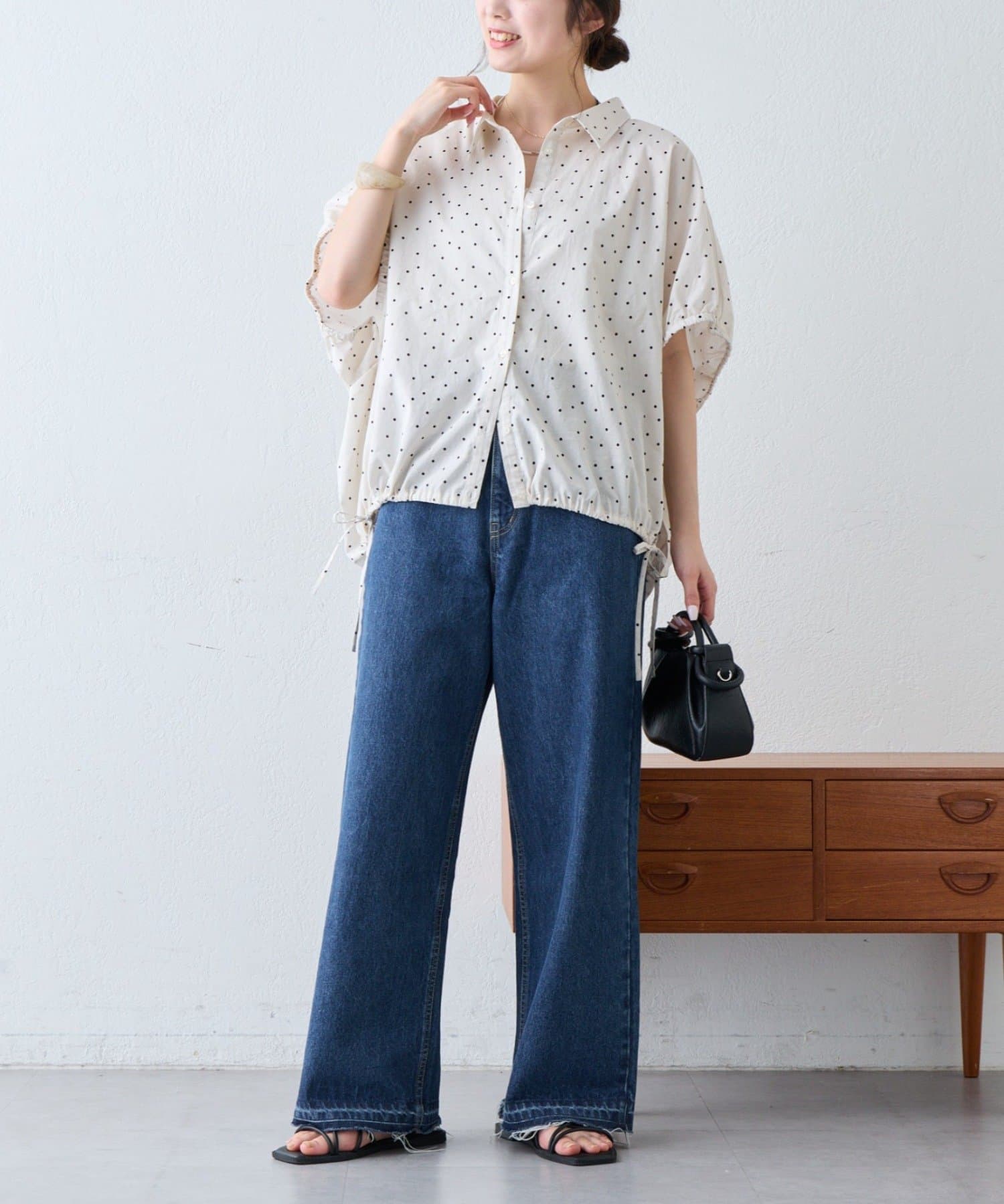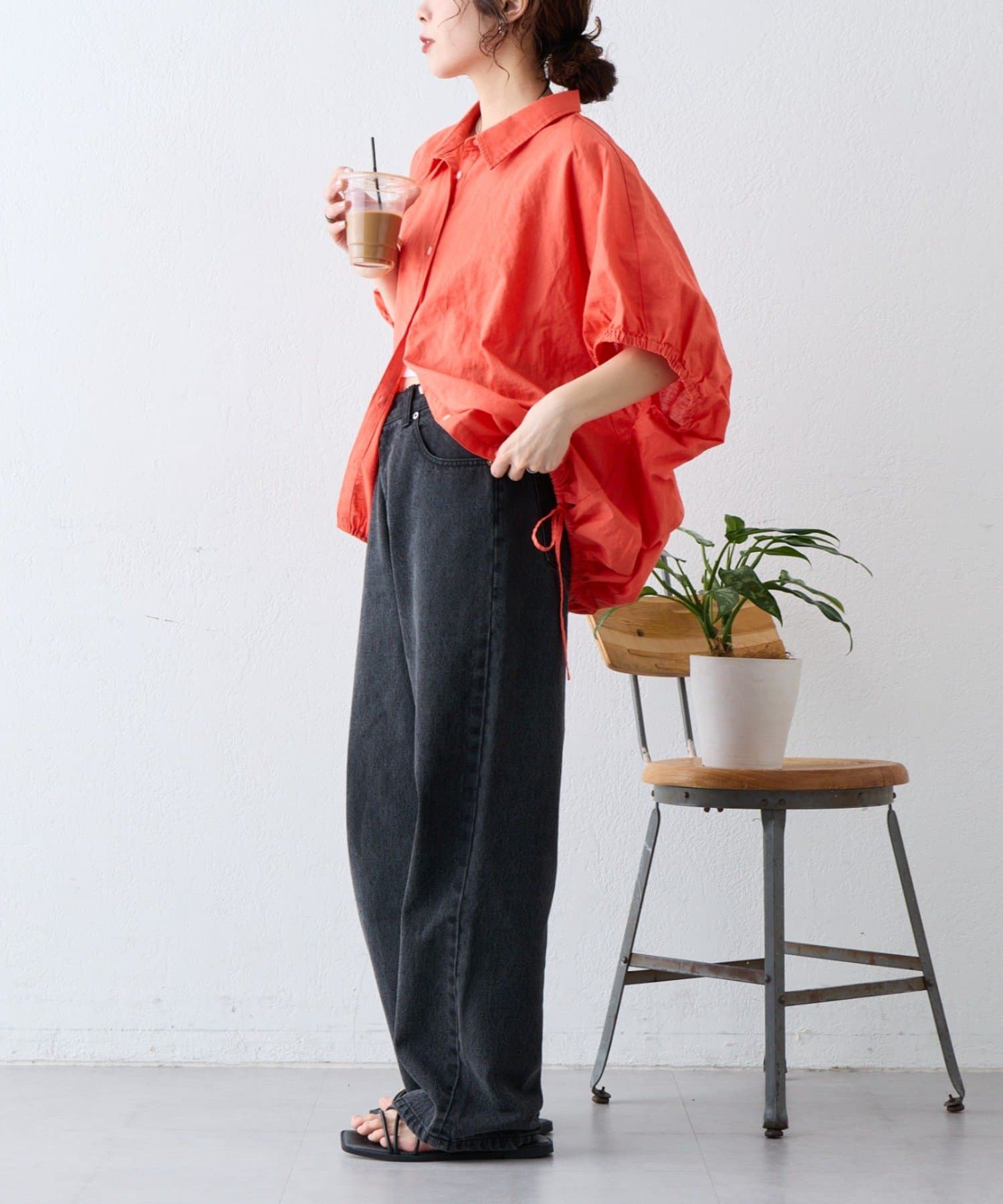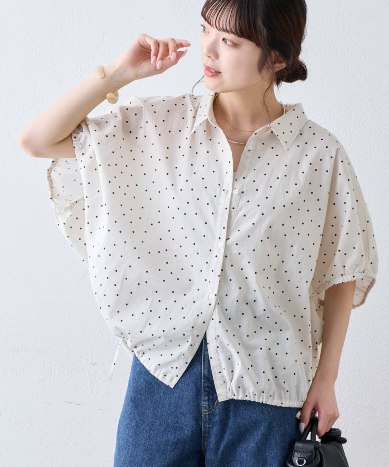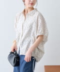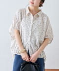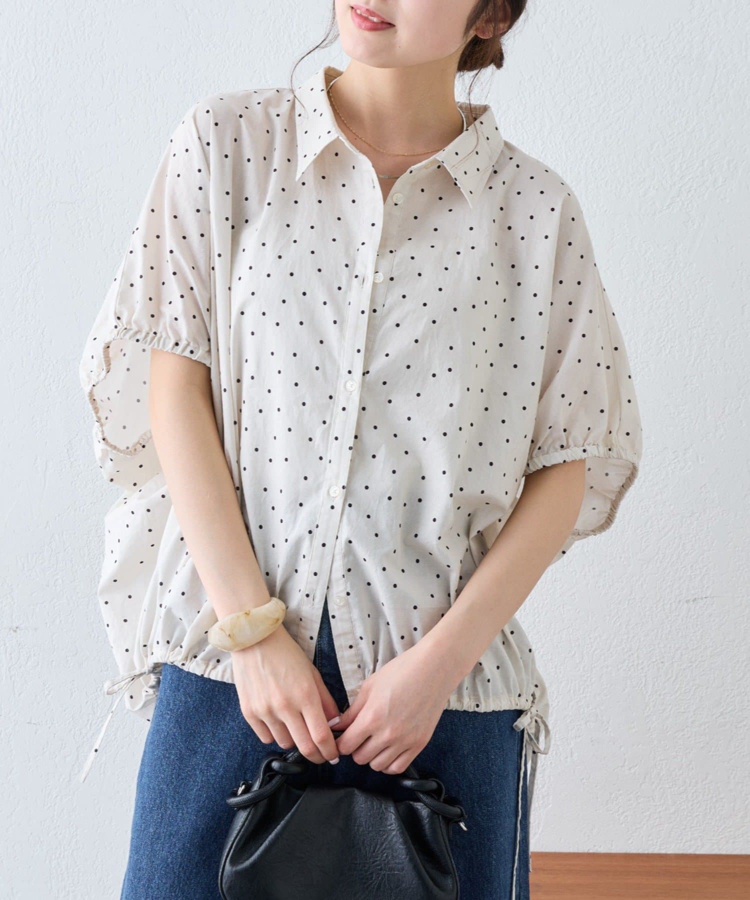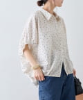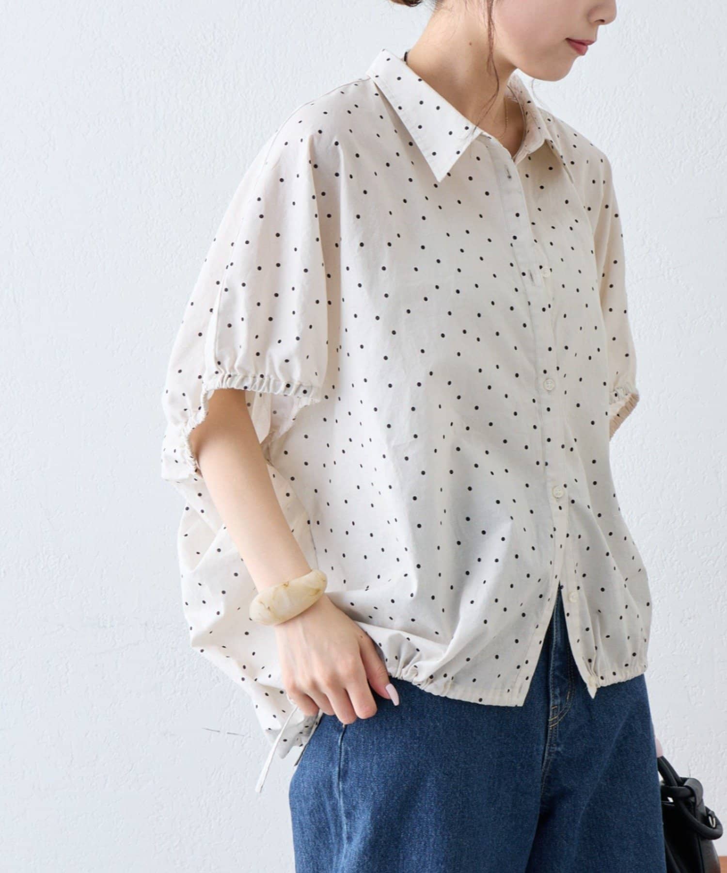 綿麻袖ギャザー裾リボンバルーンシャツ