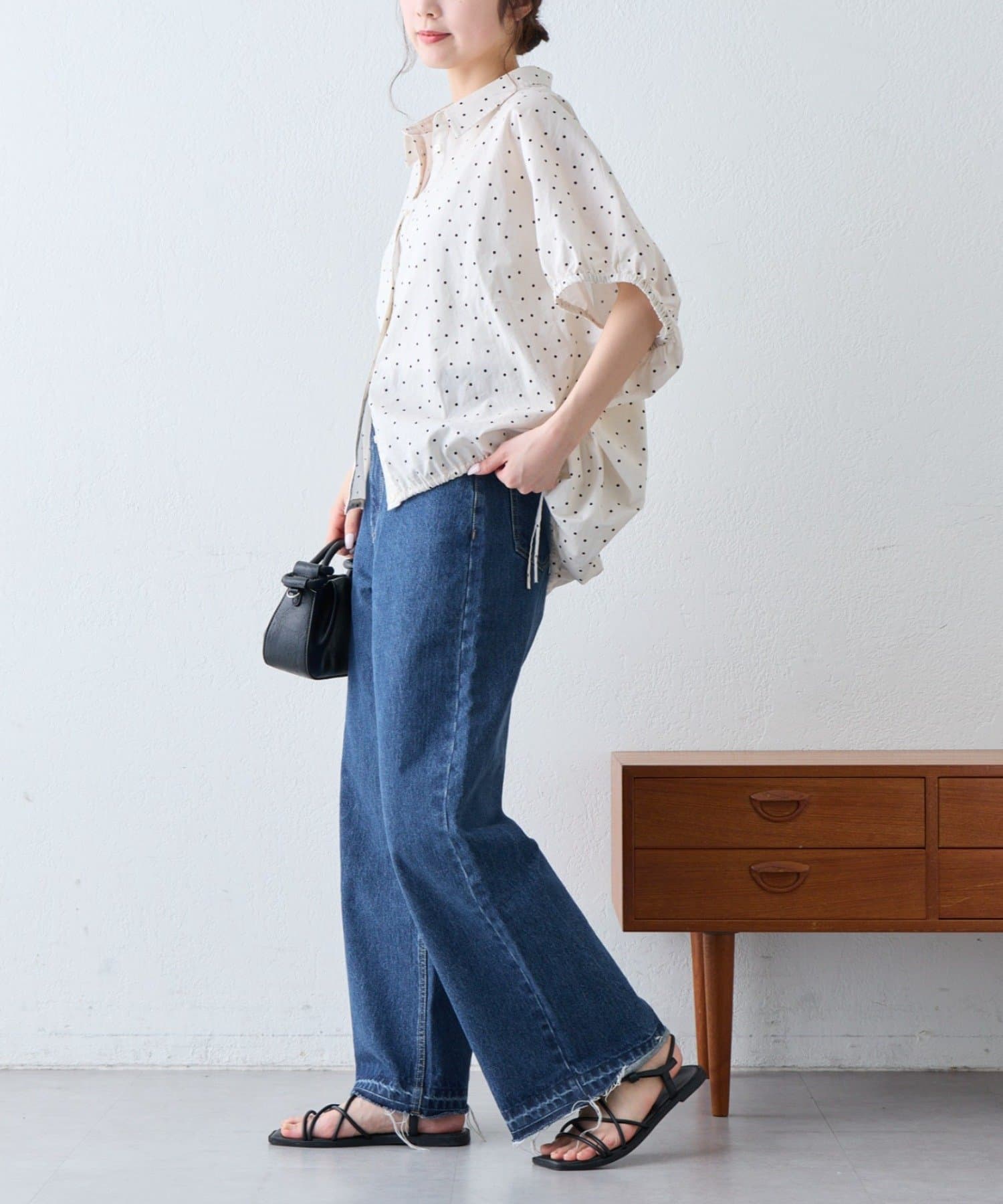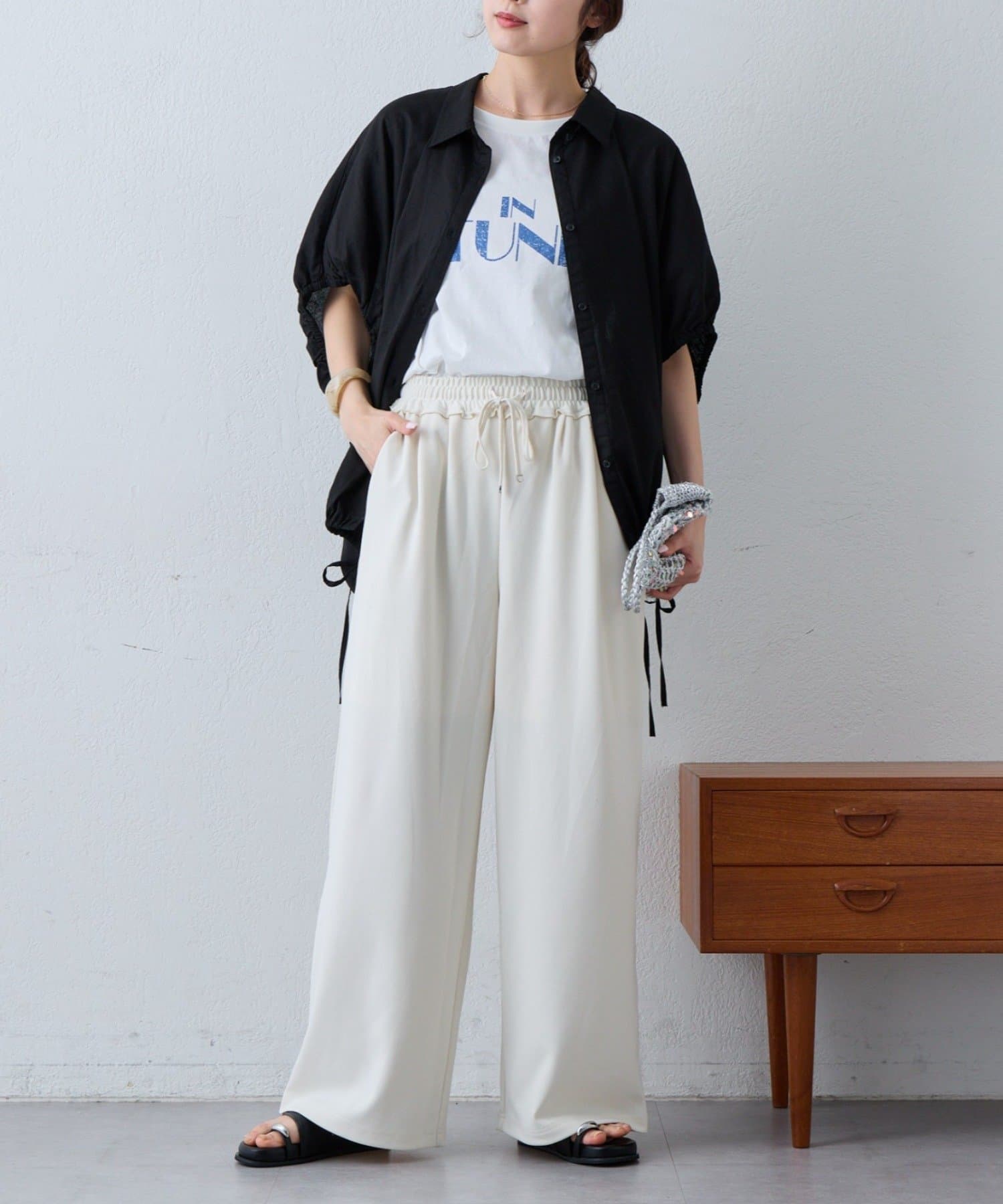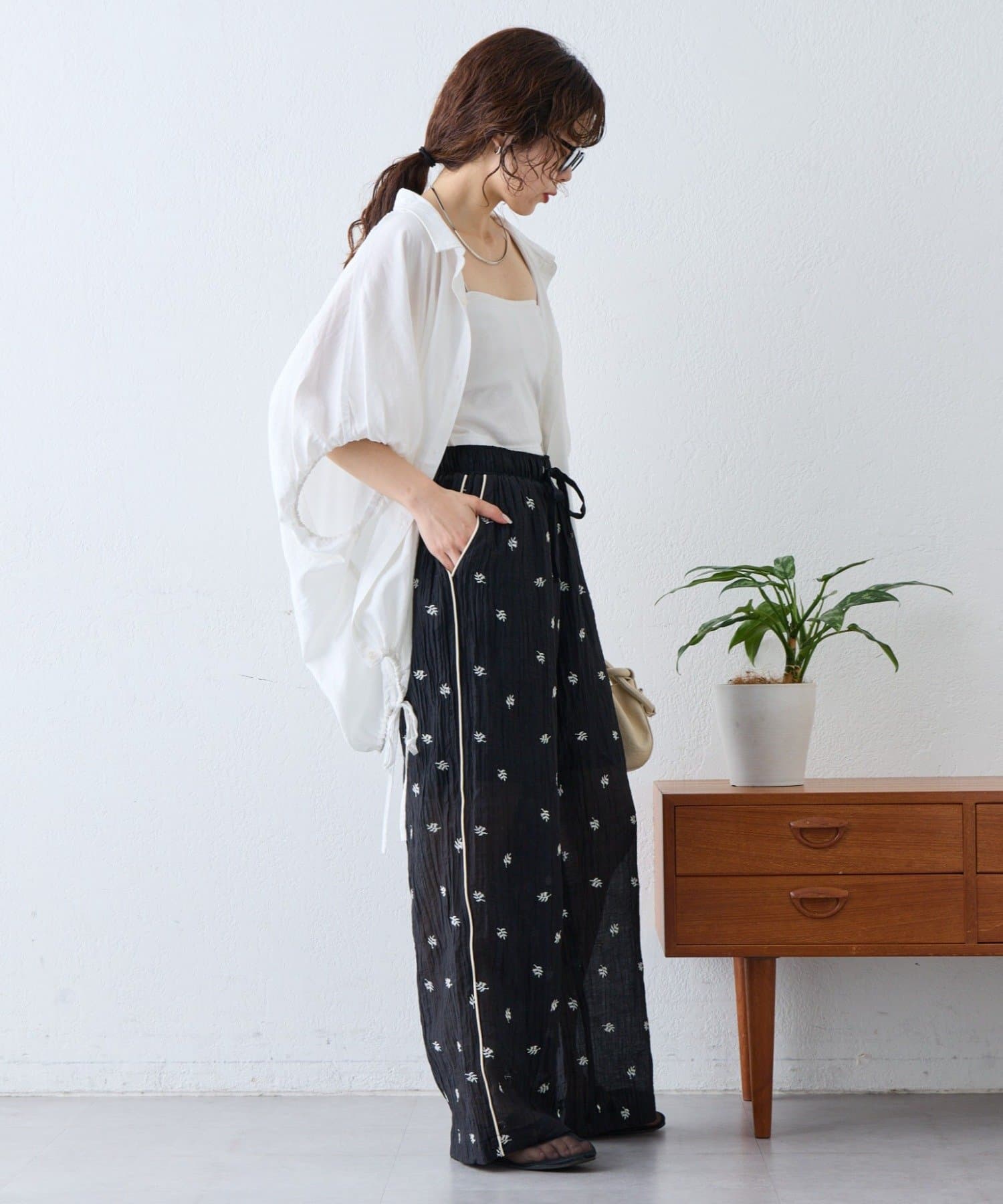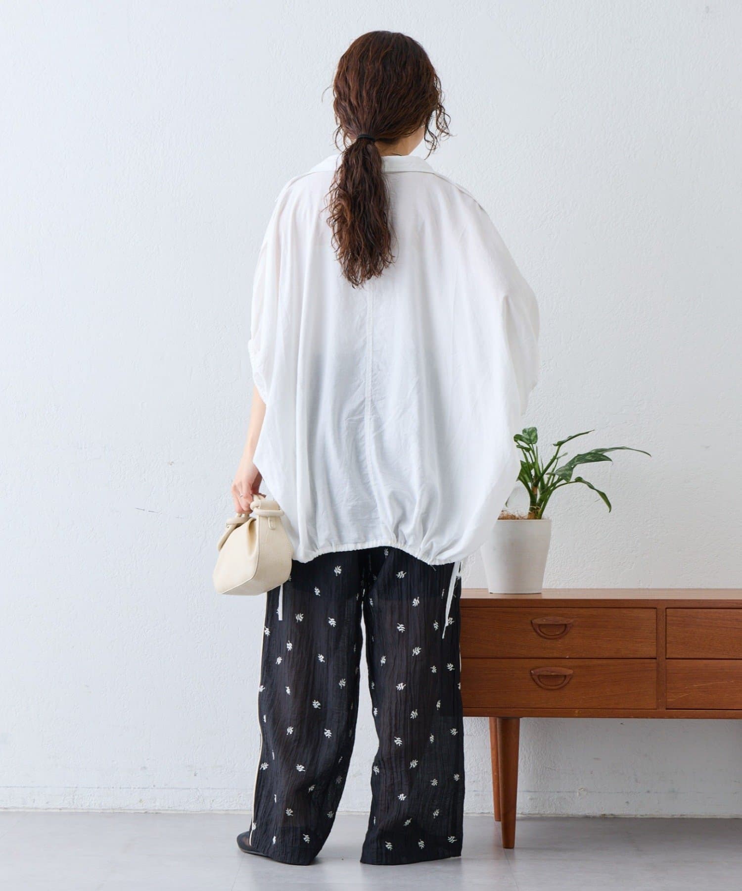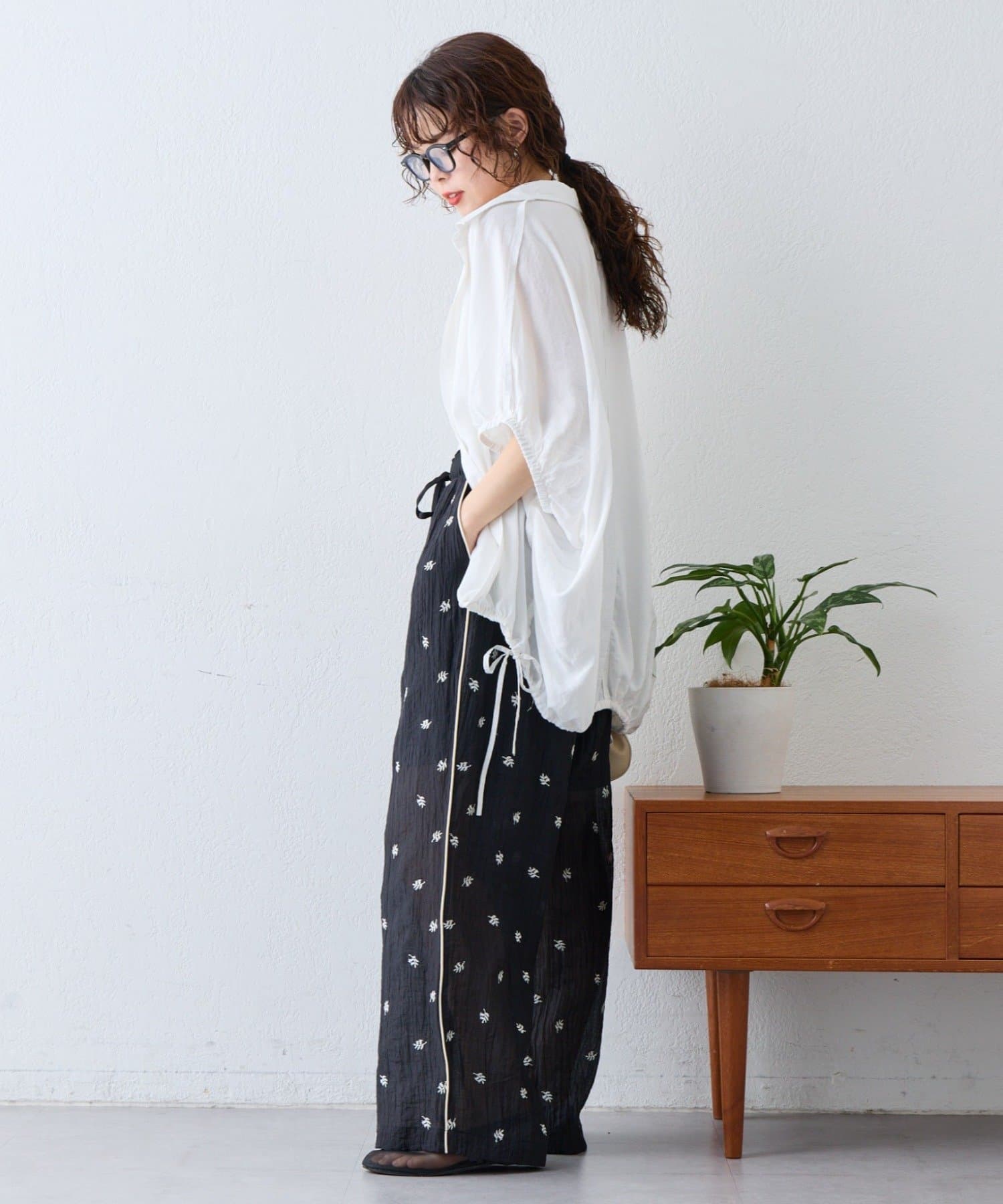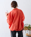 裾の紐を絞ってバルーンシルエットにすると、ボリュームのあるボトムともバランスよく着こなせます。