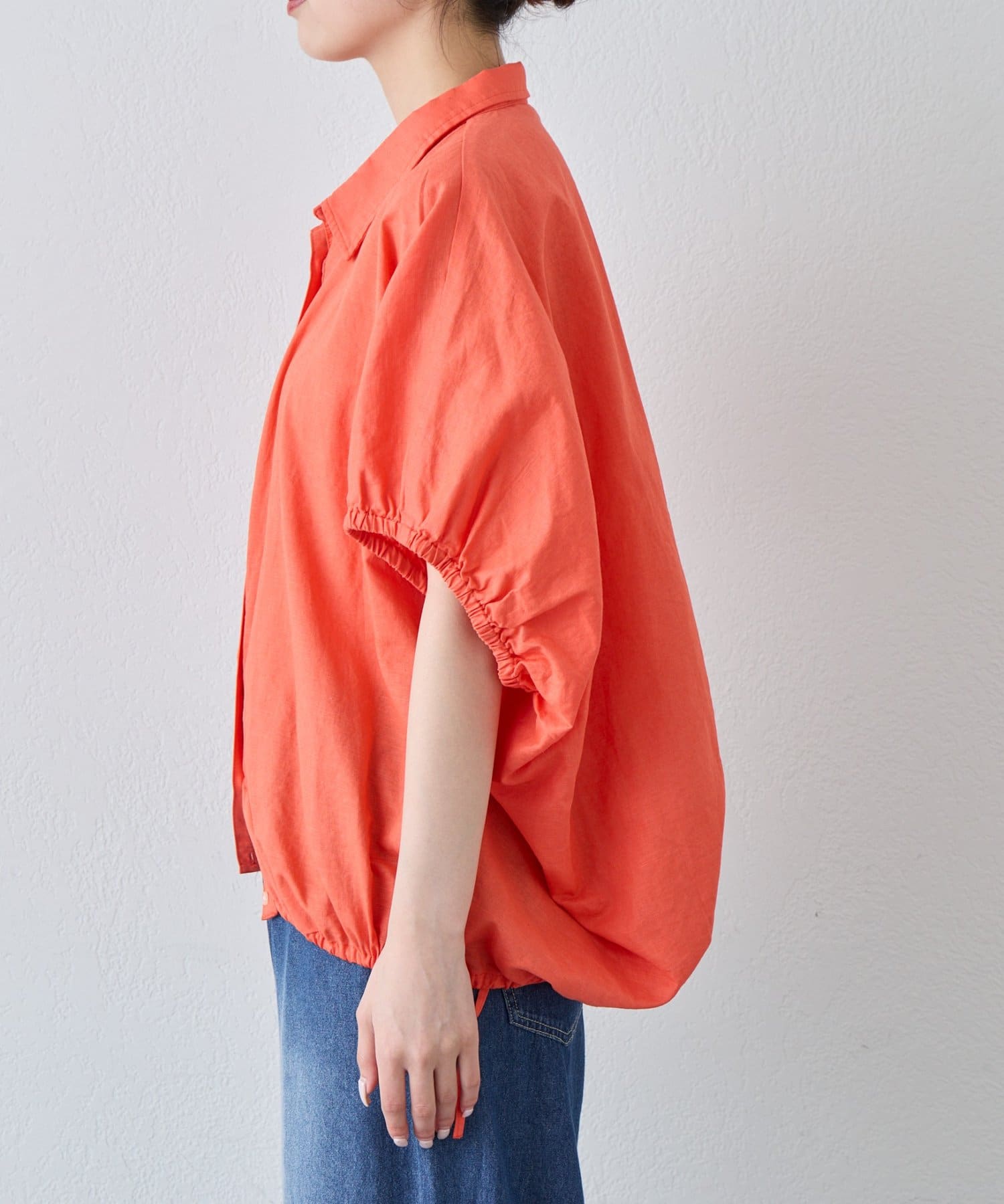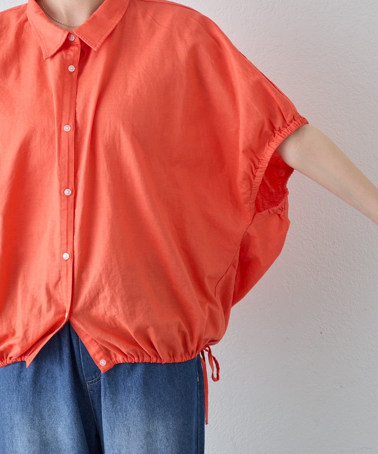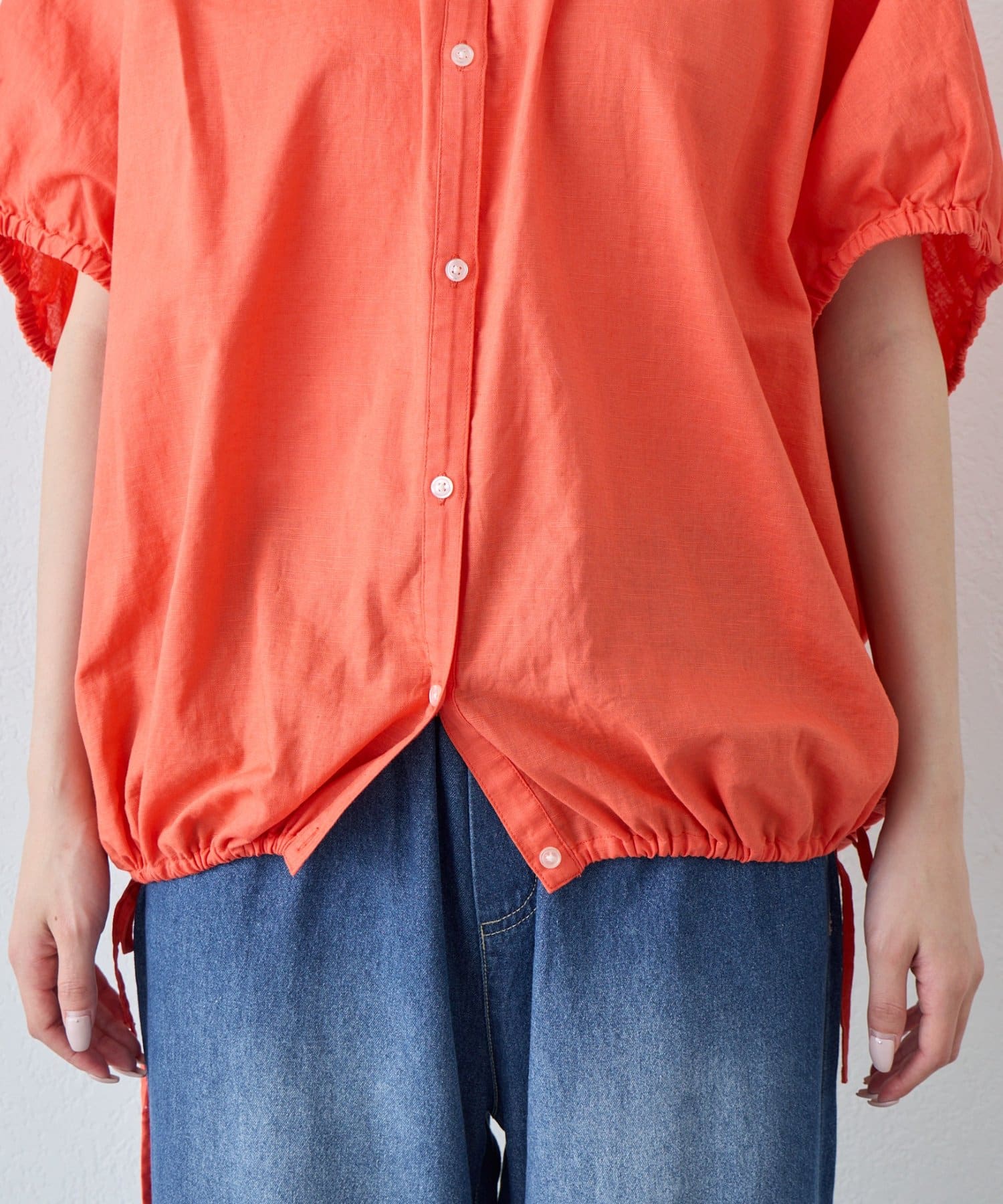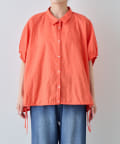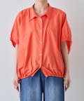 【夏も快適/二の腕カバー】綿麻袖ギャザー裾リボンバルーンシャツ