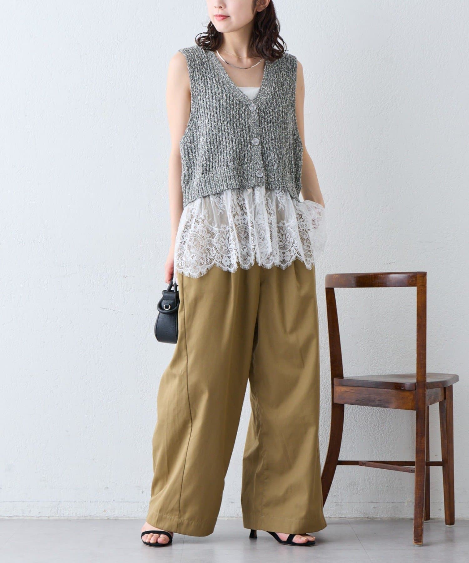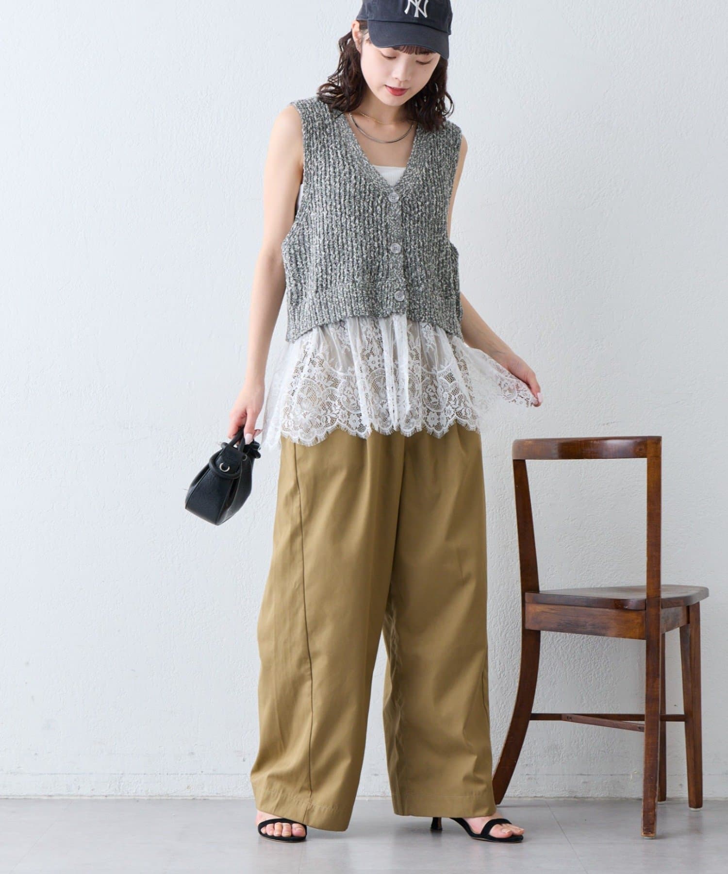 よく見ると表情のある生地感のベストと上品なレースの異素材を組み合わせました。