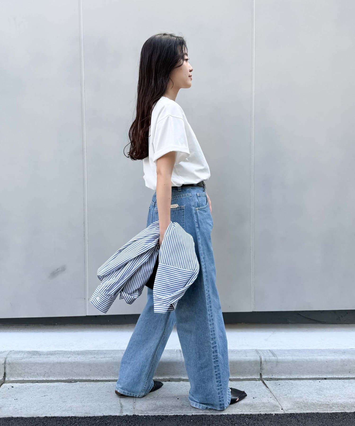長すぎない着丈がボトムとバランスを取りやすく、インでもアウトでもスタイリング可能。