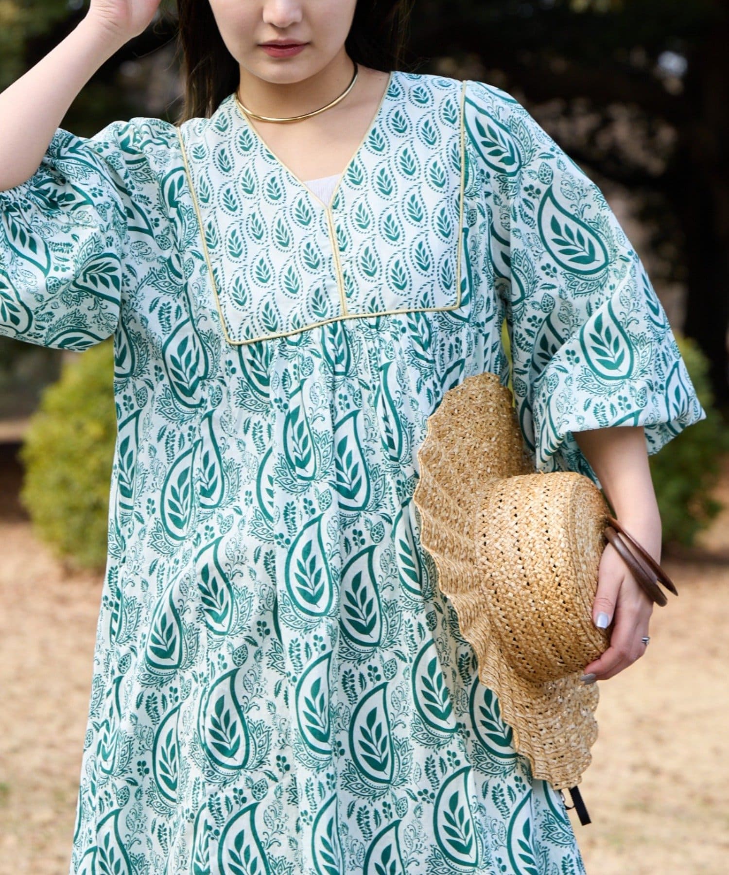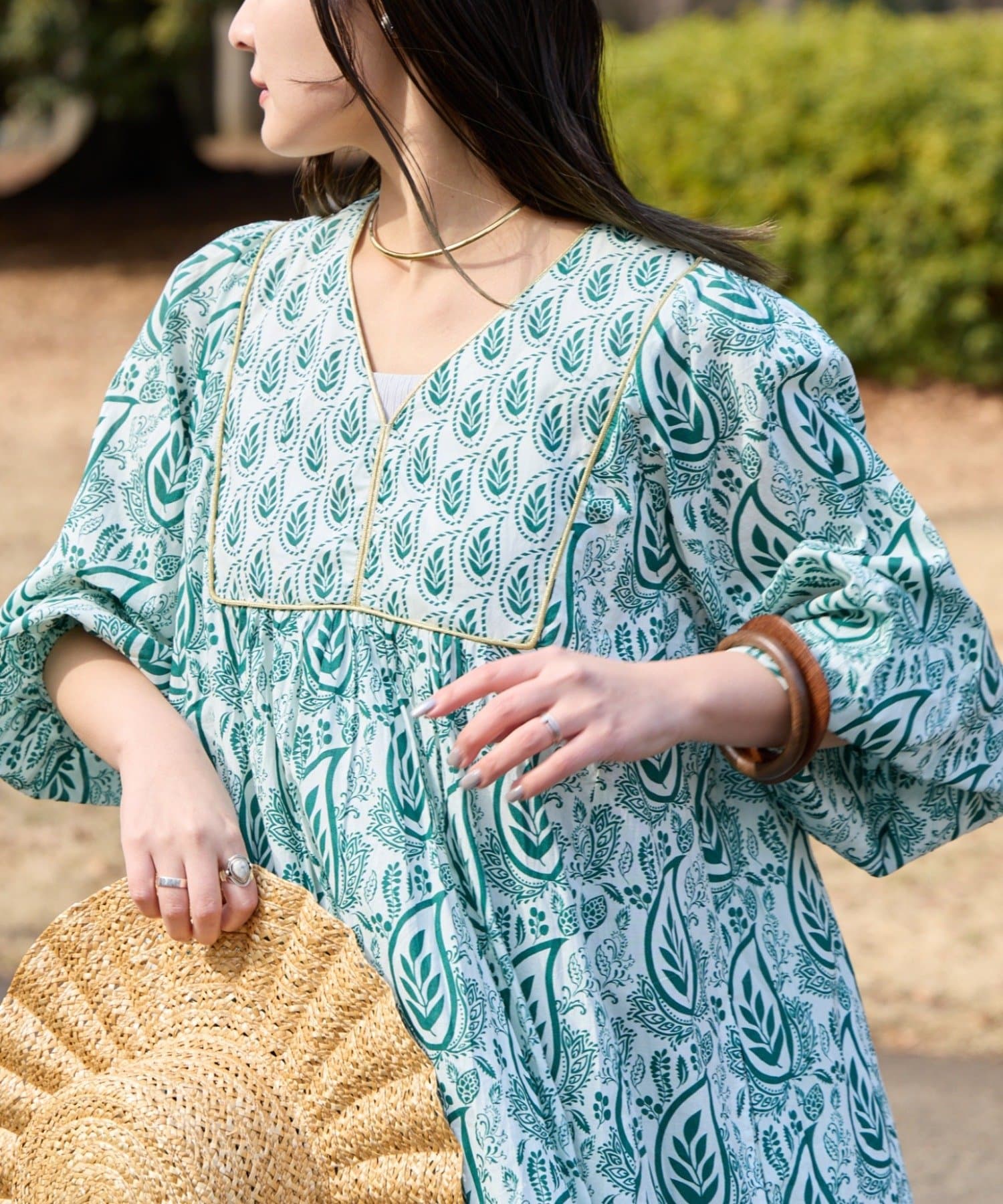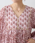 2パターンのリーフ柄をMIXしたエスニックな雰囲気が魅力