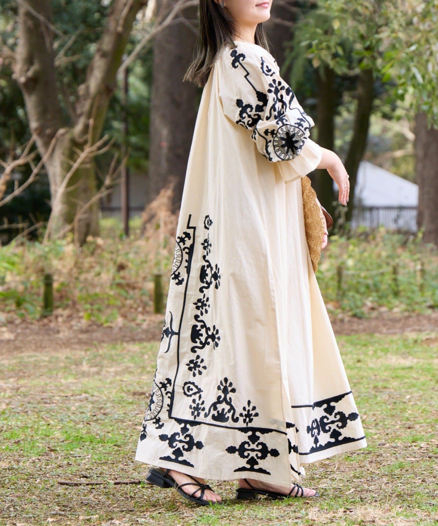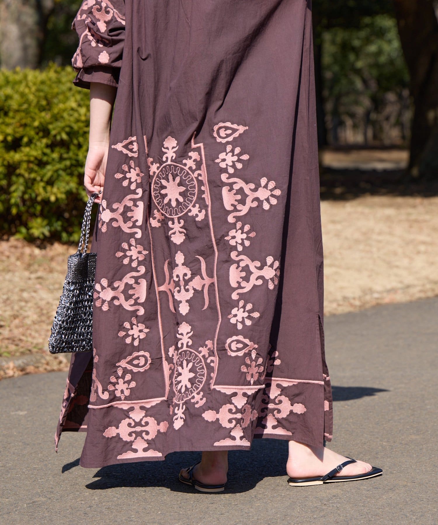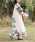 片面は、腰下から裾にかけてたっぷりと刺繍を施し、動くたびに表情が出る華やかなデザイン。