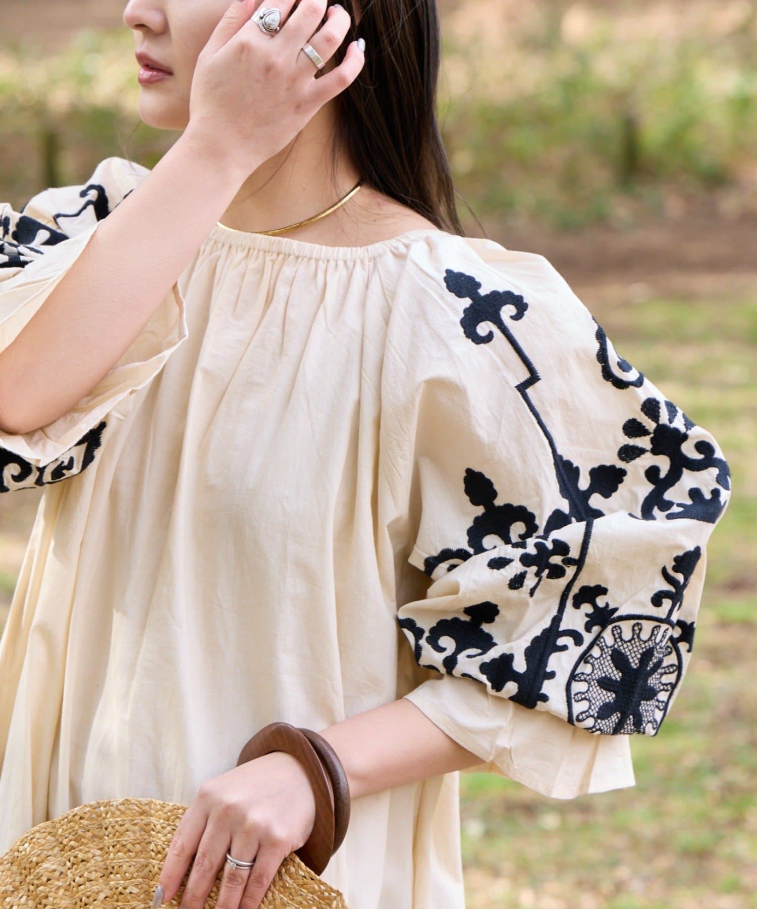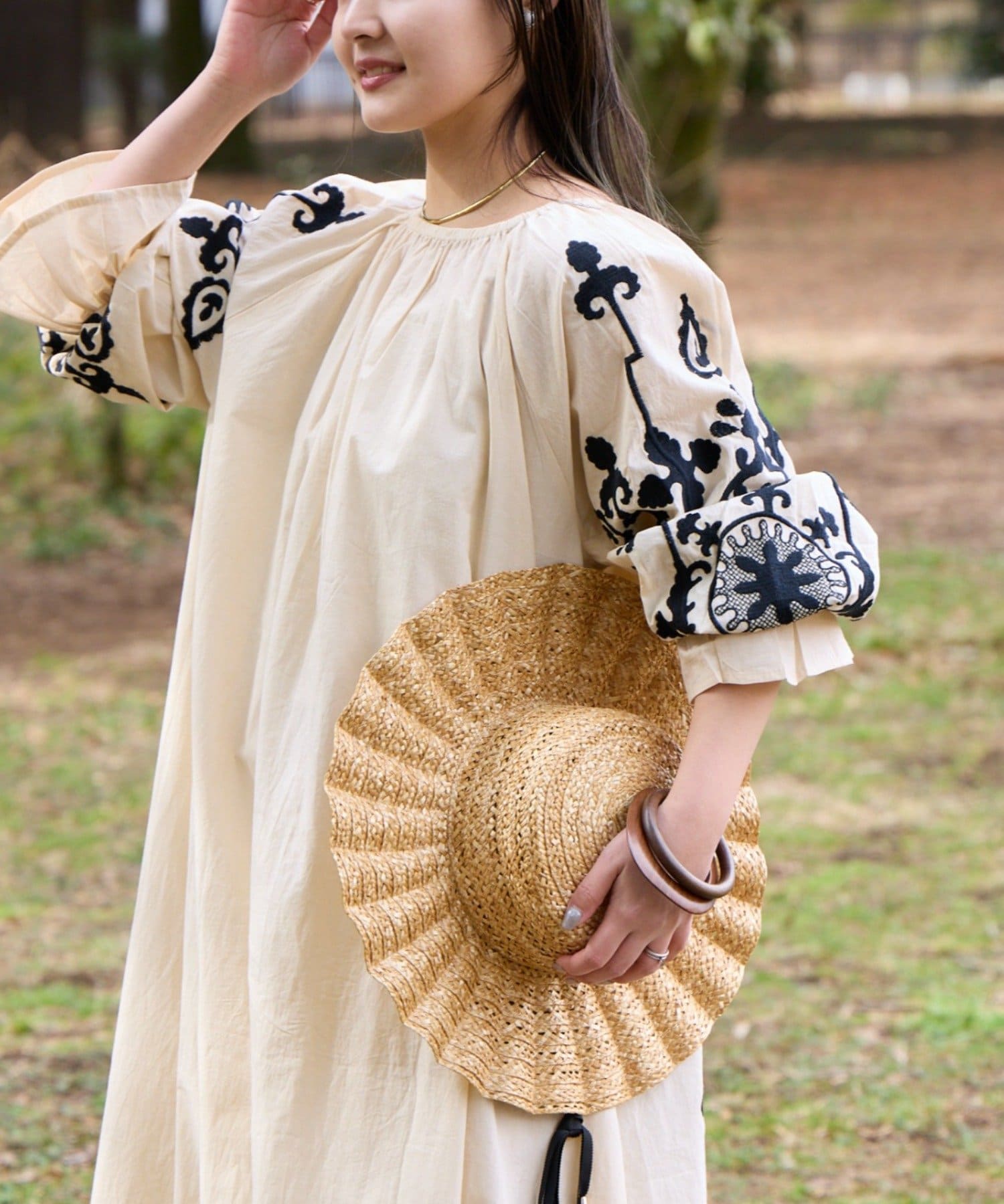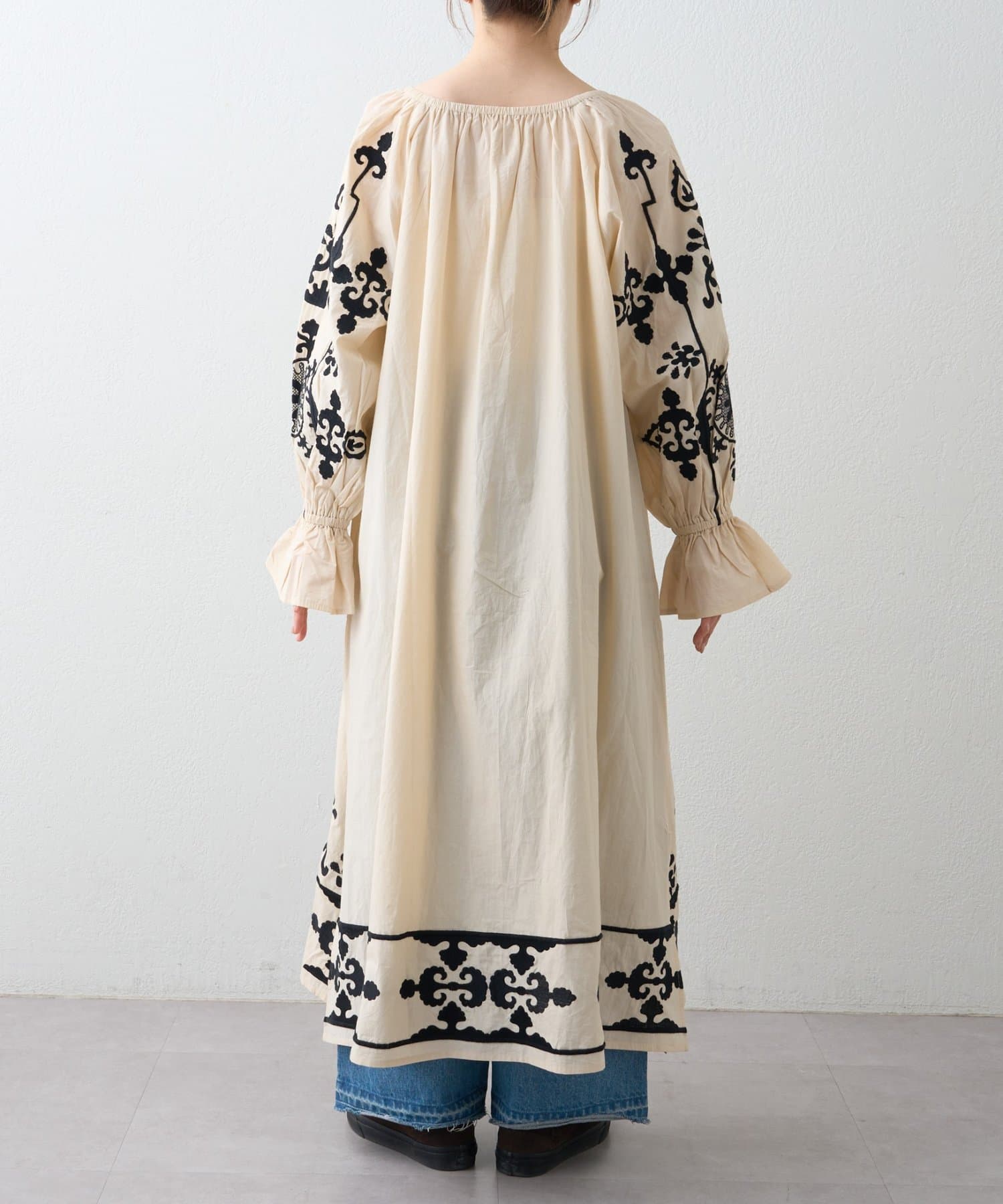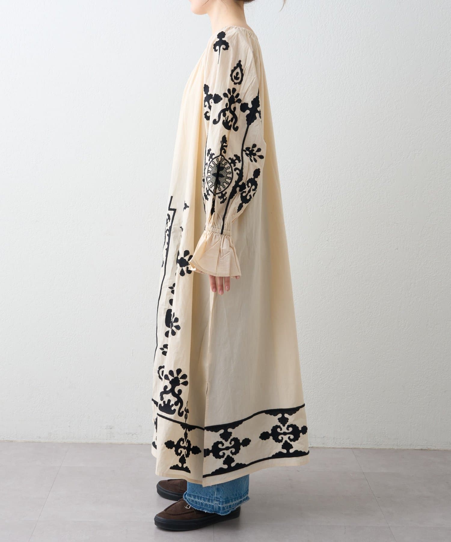 一枚でさらっと着るだけで、刺繍の表情が引き立つナチュラルなスタイリングが完成します。