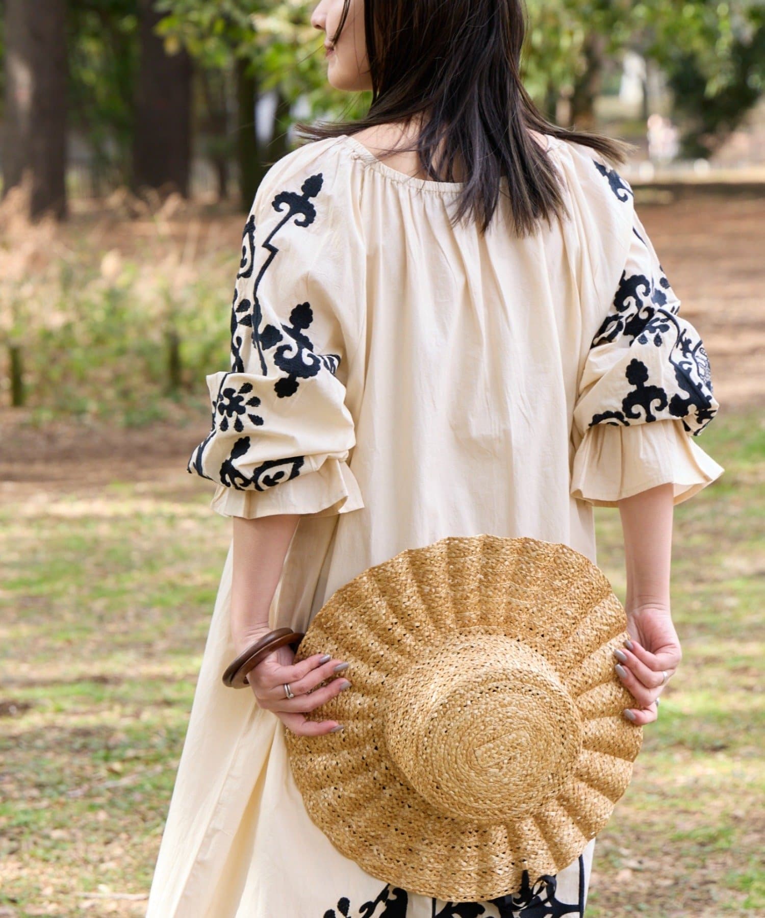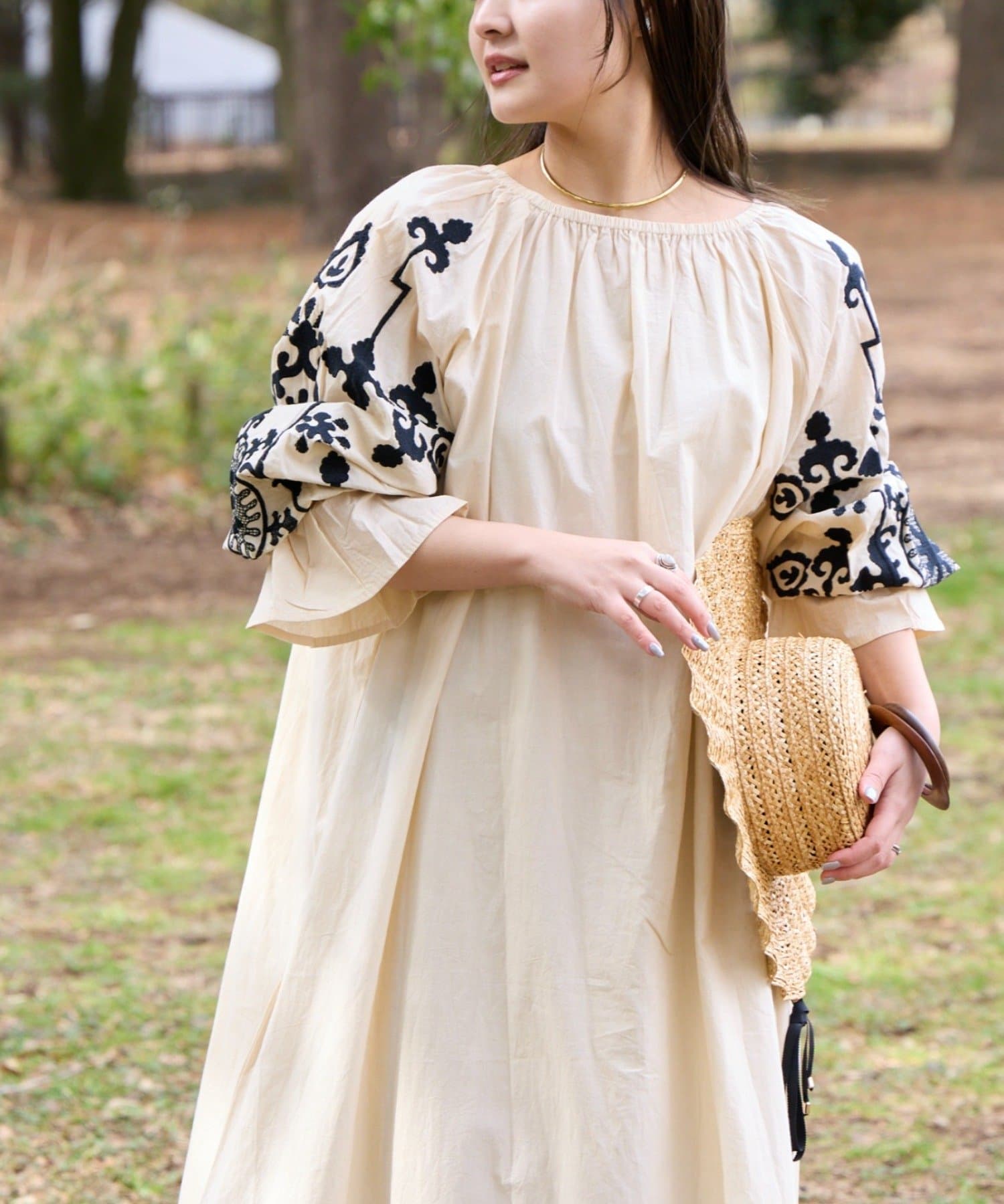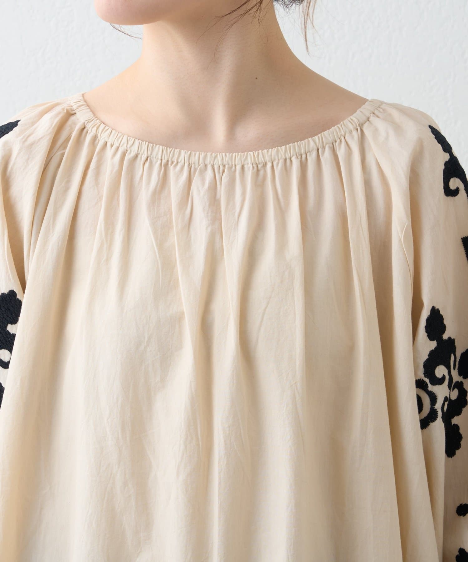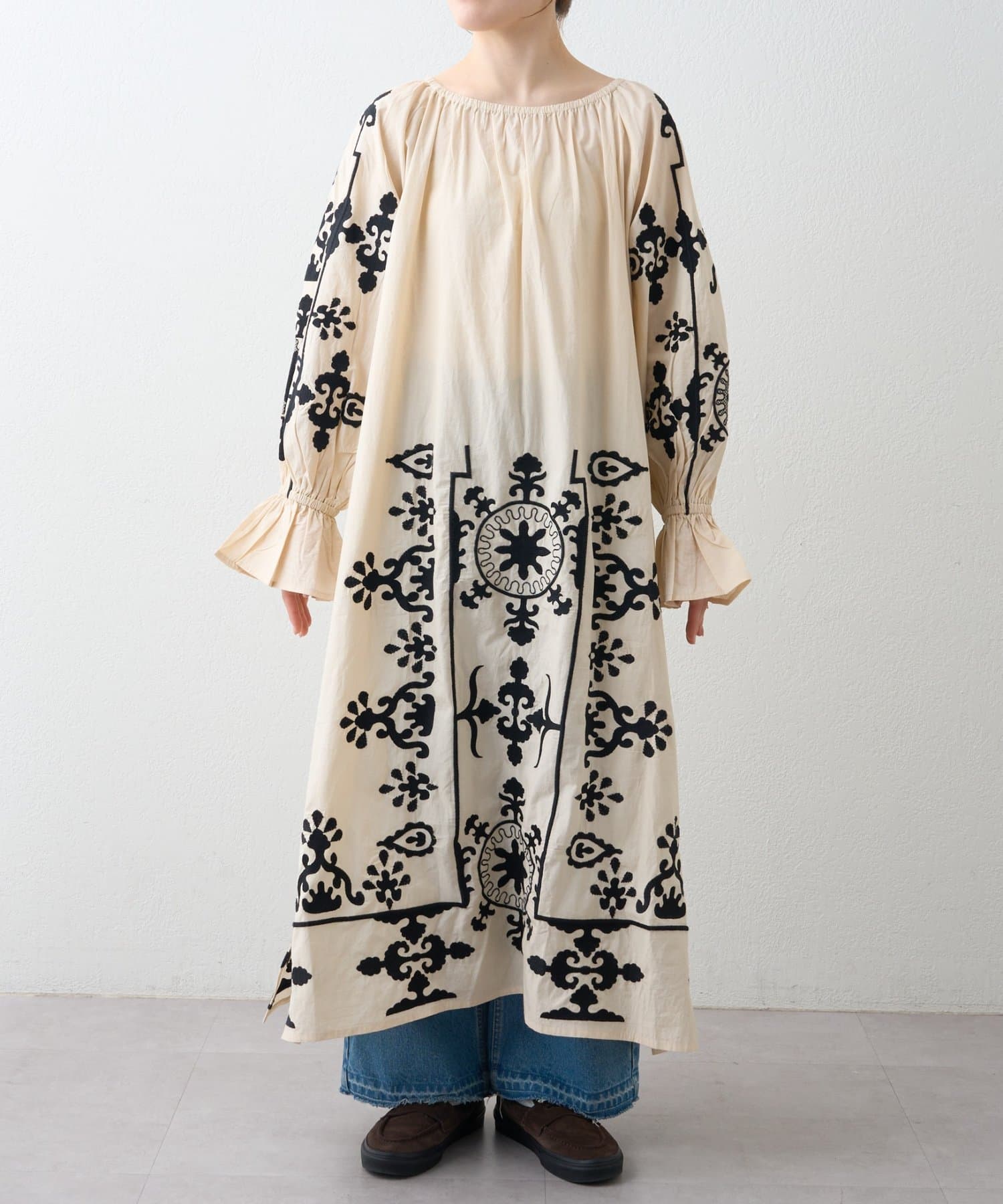 一枚でさらっと着るだけで、刺繍の表情が引き立つナチュラルなスタイリングが完成します。