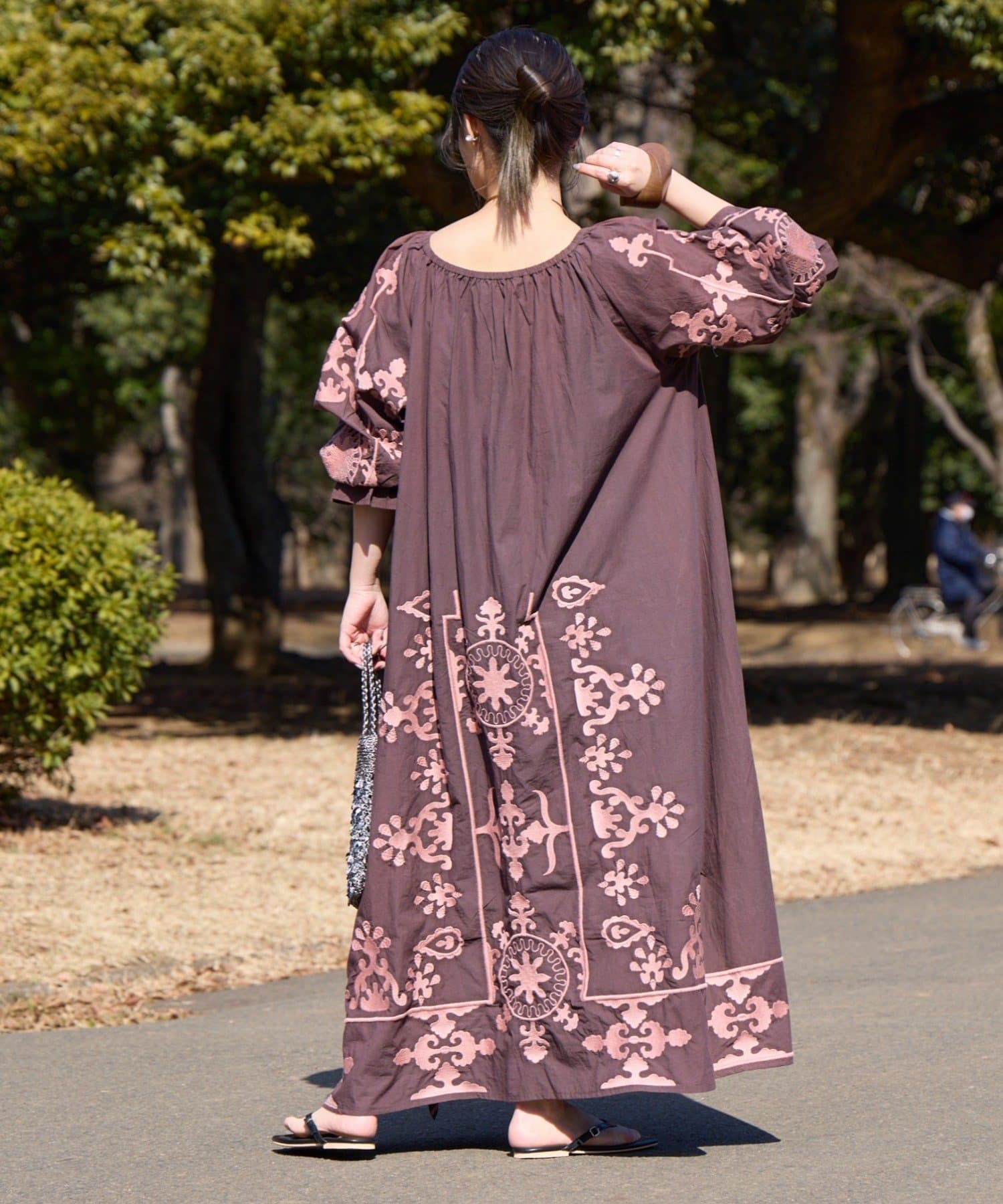 前後どちらでも着られる2WAY仕様で、刺繍の見え方を変えながらスタイリングを楽しめるのが魅力です。