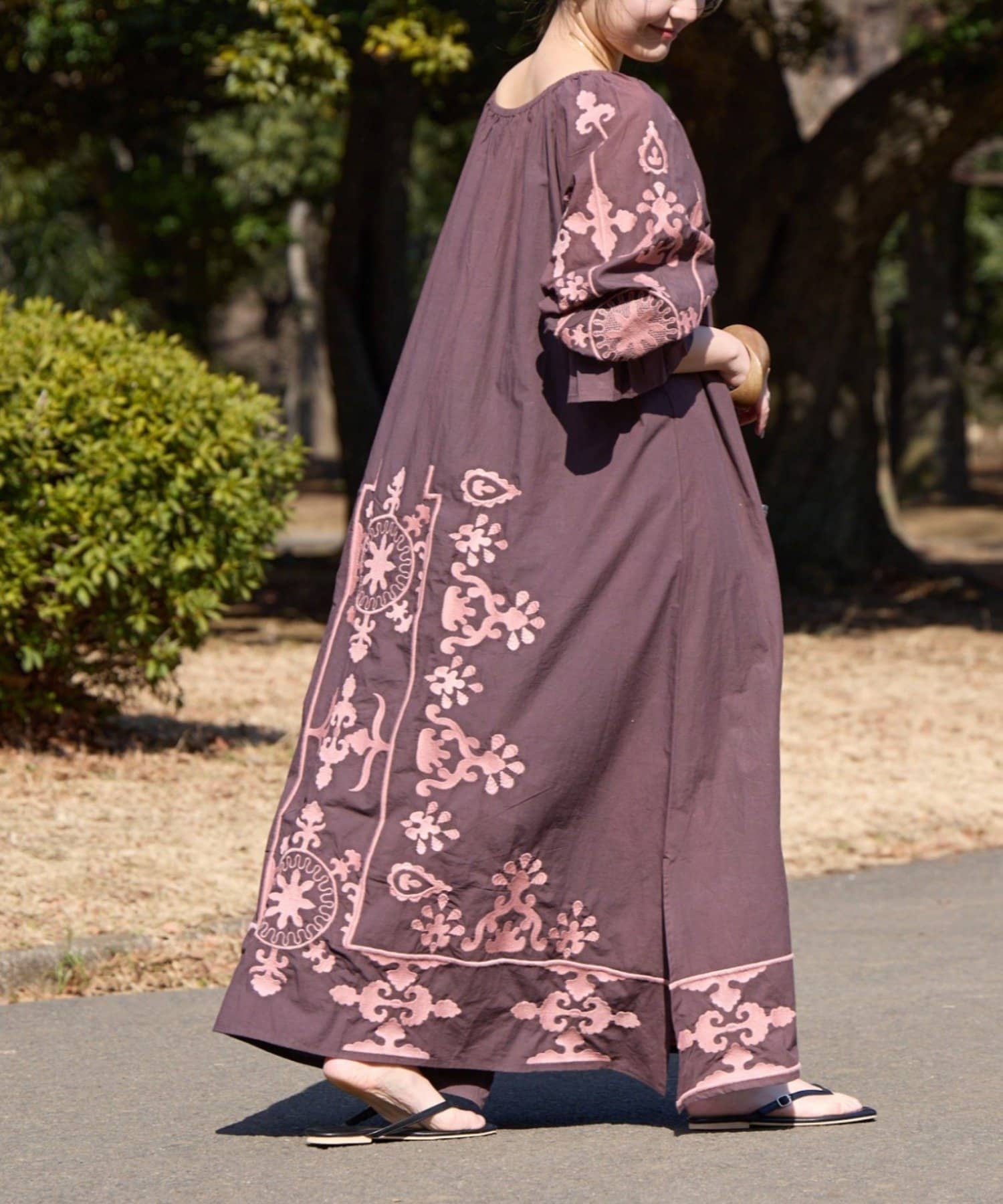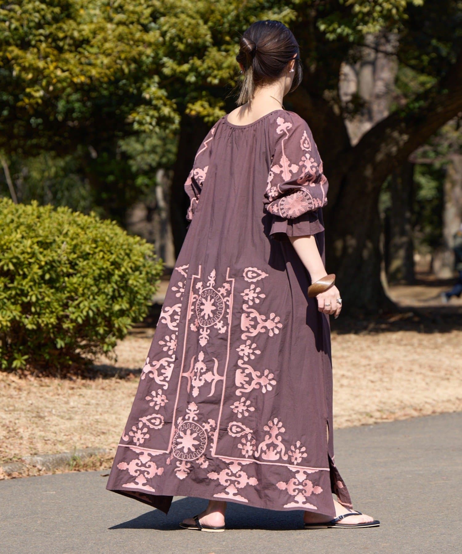 もう片面は、裾と袖のみに刺繍を入れることで、よりシンプルで落ち着いた印象に仕上げています。