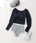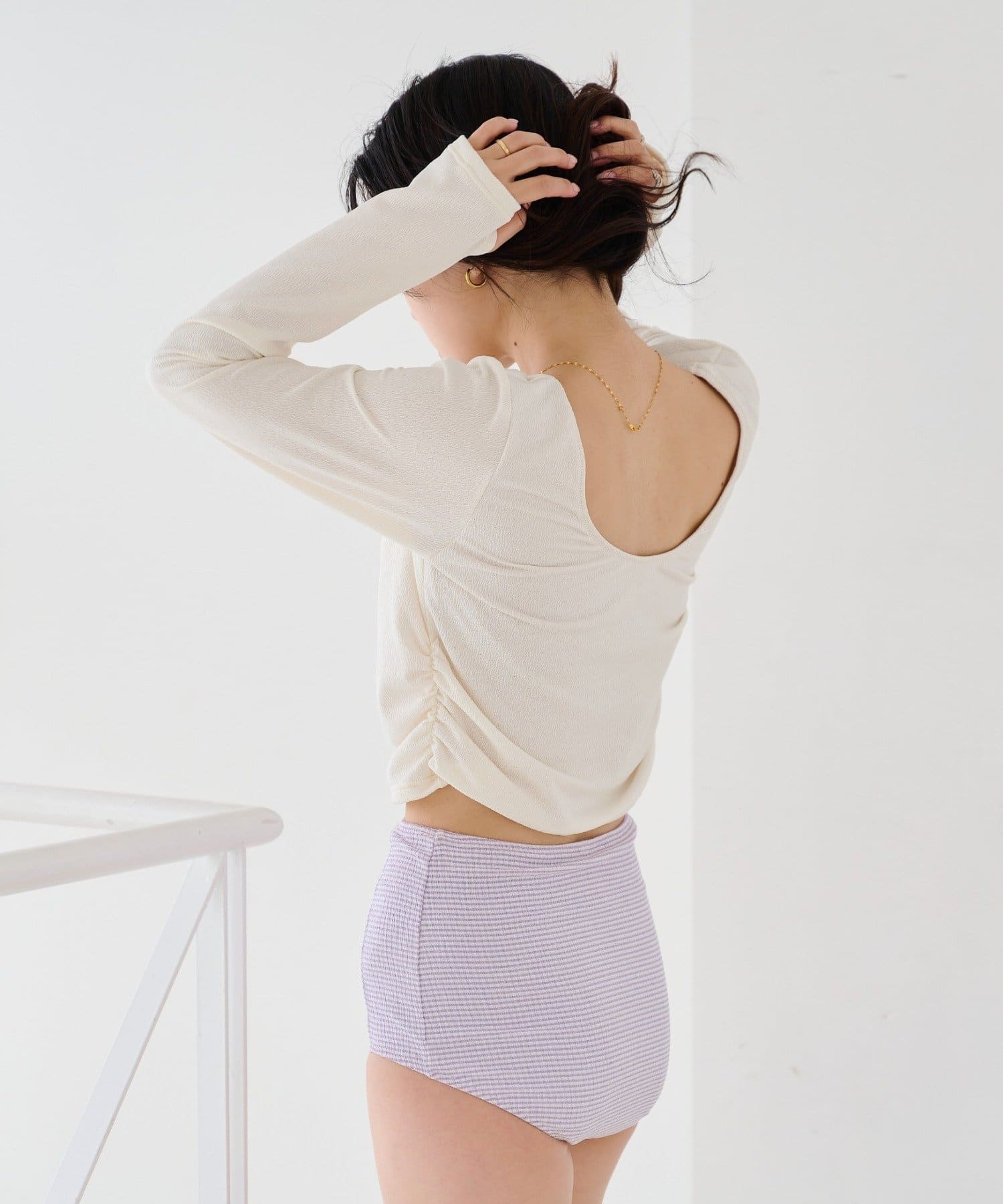 サイドにギャザーを寄せることで、さりげなくくメリハリを加えた大人っぽい印象に。
