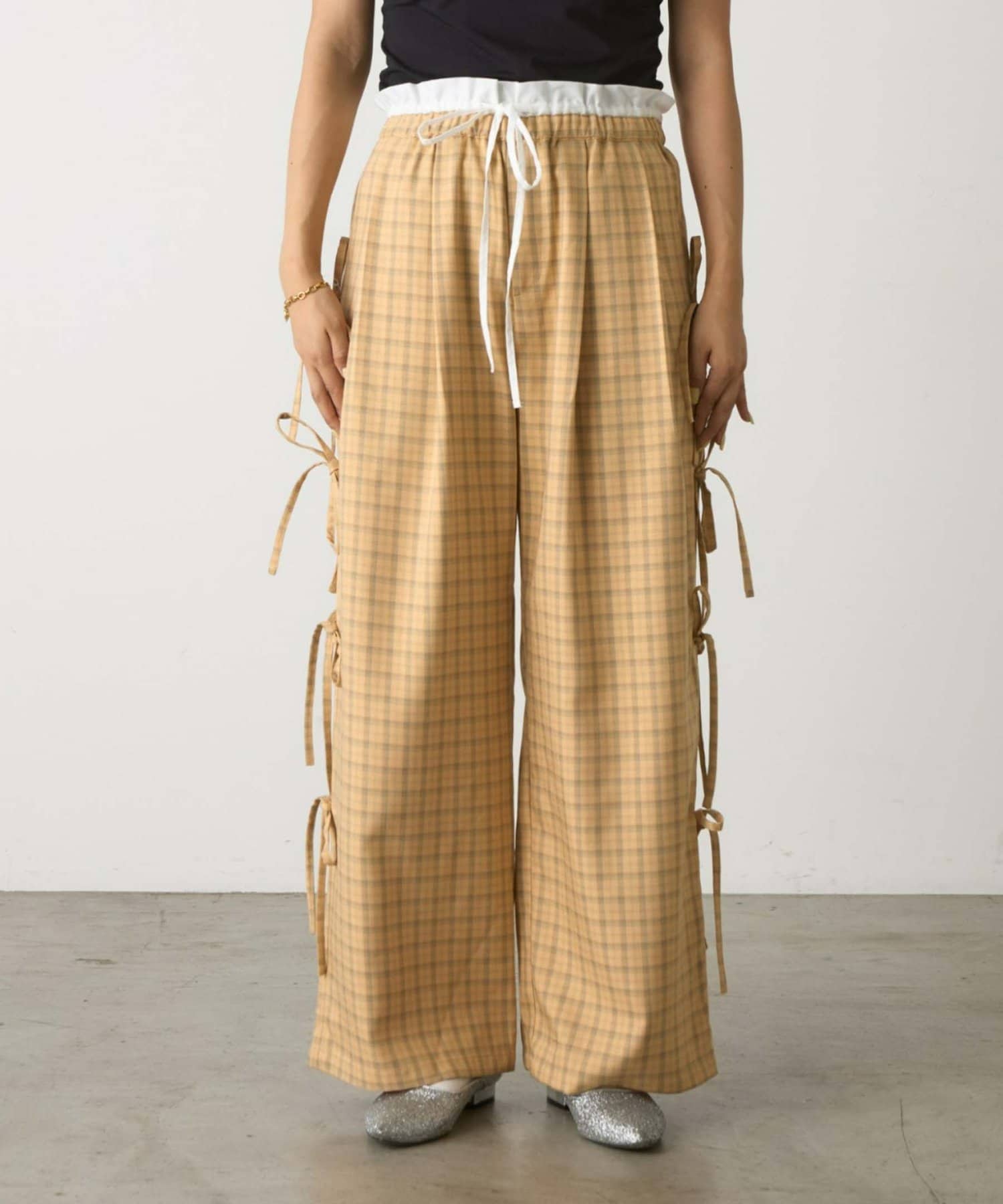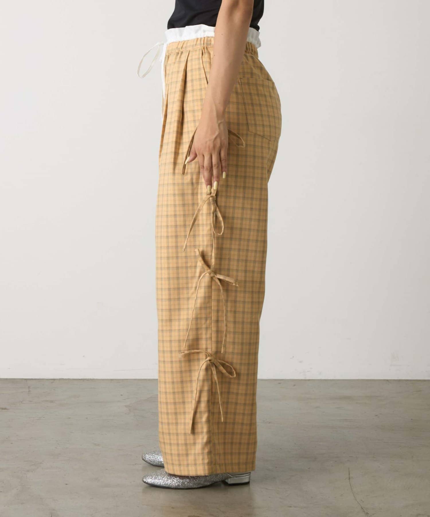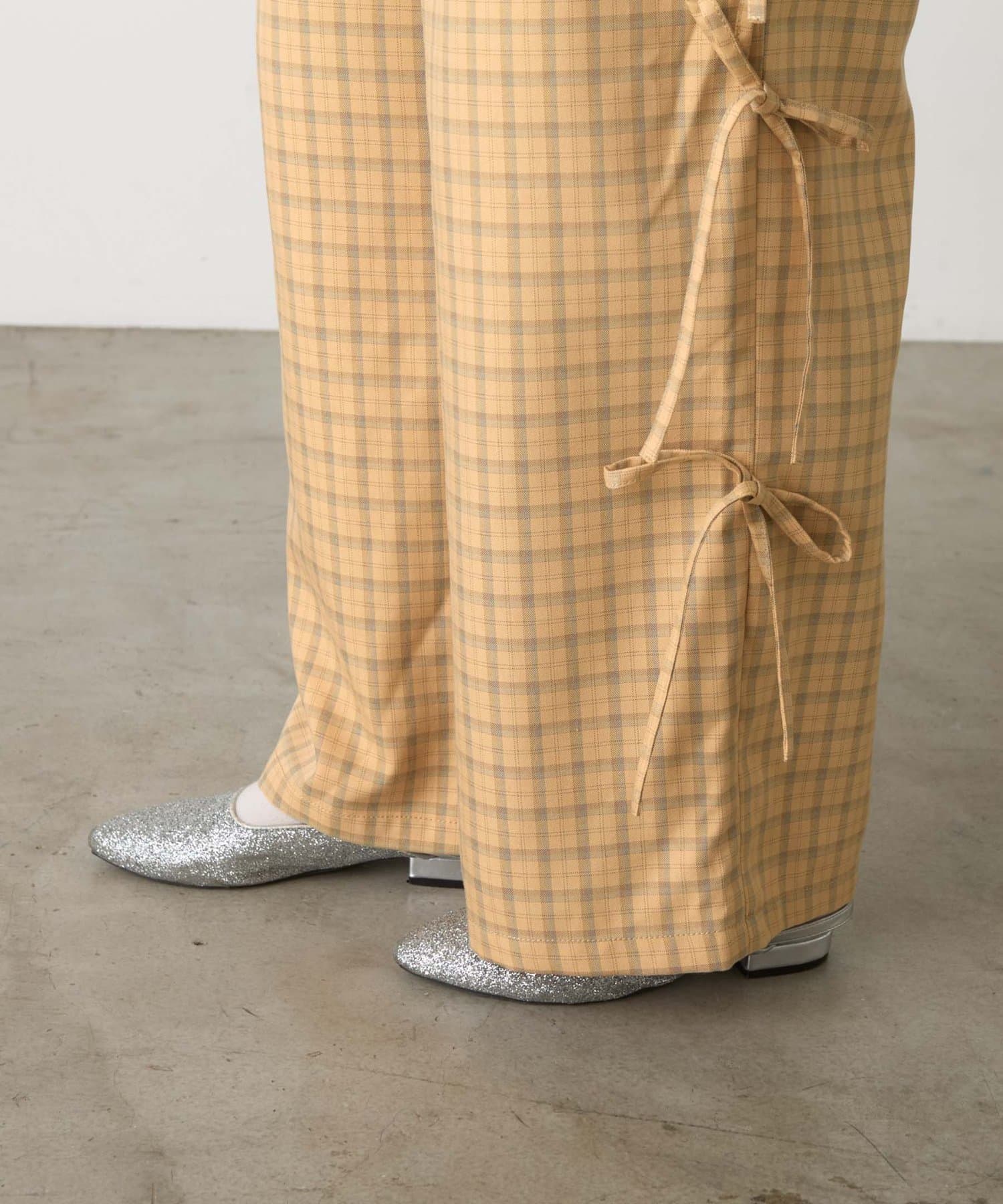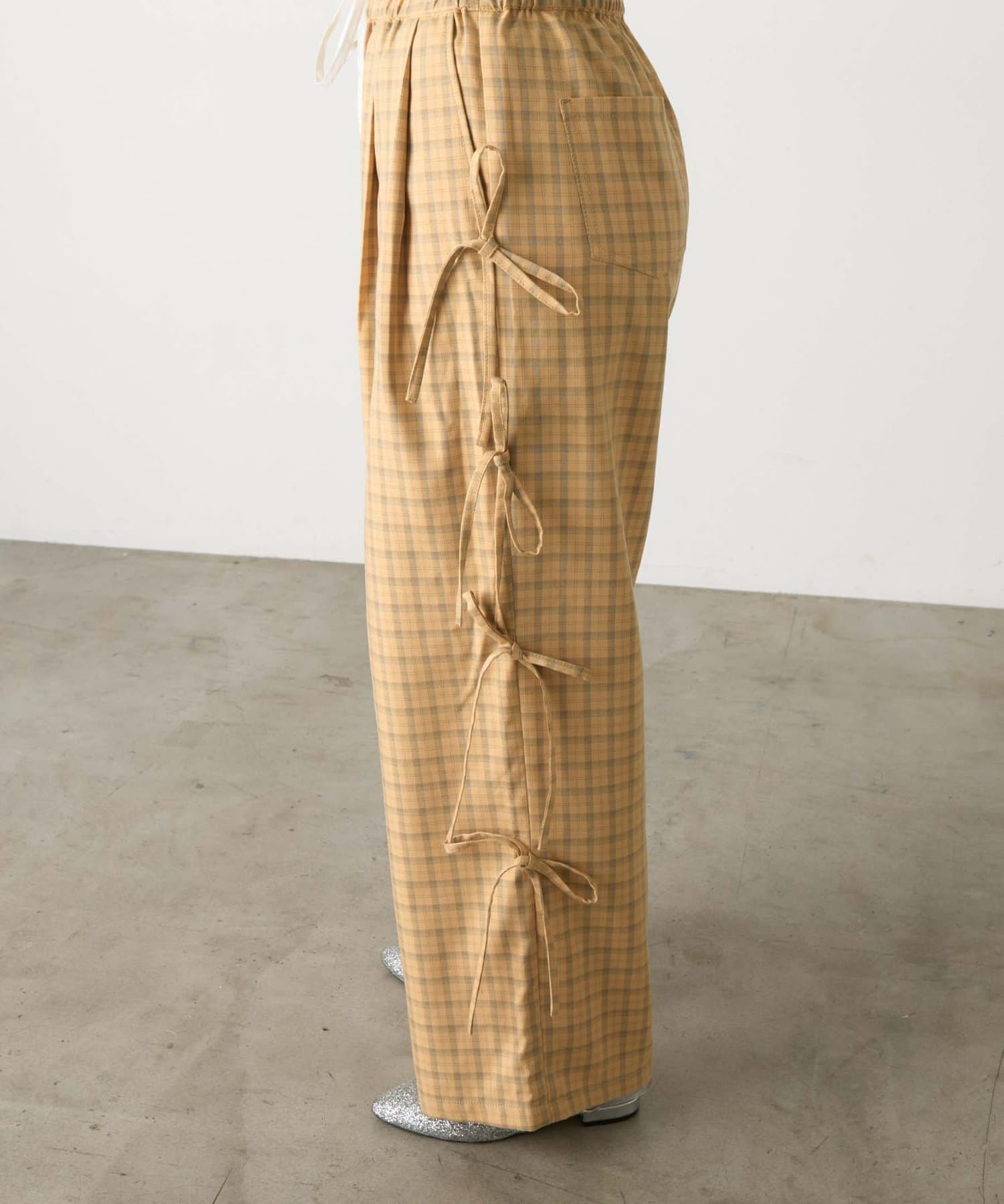 サイドにあしらわれたリボンが目を惹くチェックパンツ。