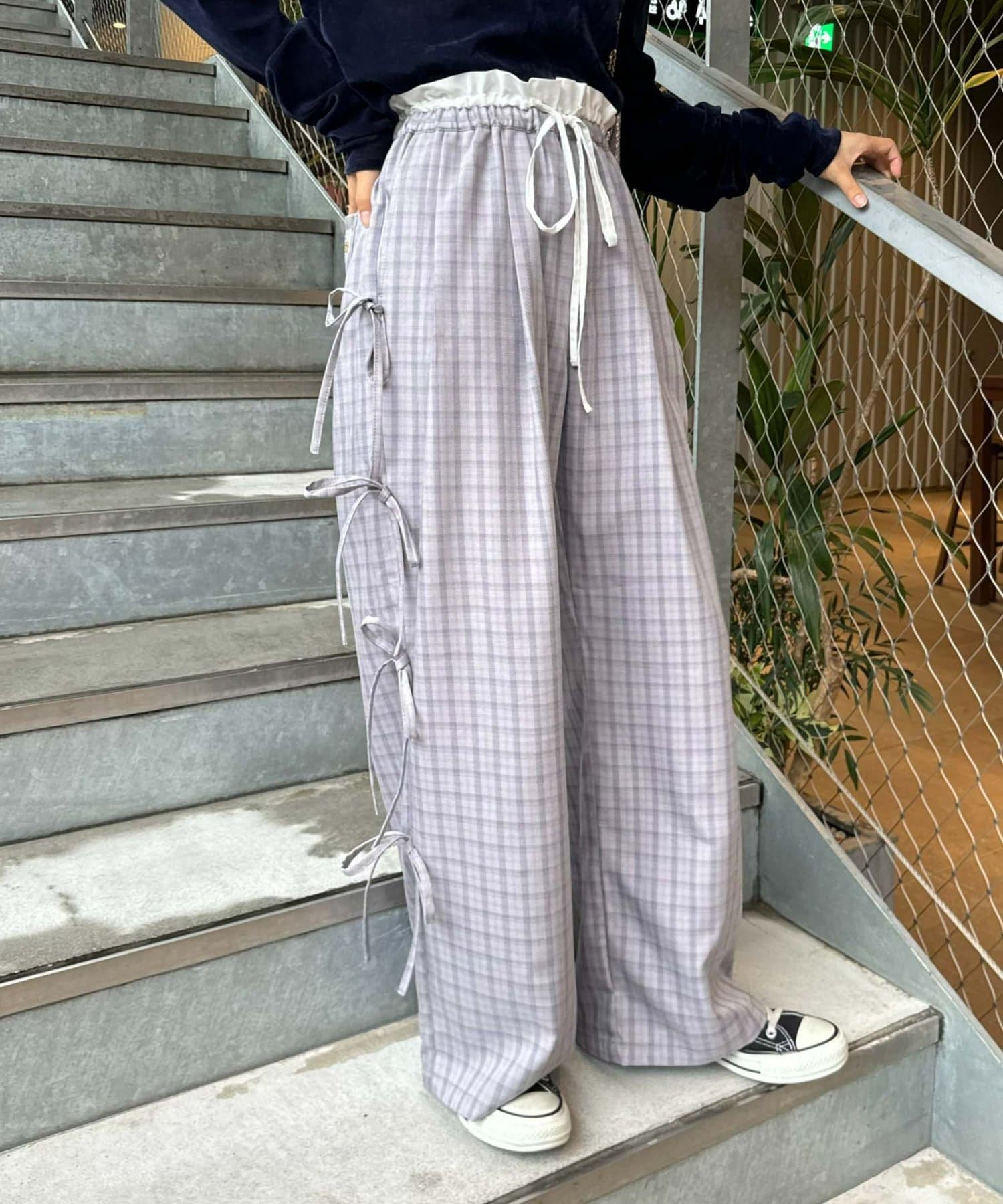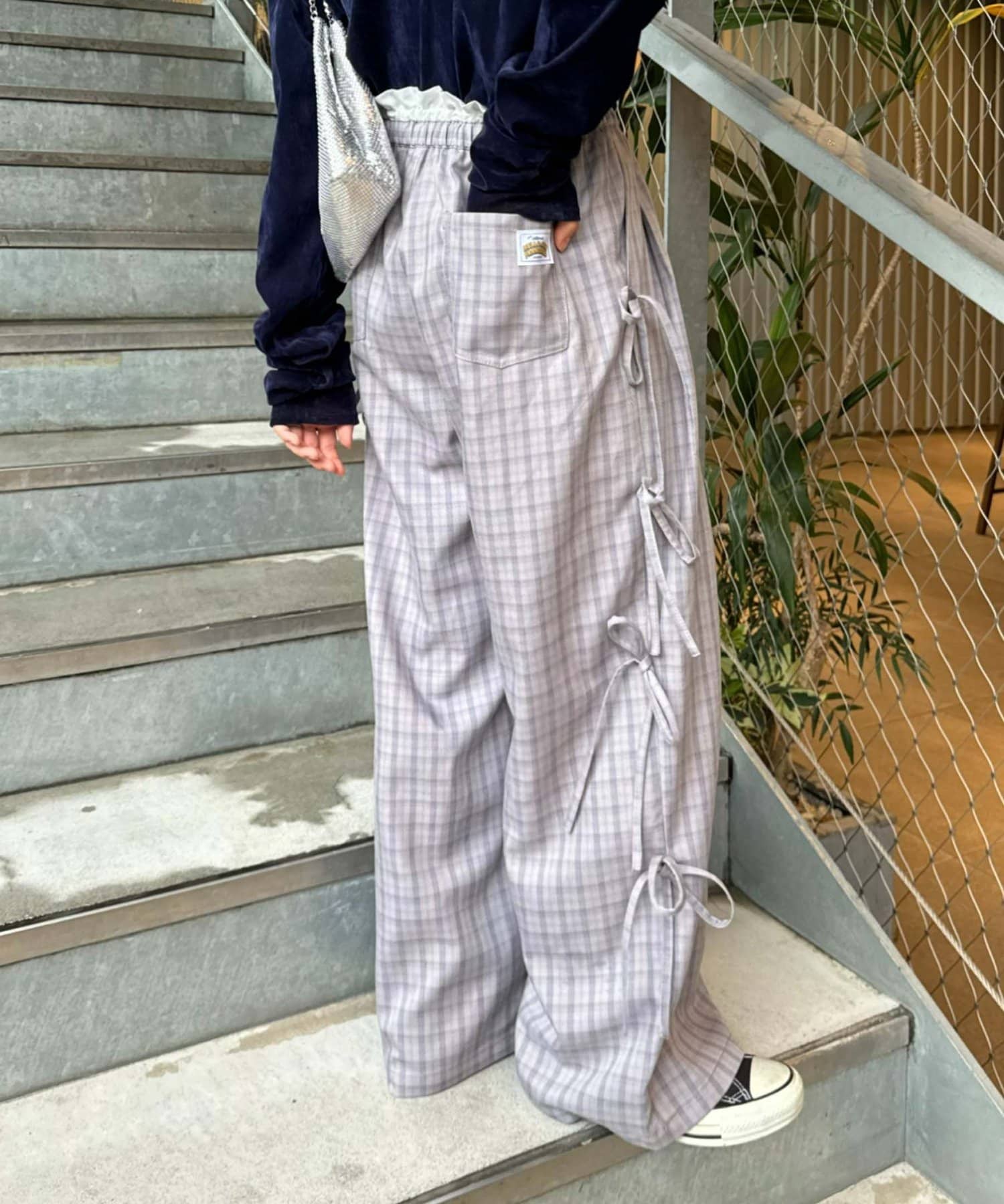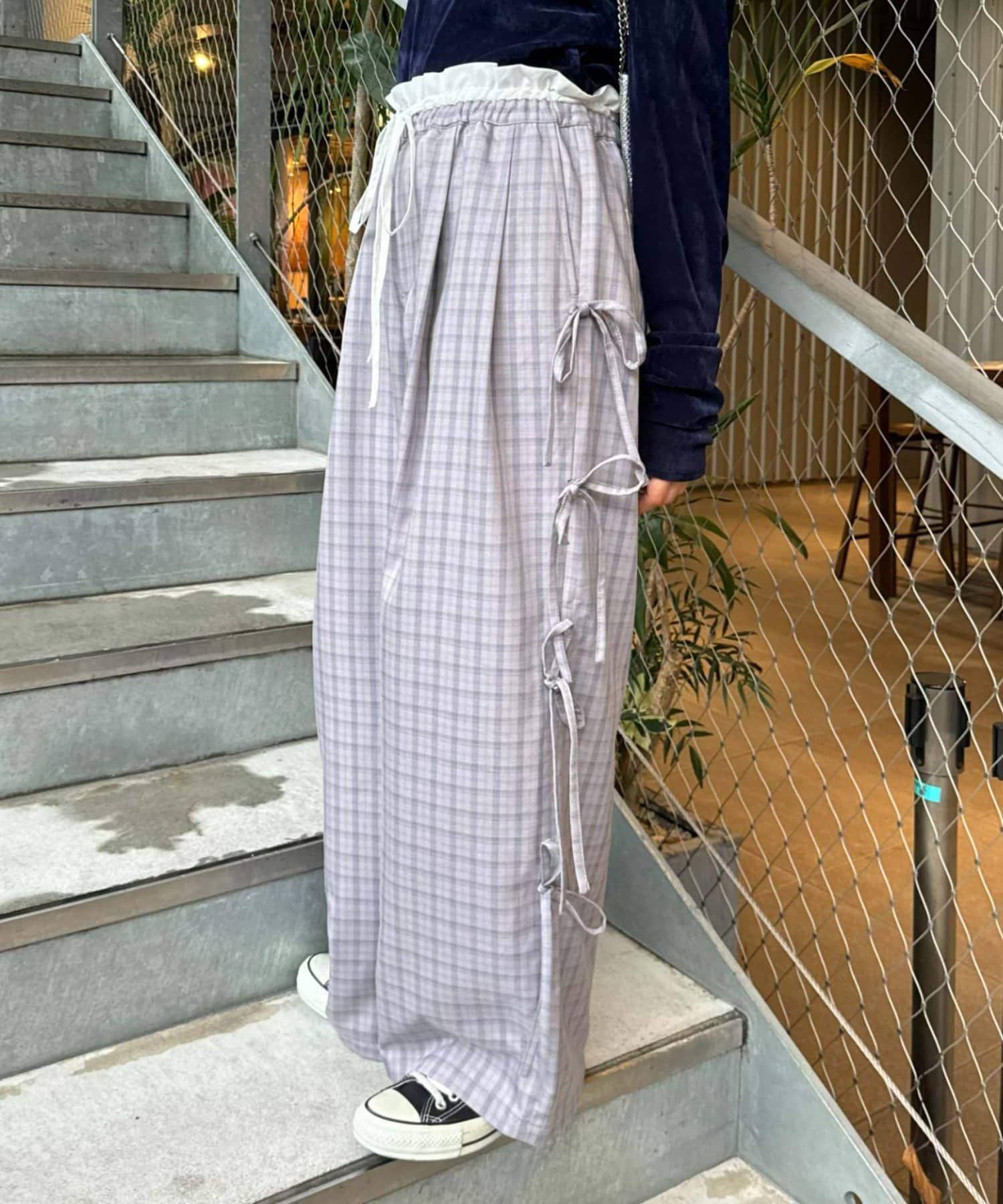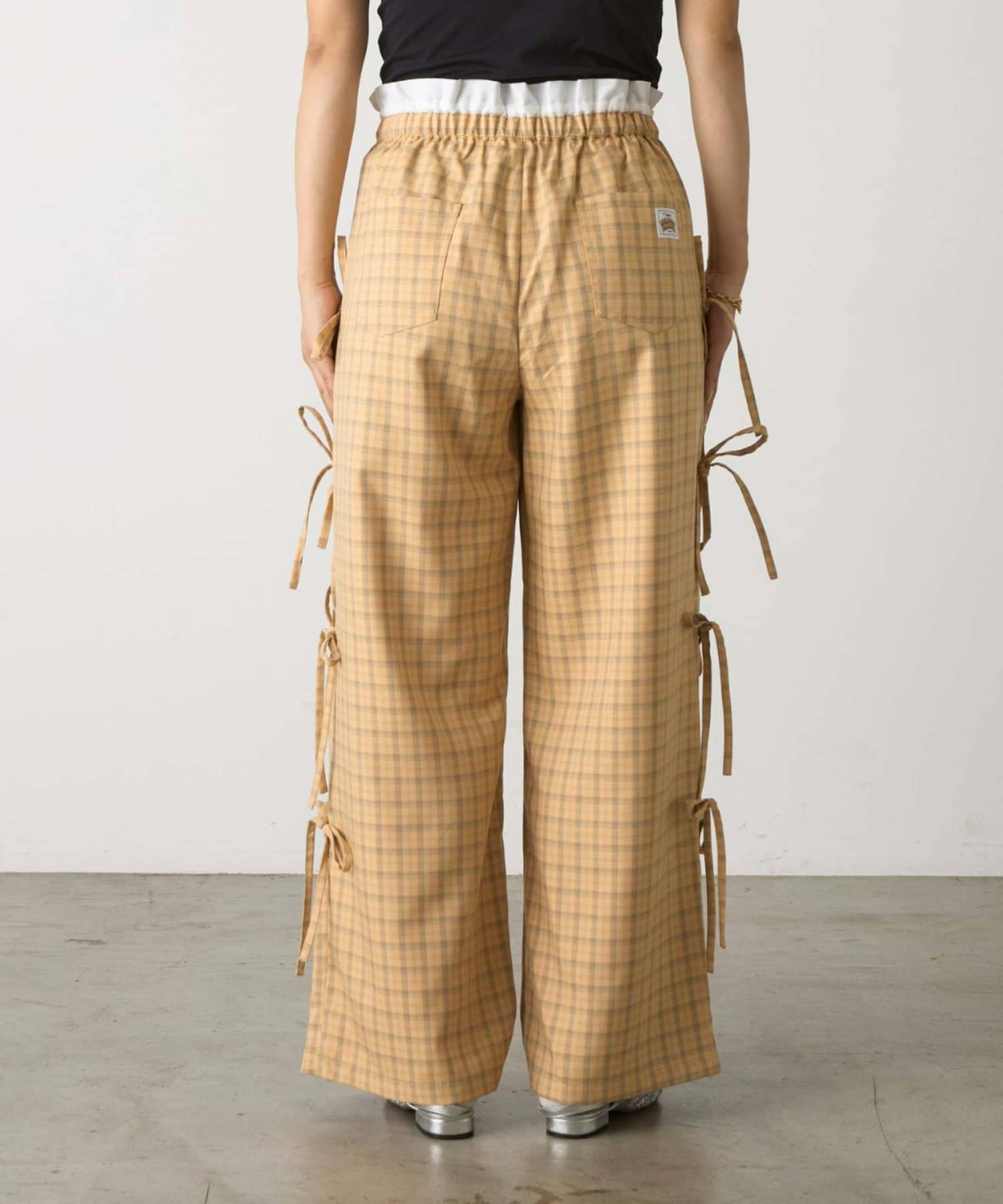 サイドにあしらわれたリボンが目を惹くチェックパンツ。