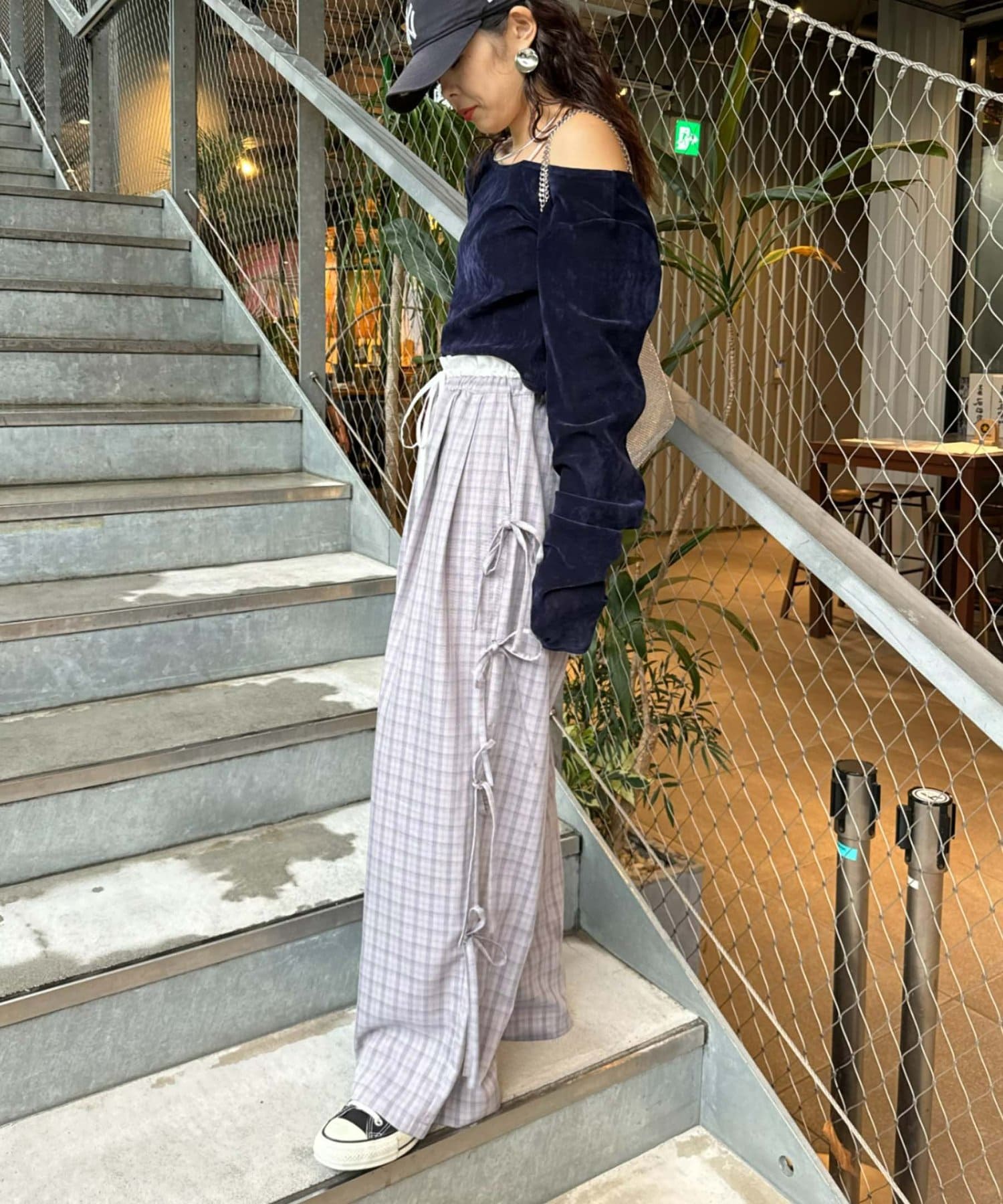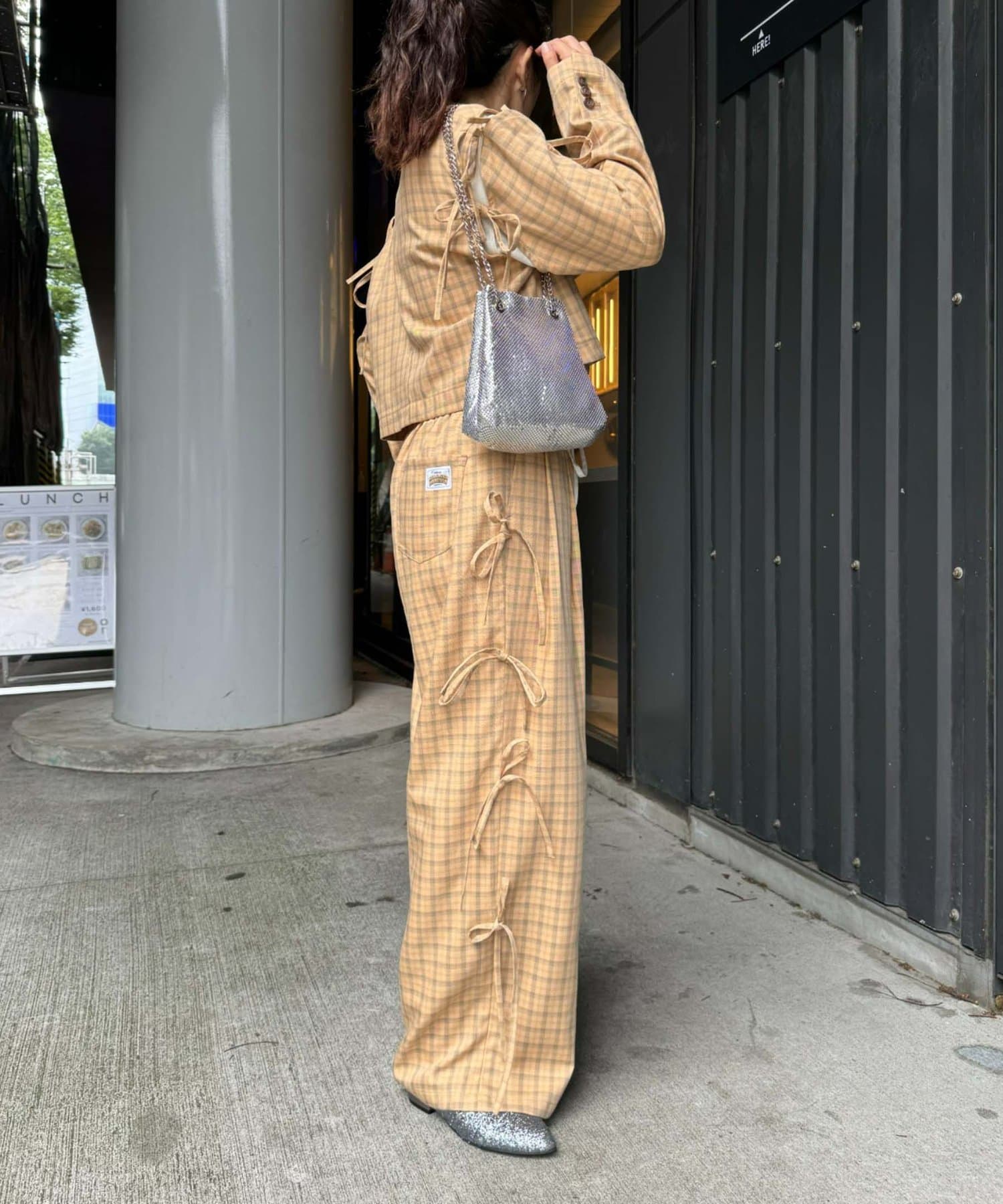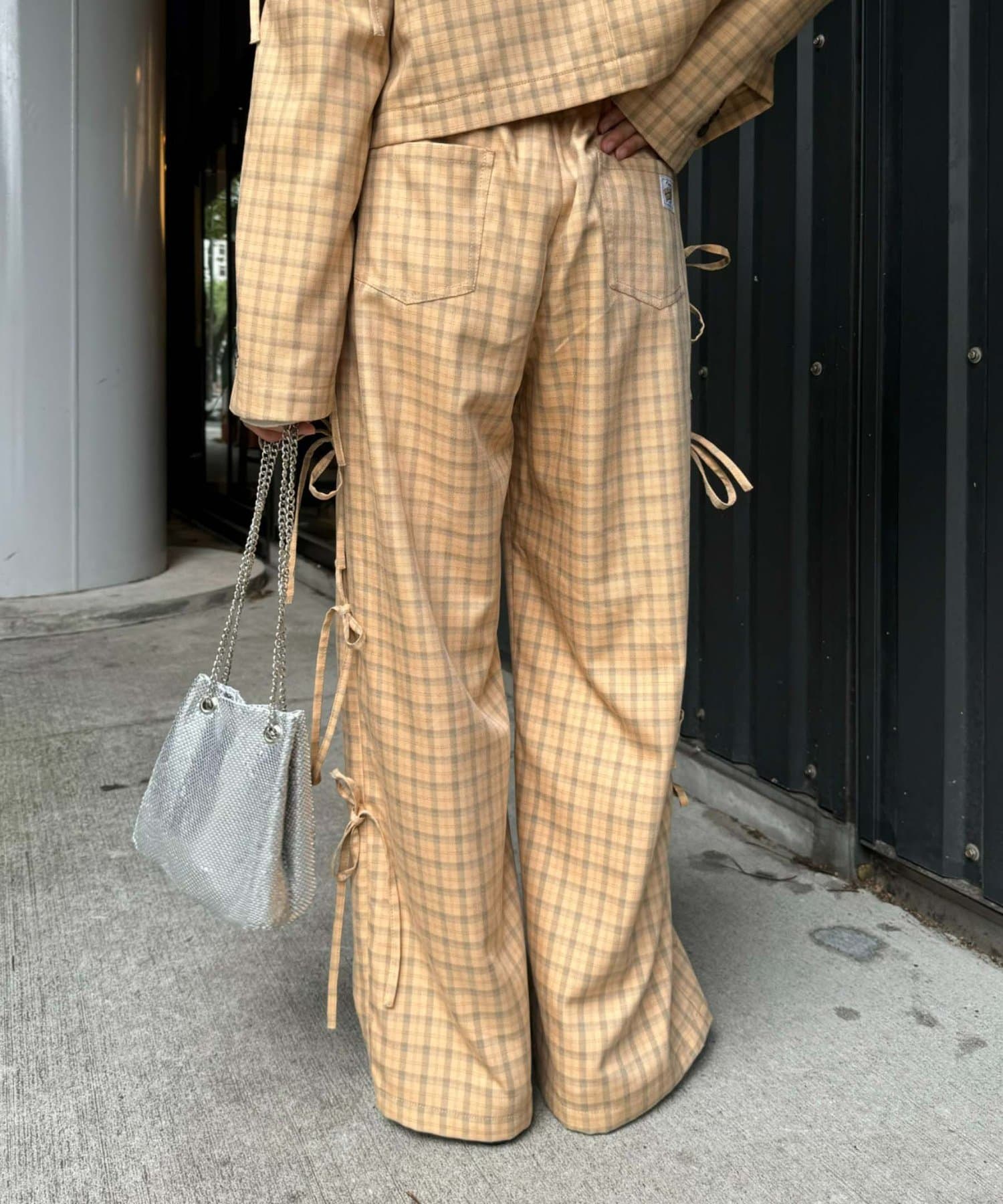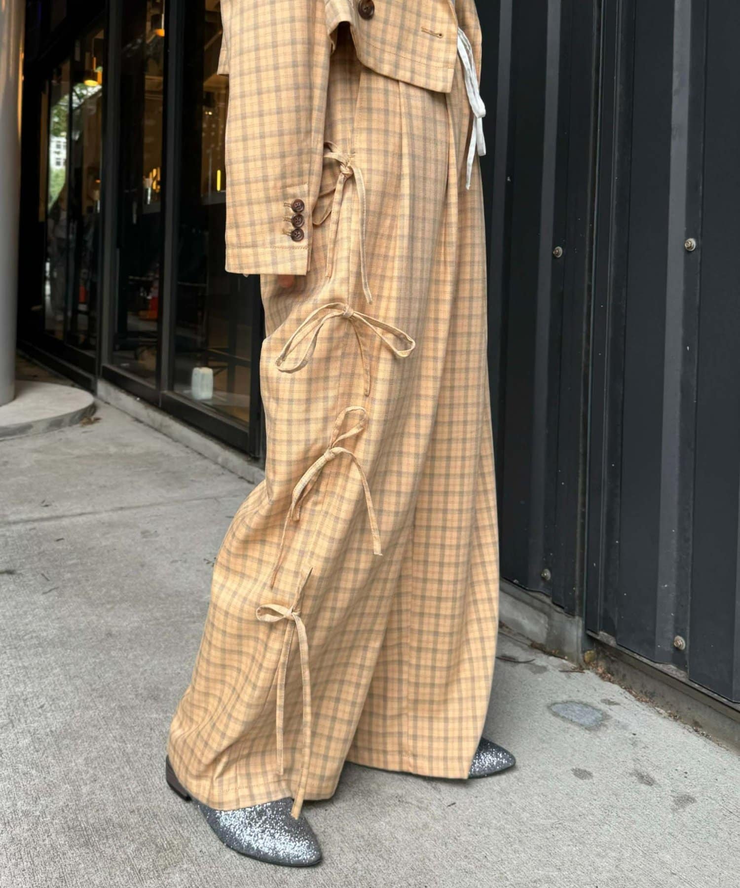 サイドにあしらわれたリボンが目を惹くチェックパンツ。