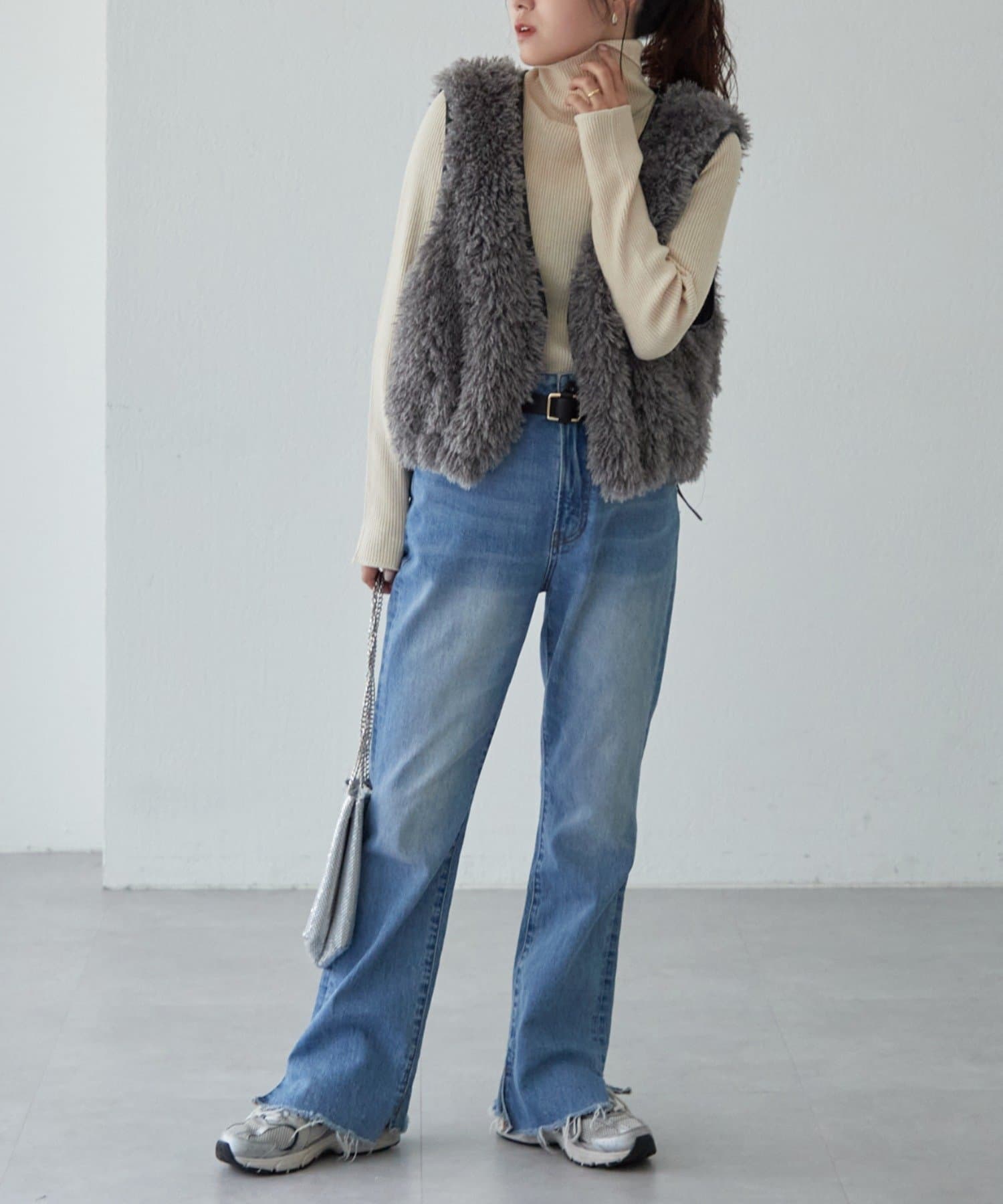 すっきりとしたシルエットのアイテムなので、ボトムにインして合わせるのがおすすめです。