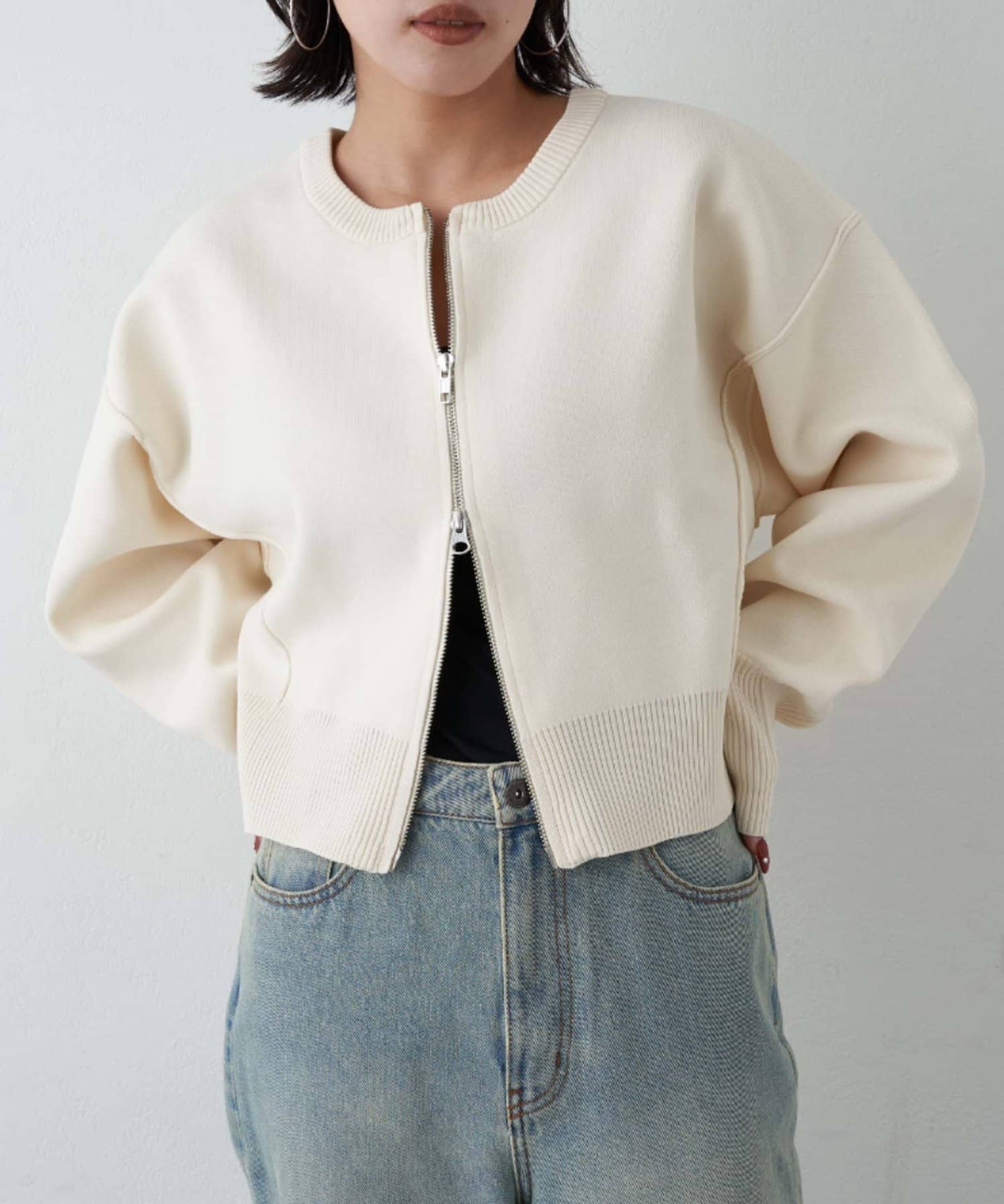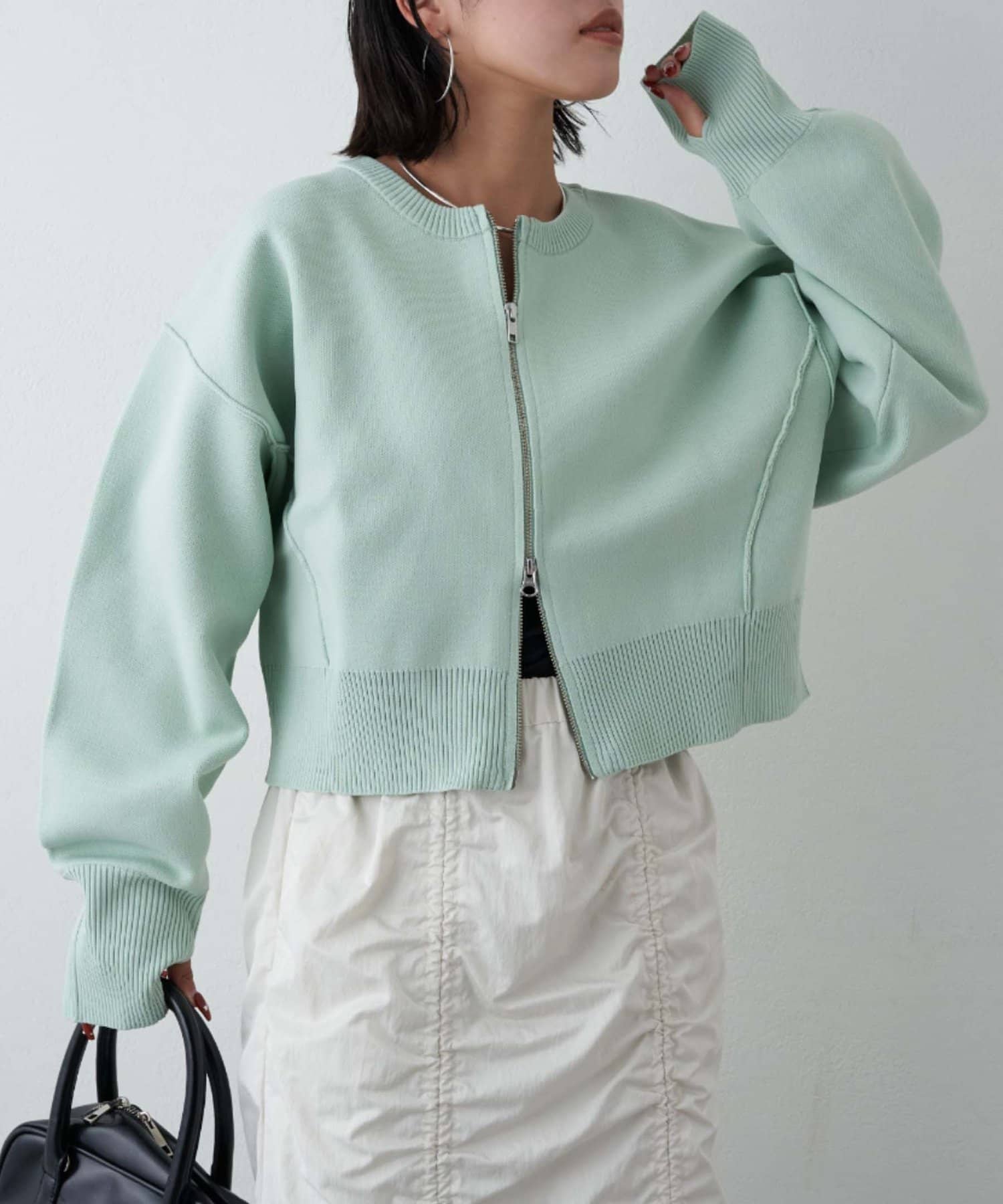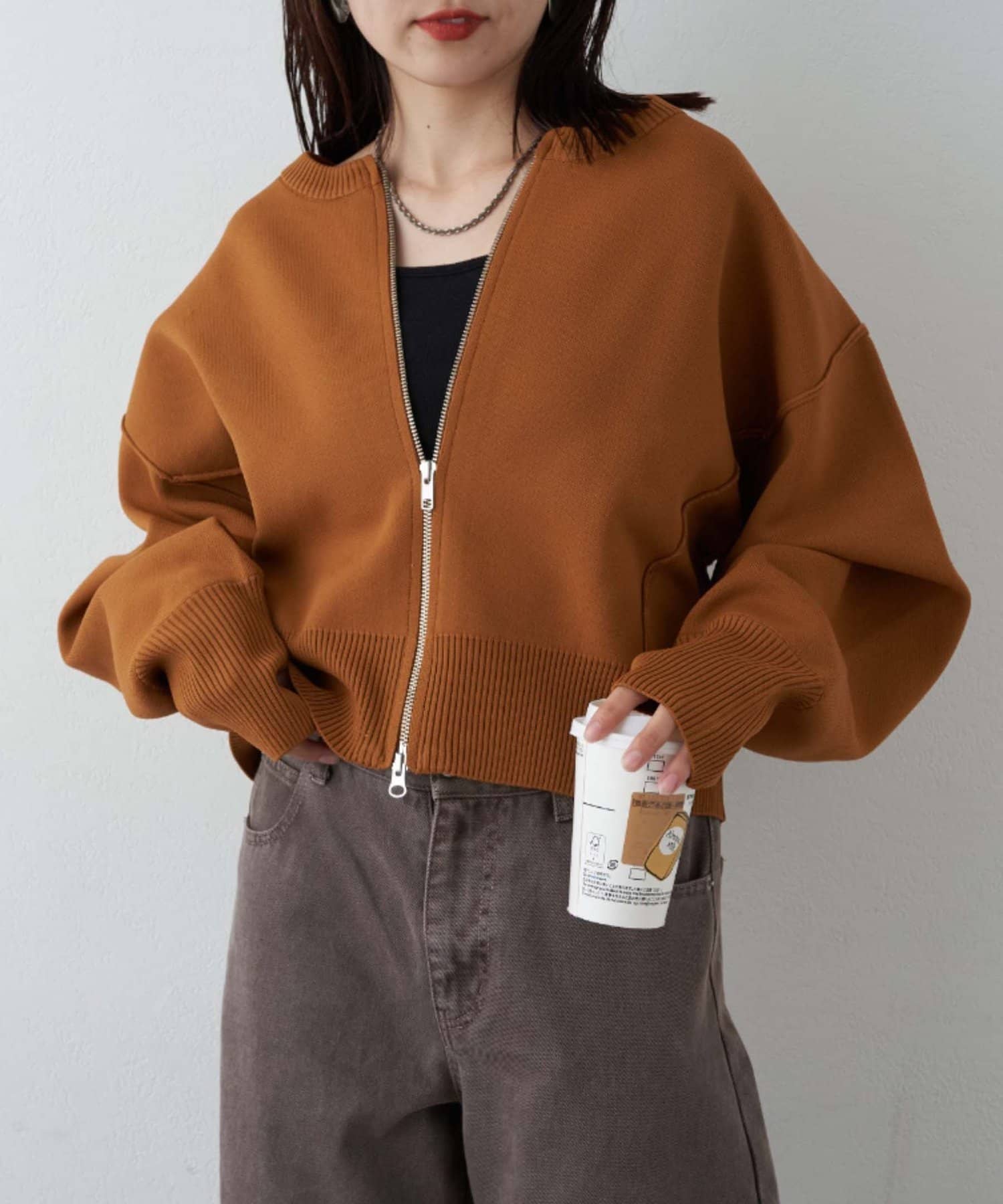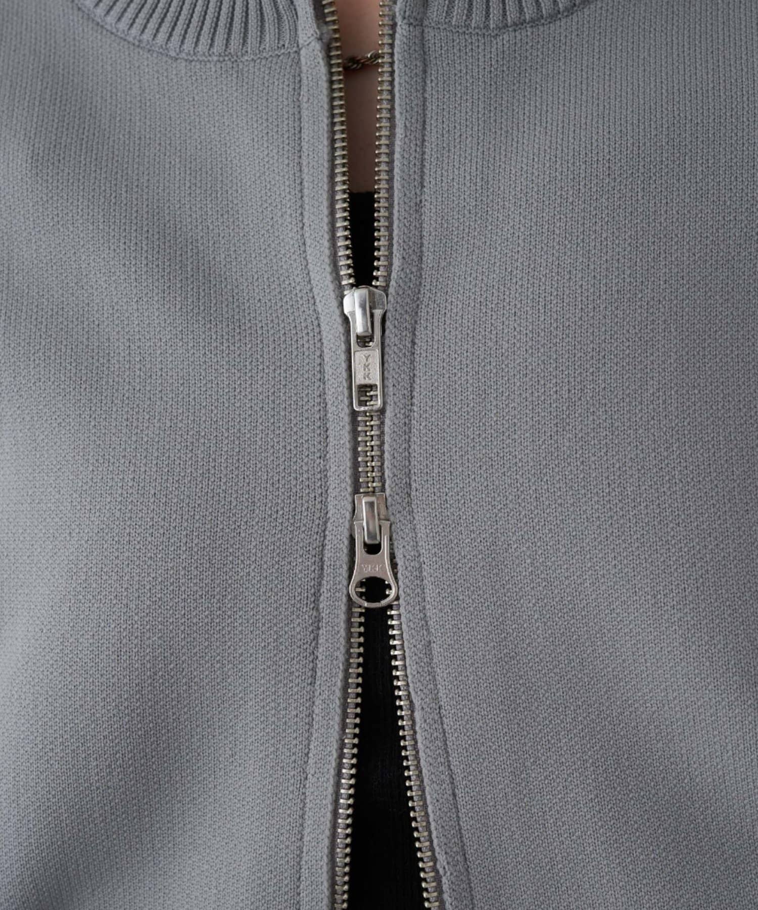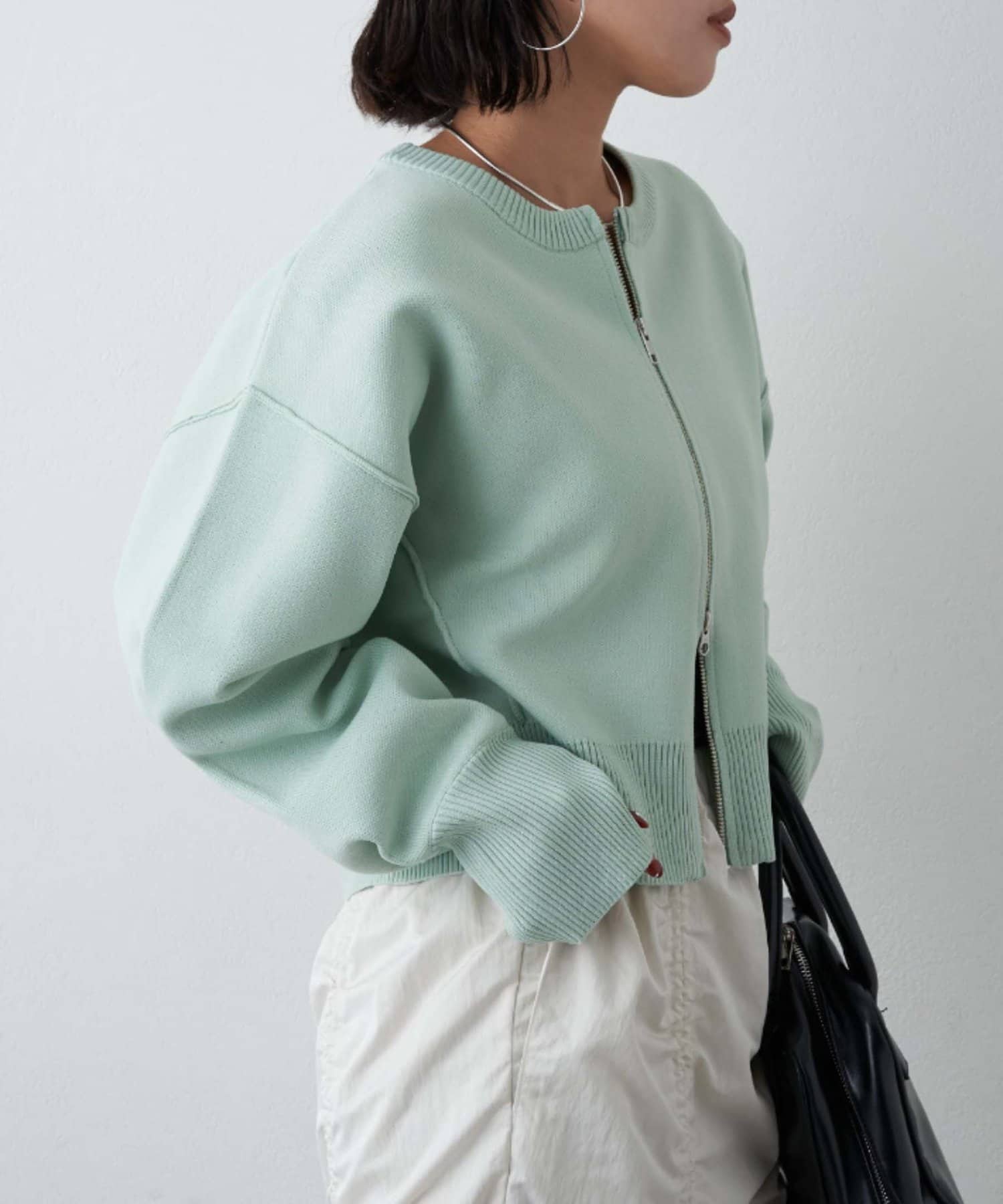 上下どちらも開くダブルジップが特徴のニットカーディガン。