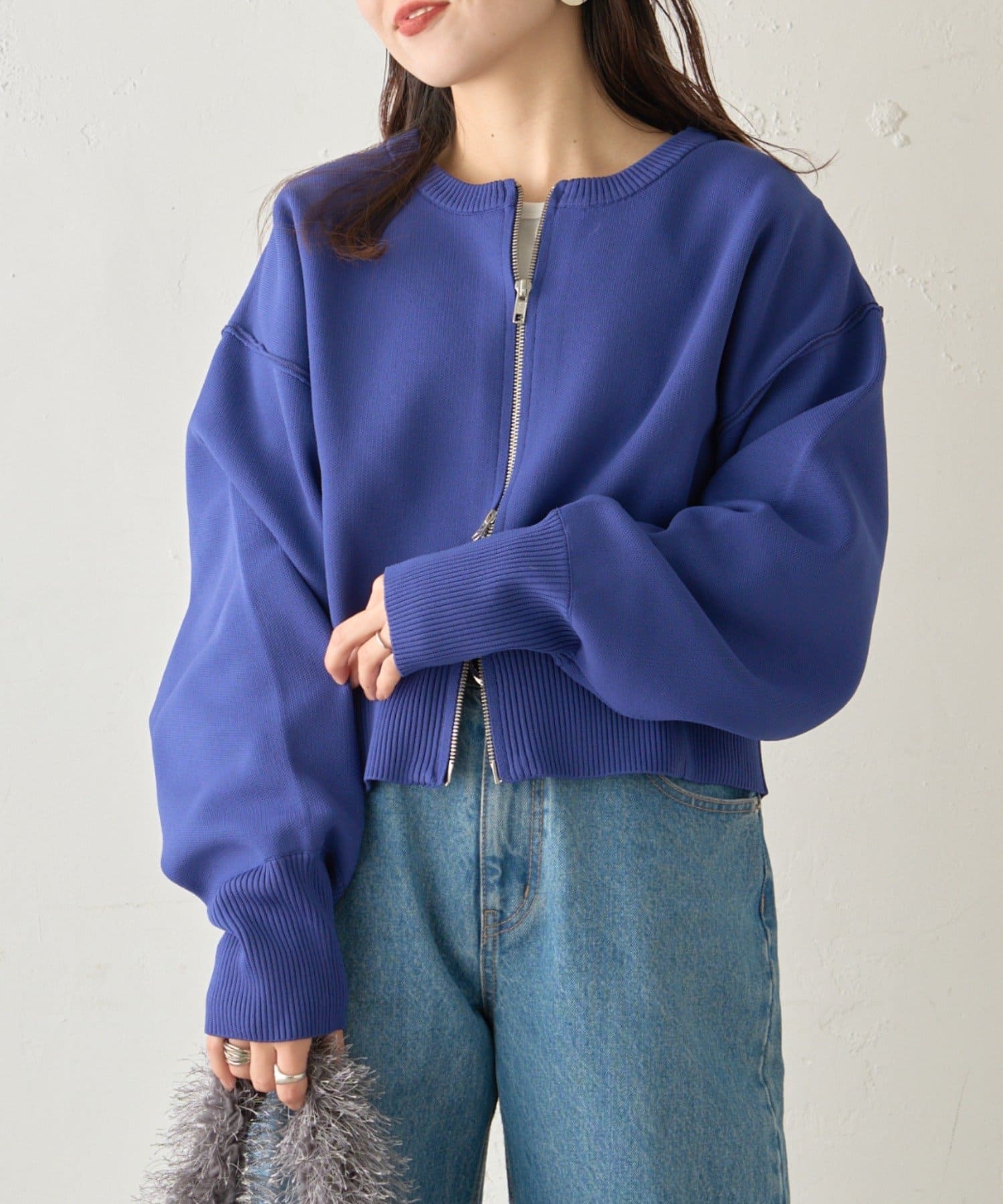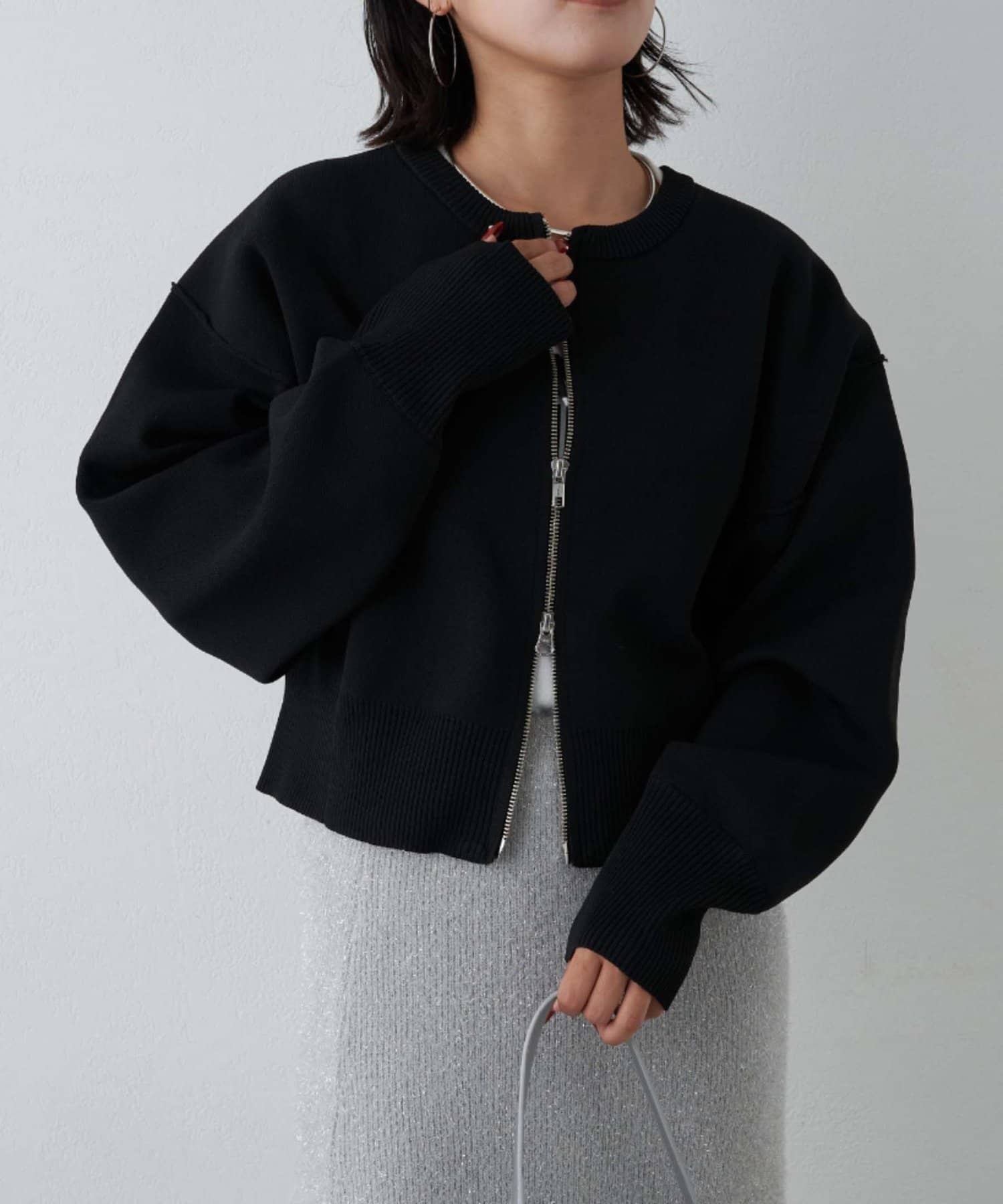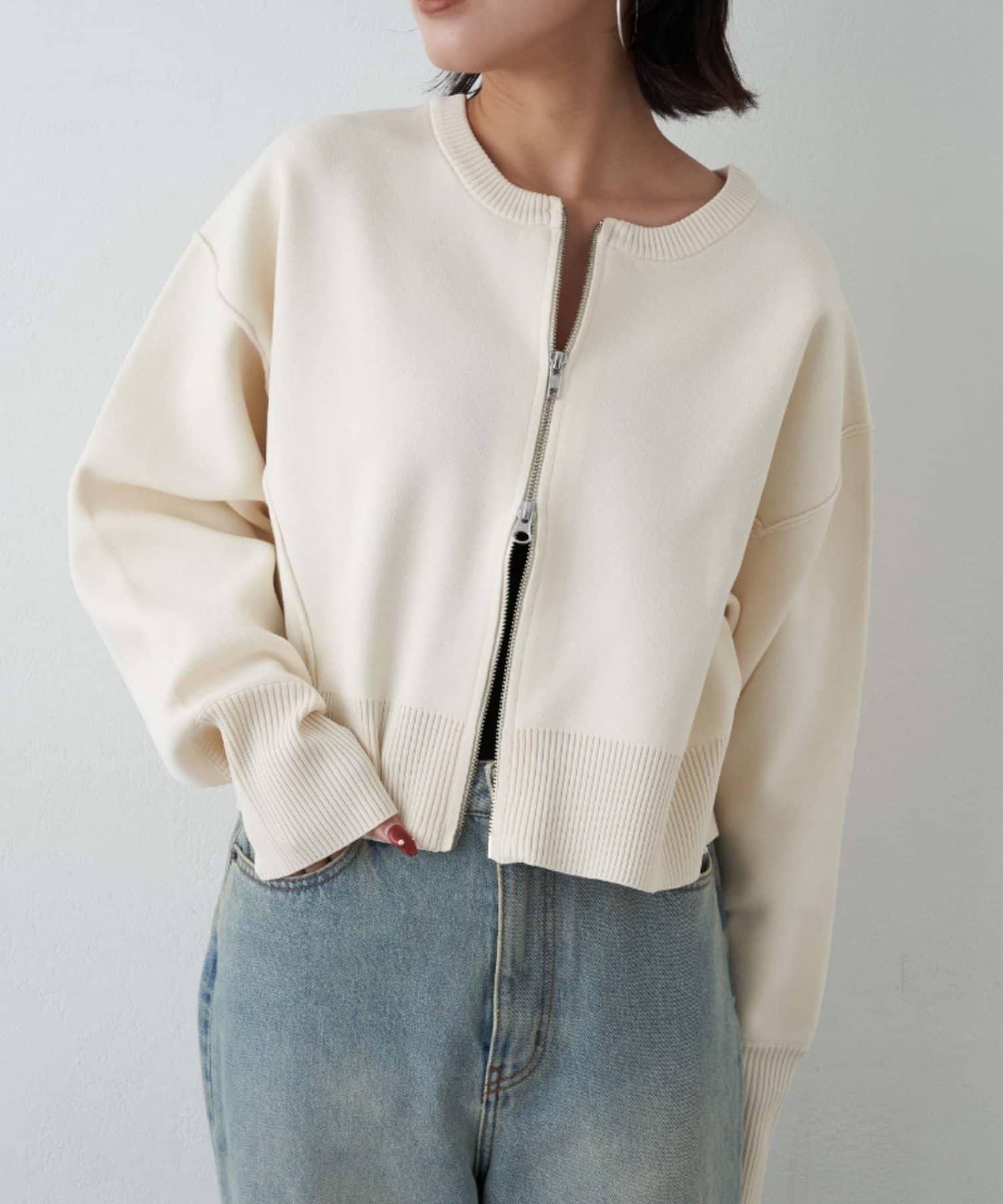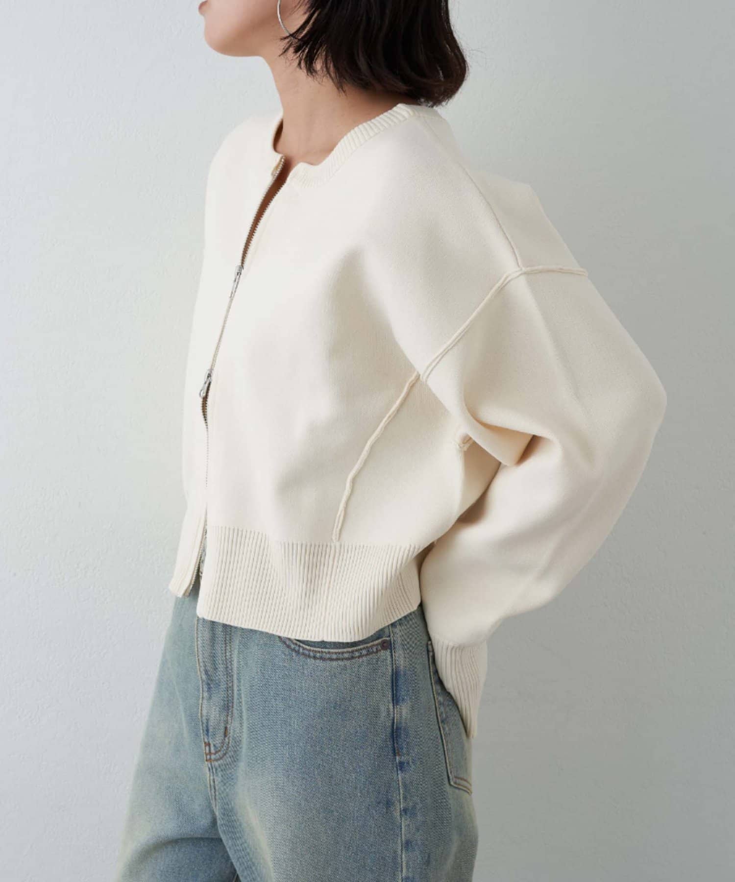 上下どちらも開くダブルジップが特徴のニットカーディガン。