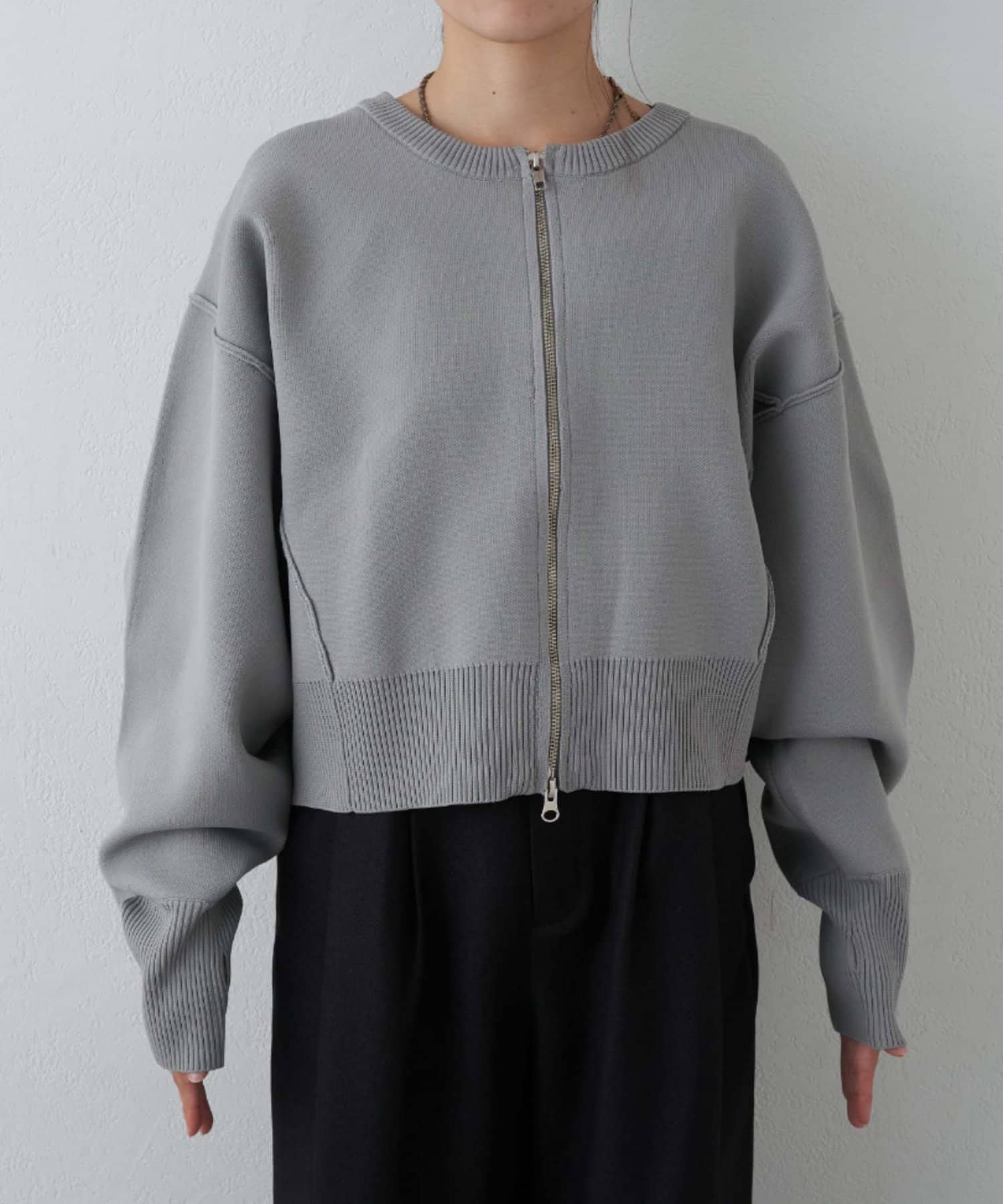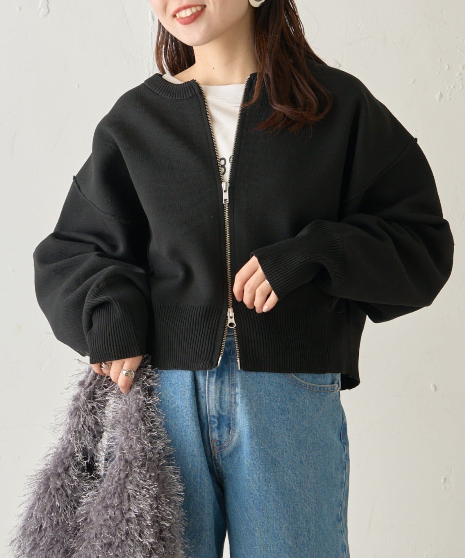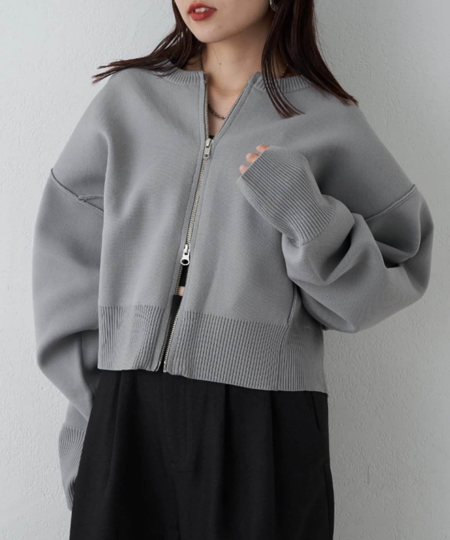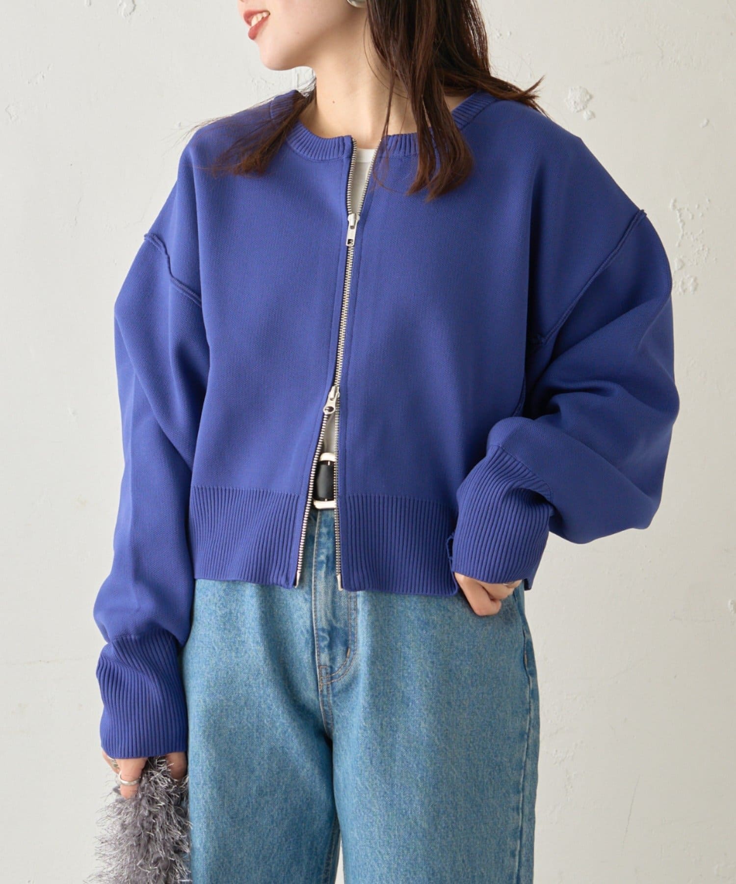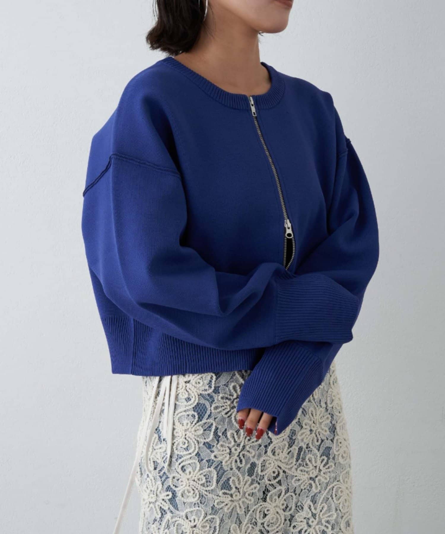 上下どちらも開くダブルジップが特徴のニットカーディガン。