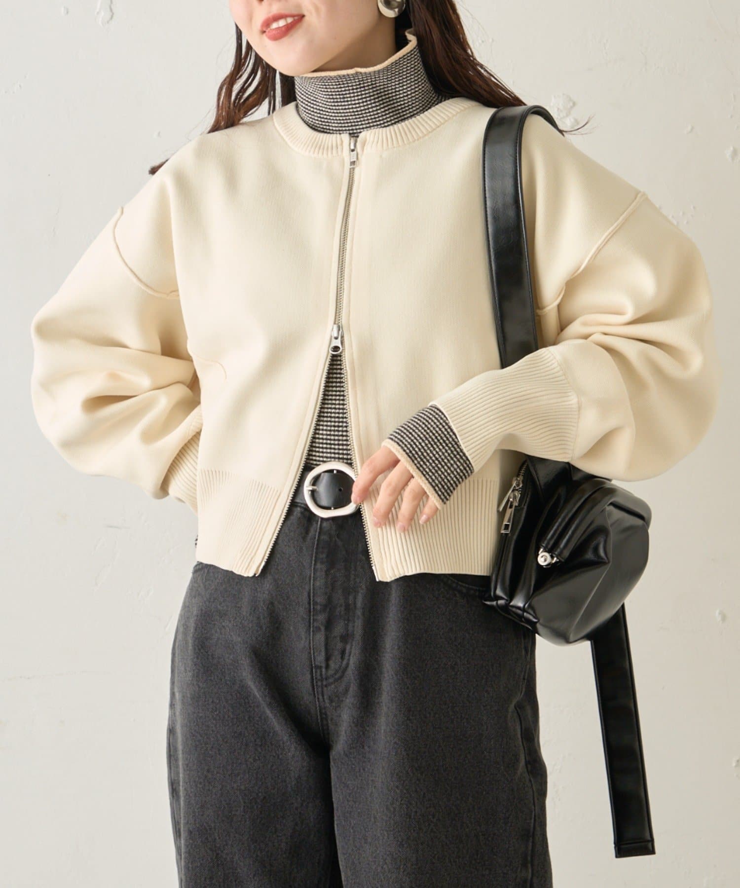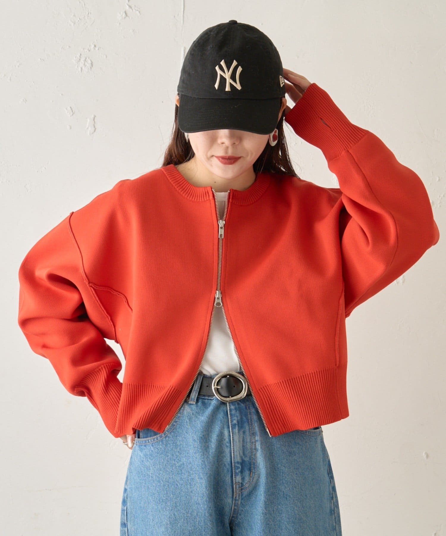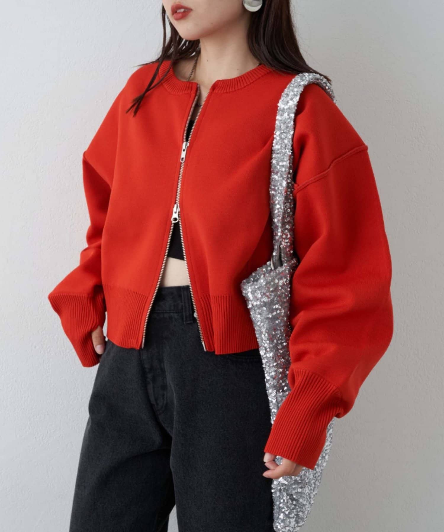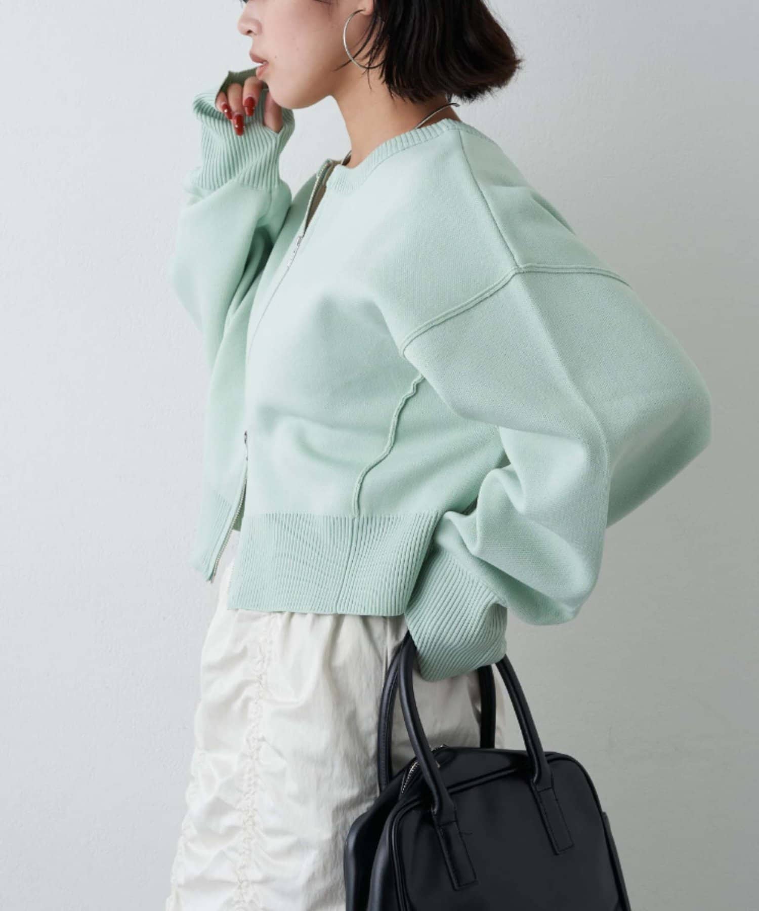 上下どちらも開くダブルジップが特徴のニットカーディガン。