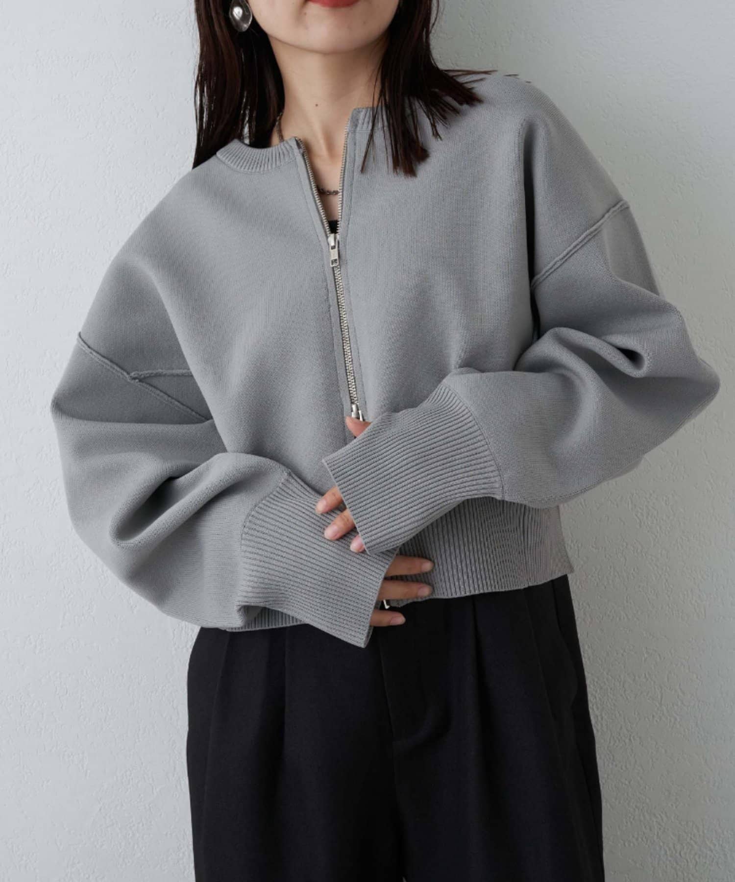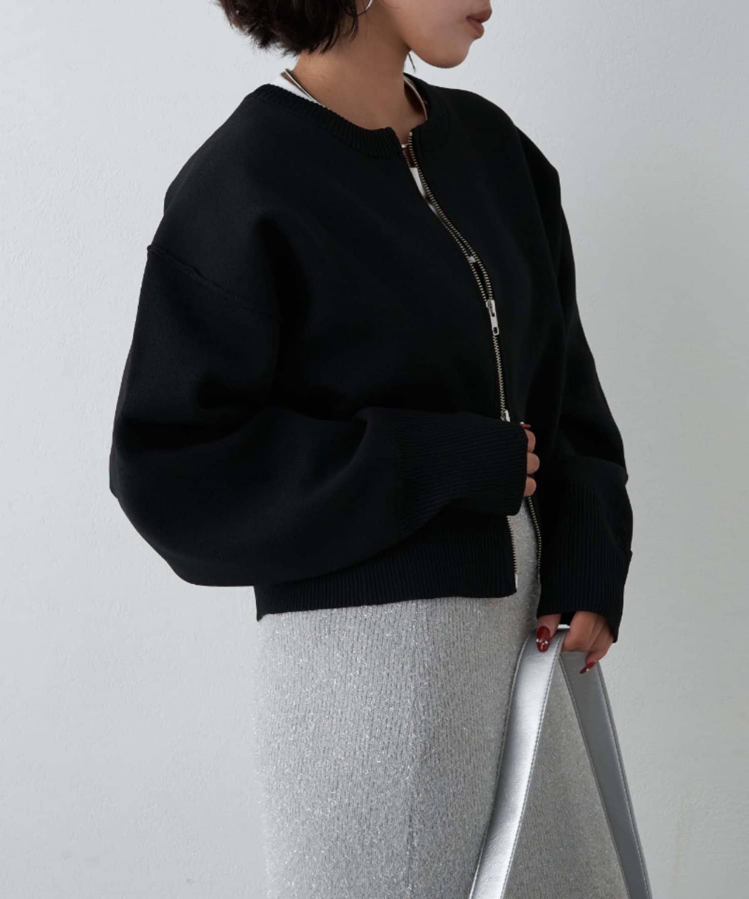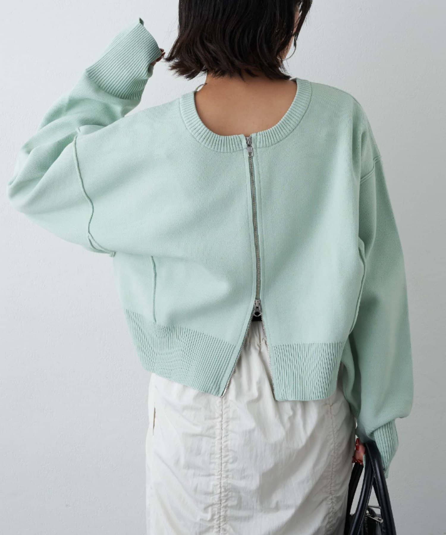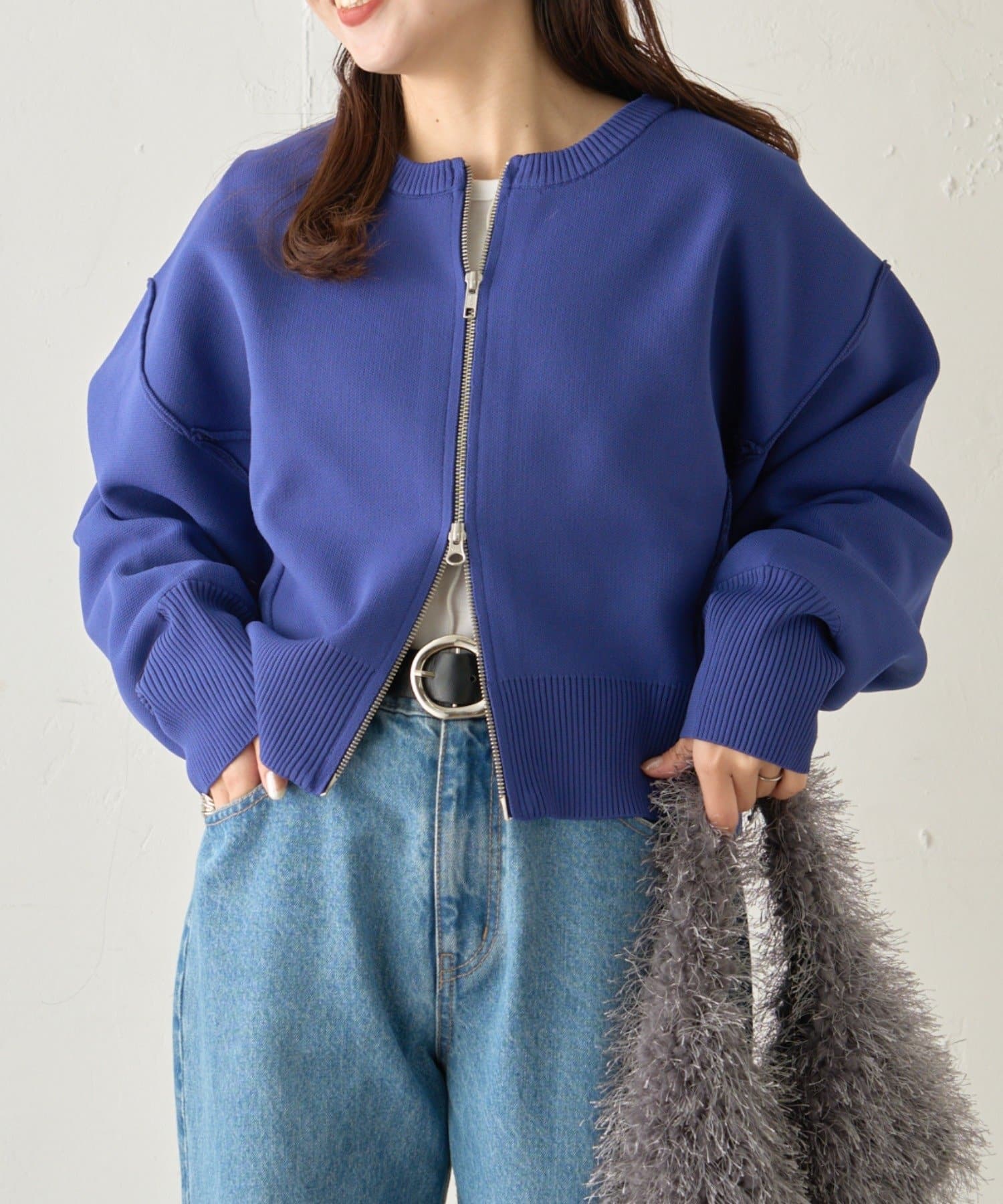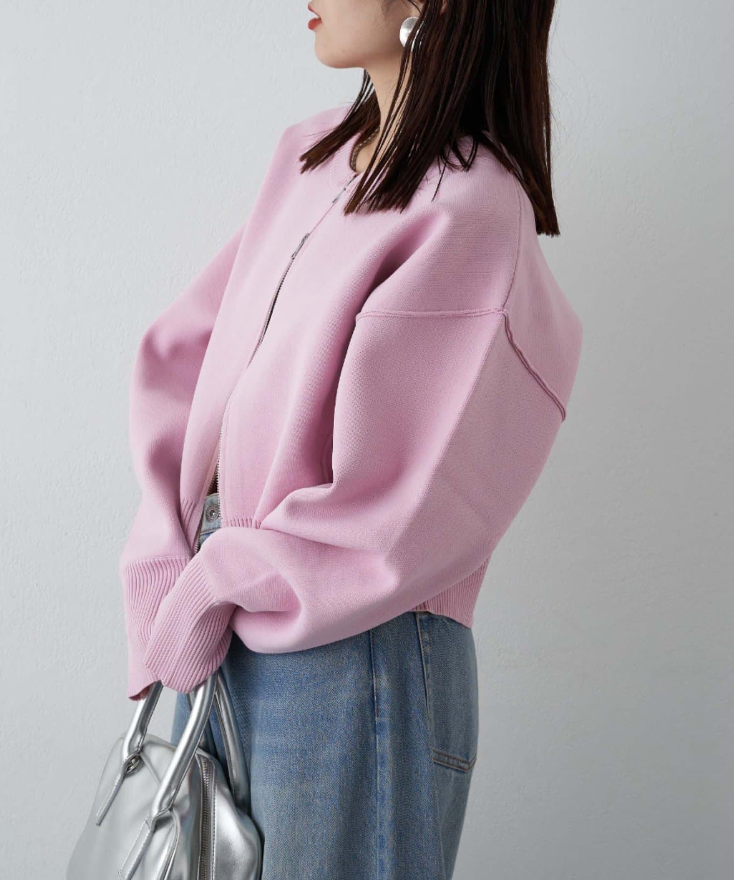 上下どちらも開くダブルジップが特徴のニットカーディガン。