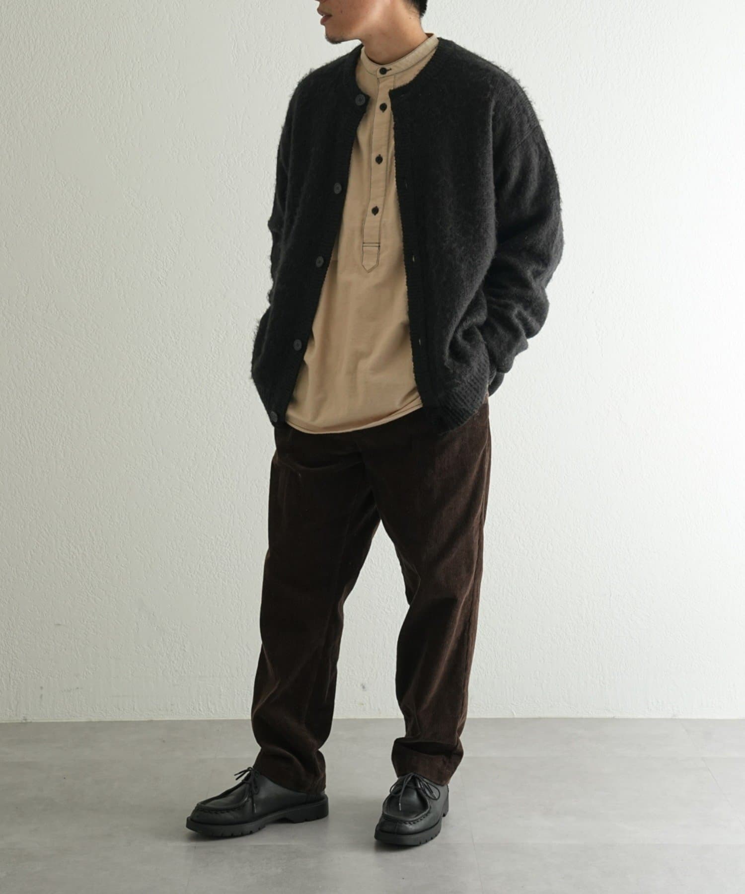 身幅にゆとりがあるオーバーサイズなので、スウェットなど厚手のアイテムとのレイヤードもしていただけます。