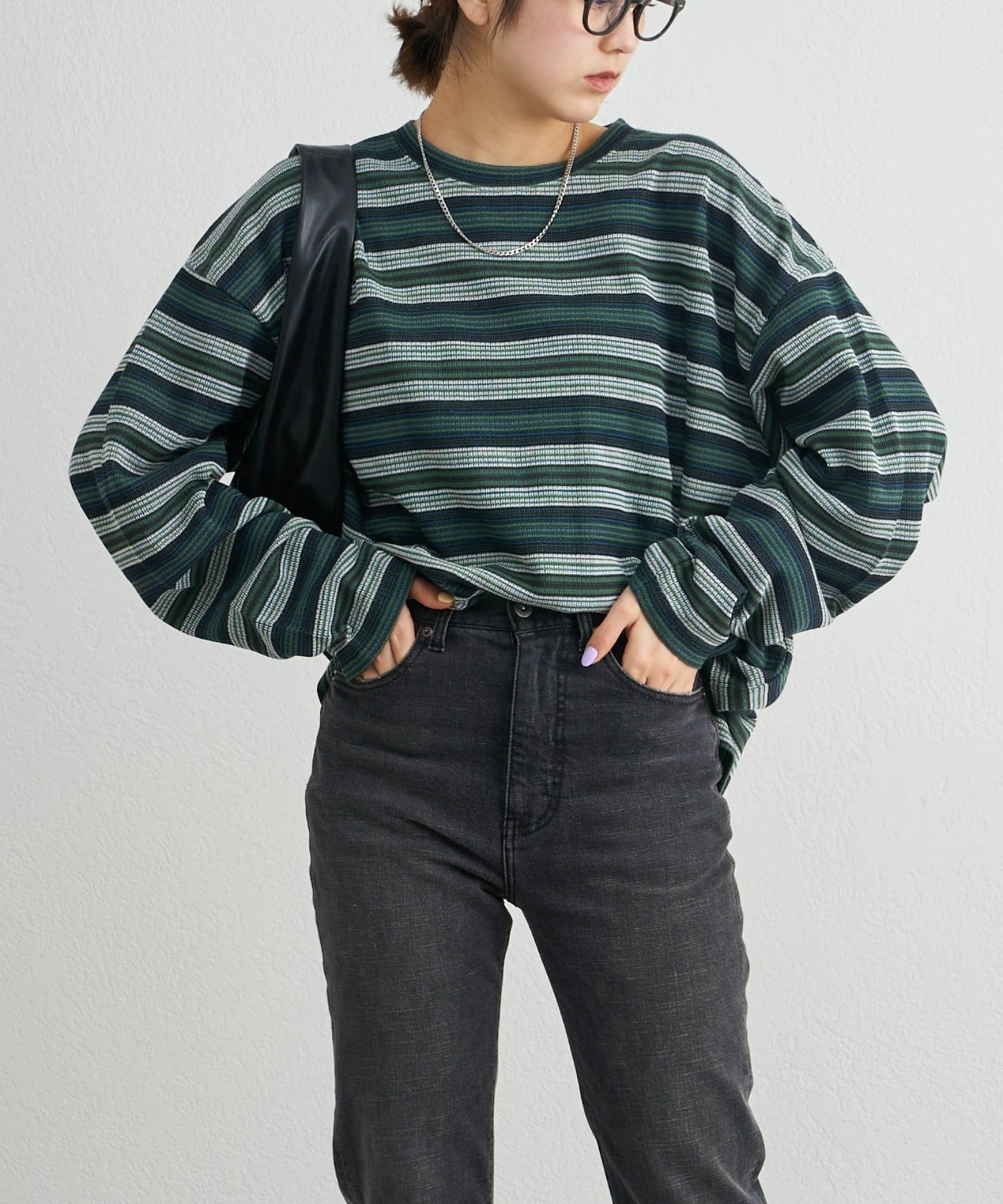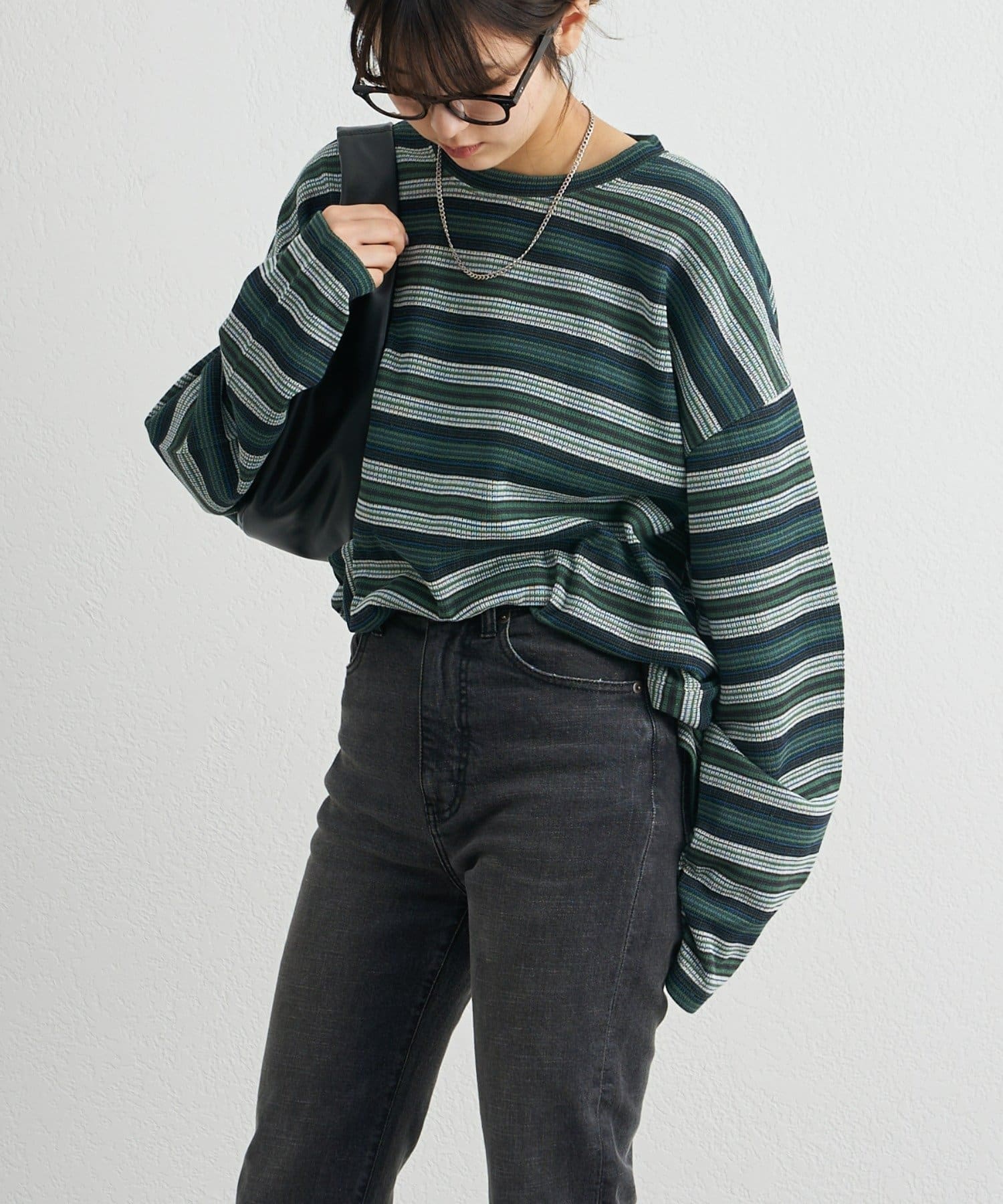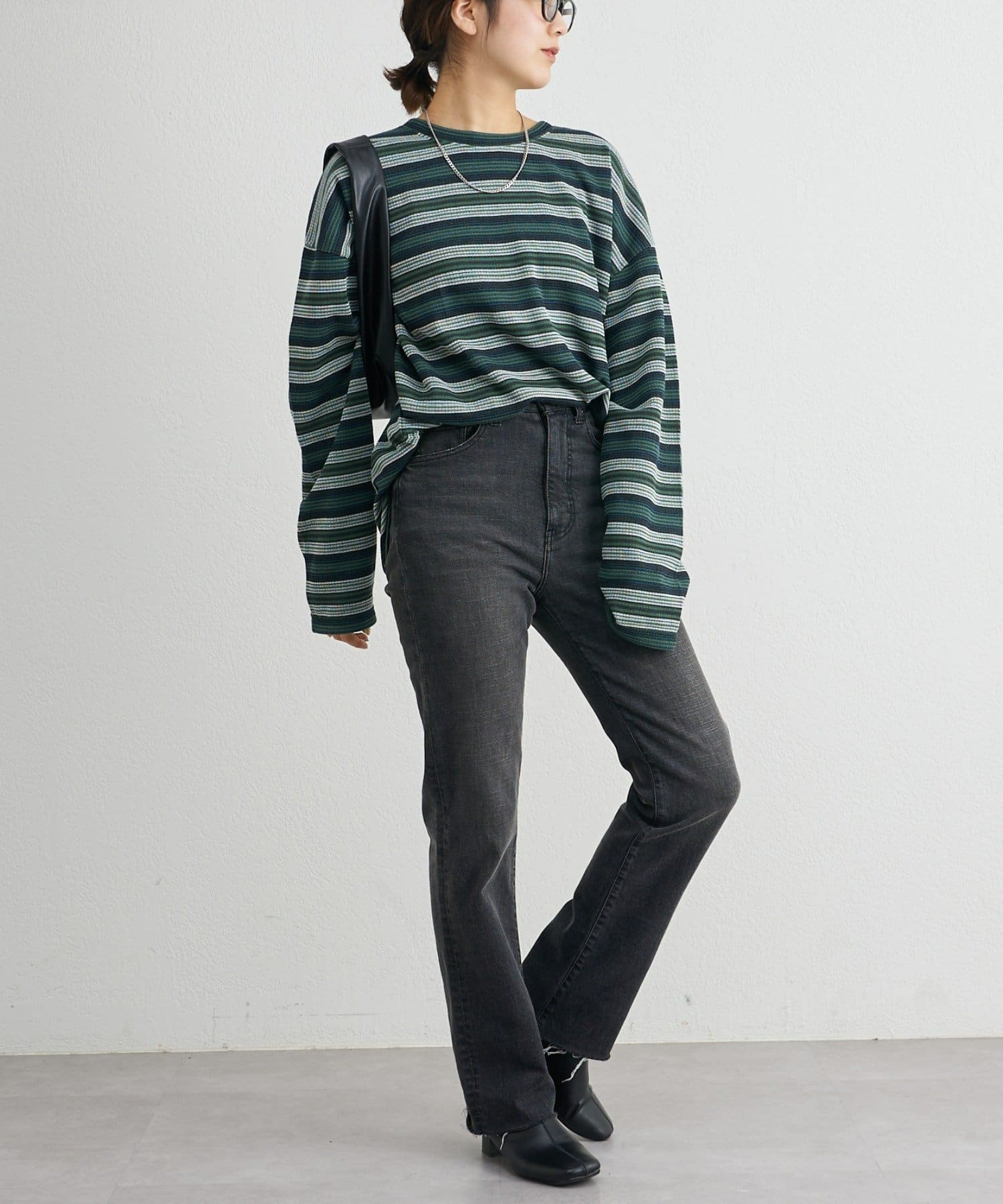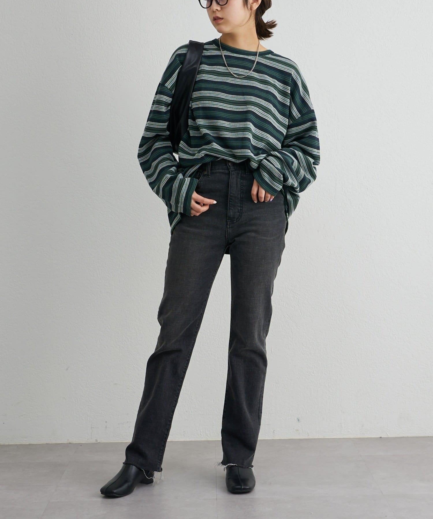 ボーダー柄が目を惹くので、他のアイテムはシンプルに、インナーでも重宝します。