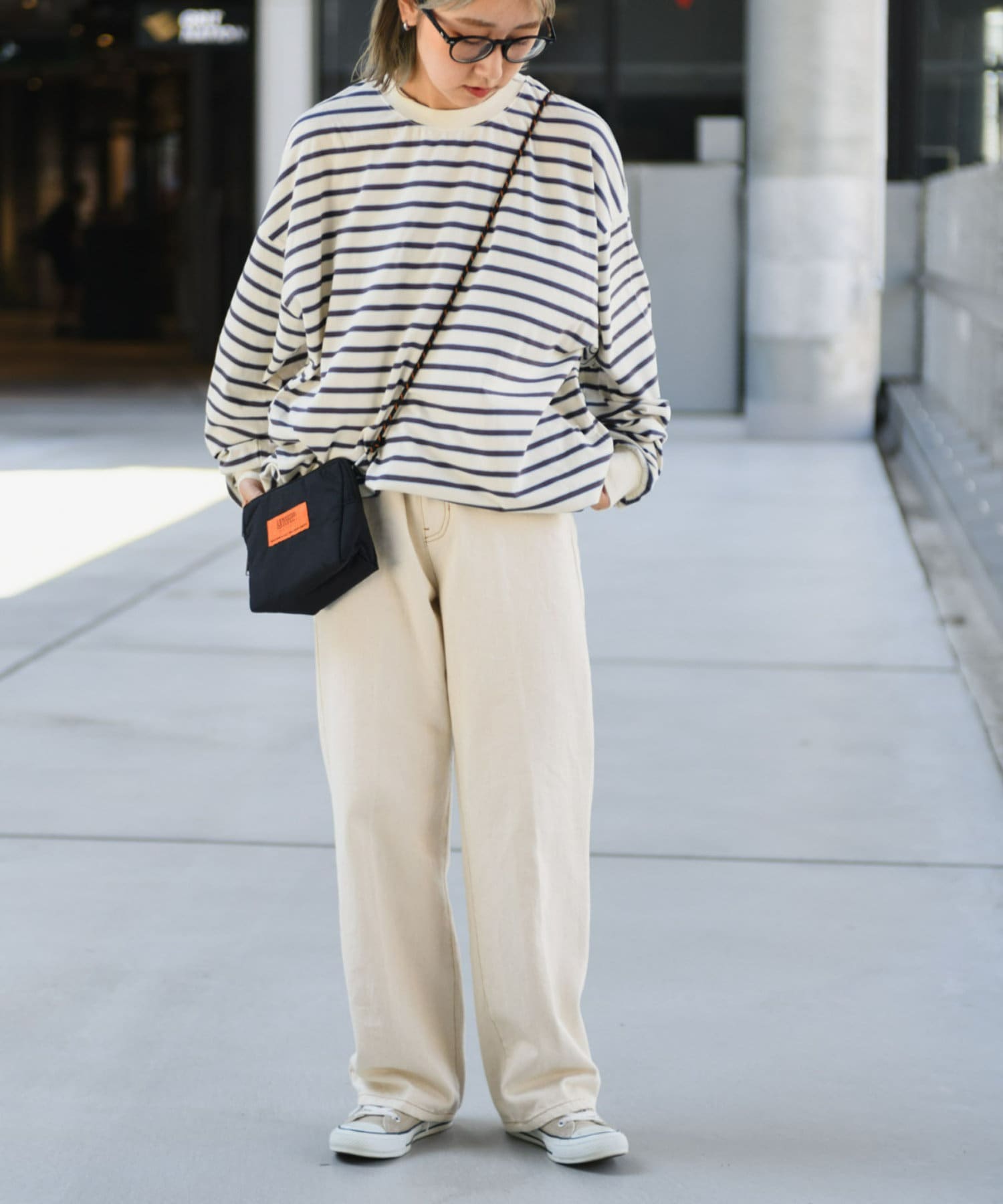 シンプルにデニムやワイドパンツ、スキニーパンツなど