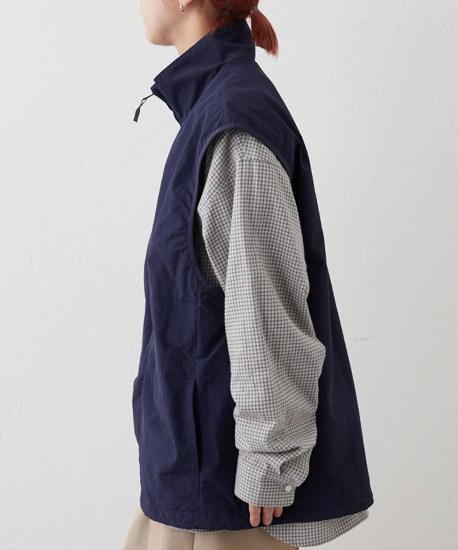スタンドネックシルエットが魅力的なベスト。