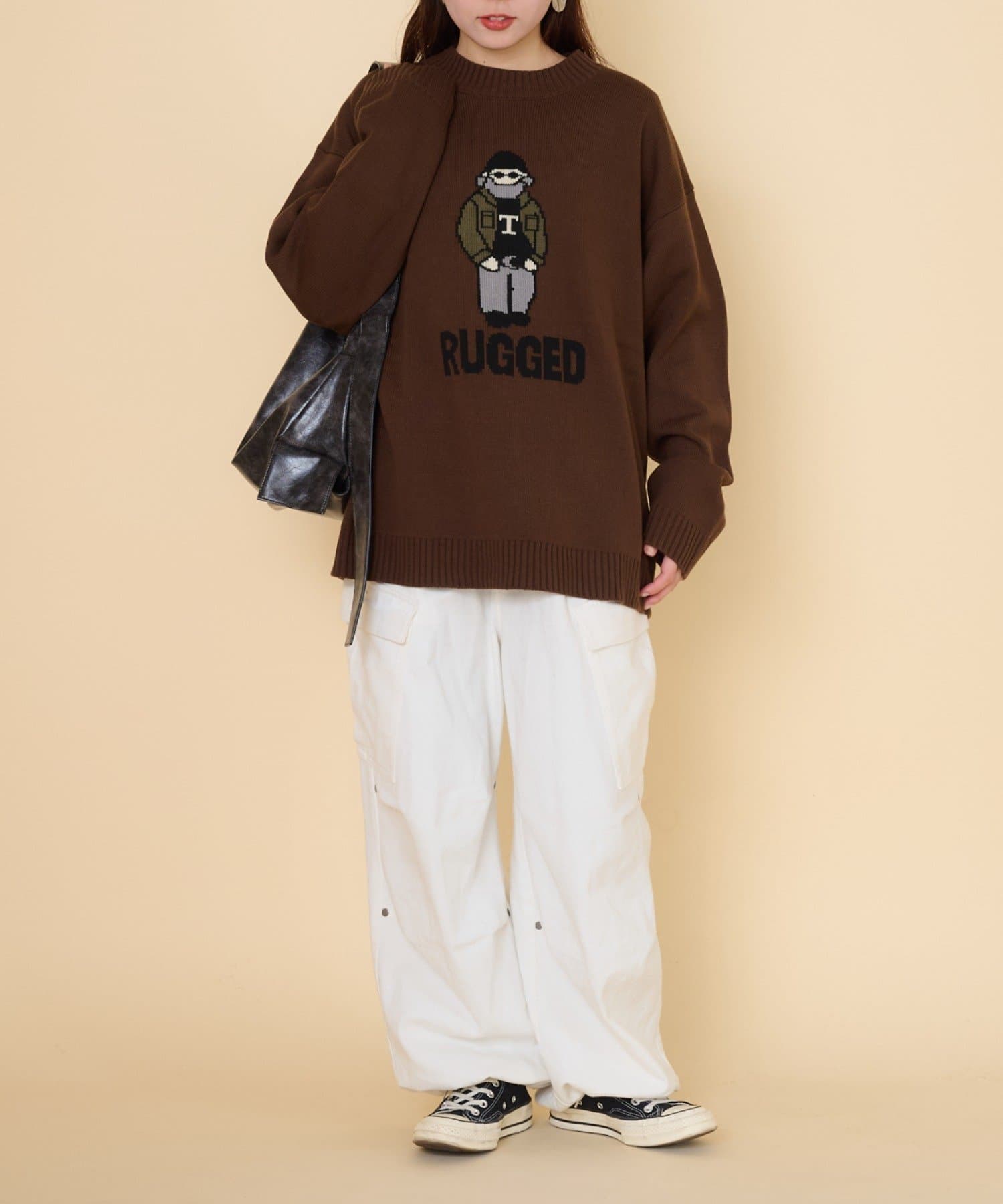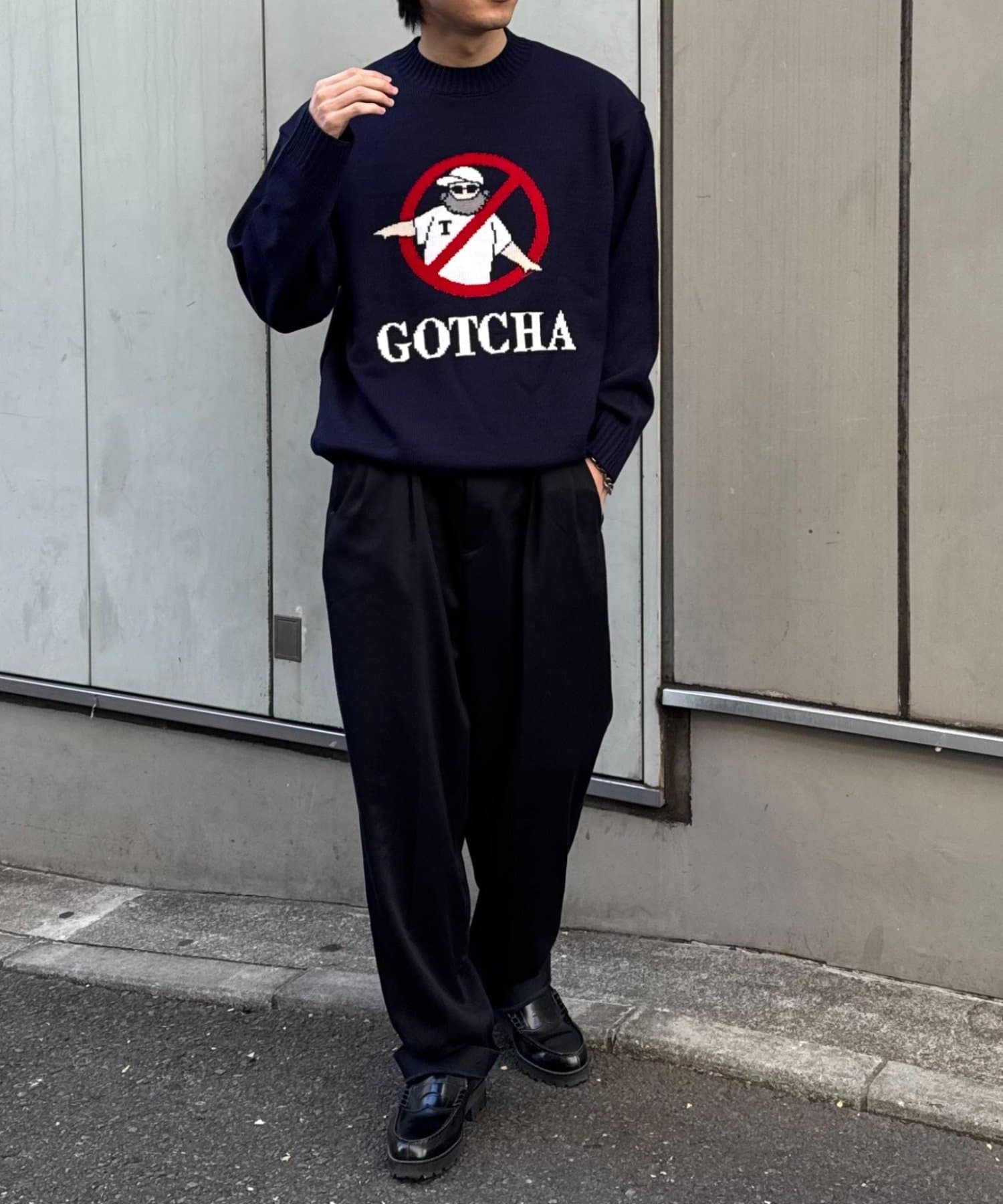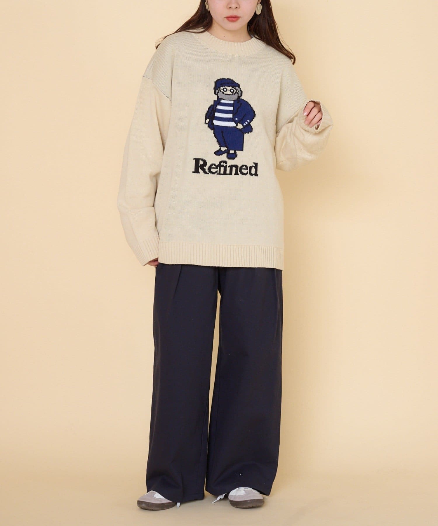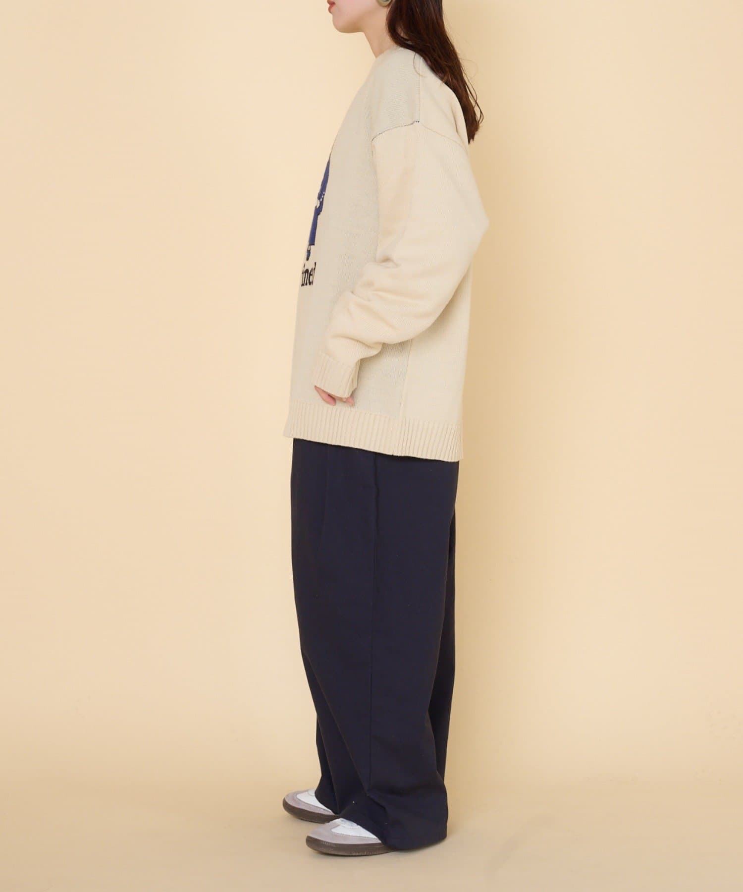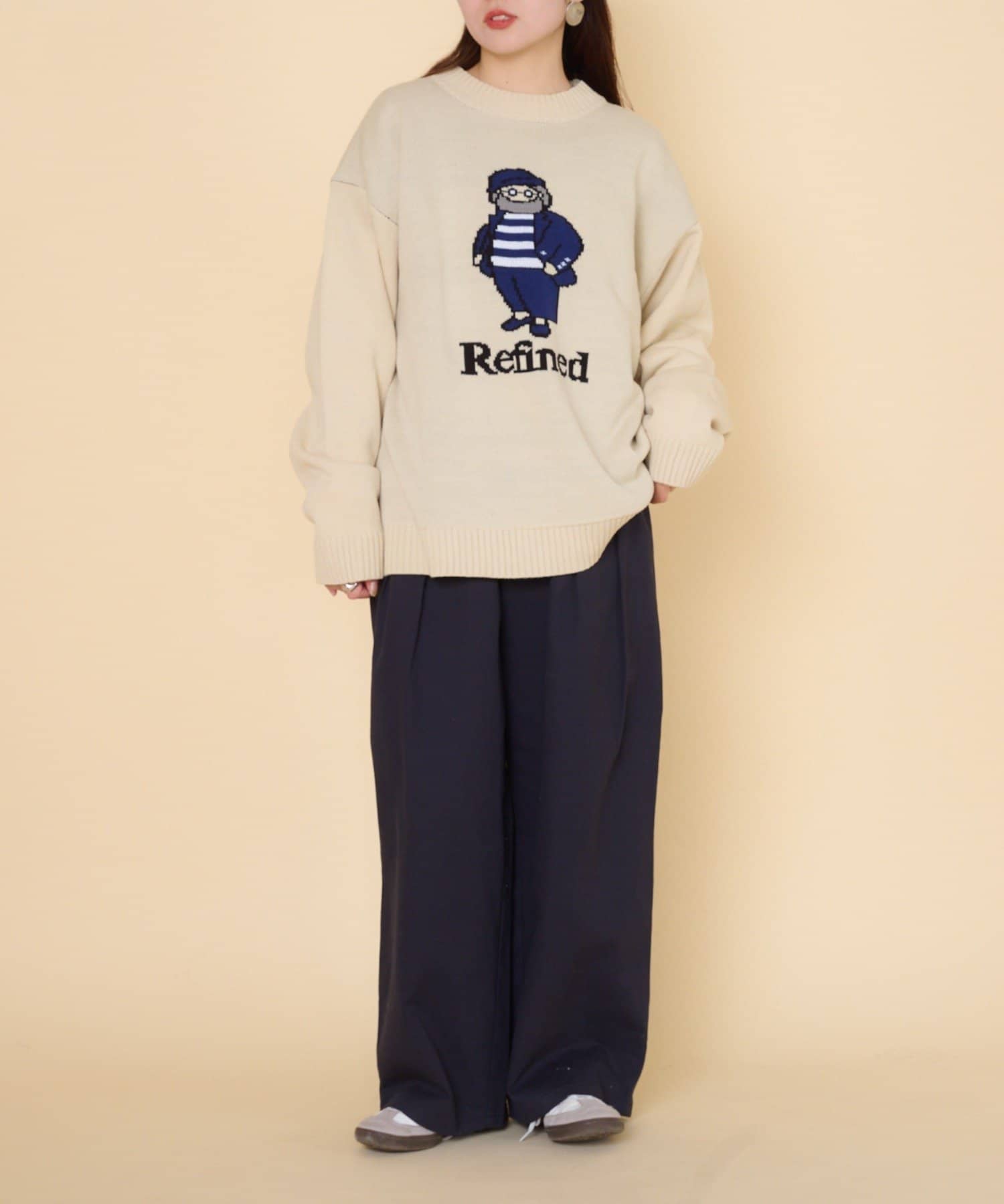 オジサンのプリントが存在感あるのでシンプルなボトムで合わせると、よりニットの可愛さが際立ちます◎