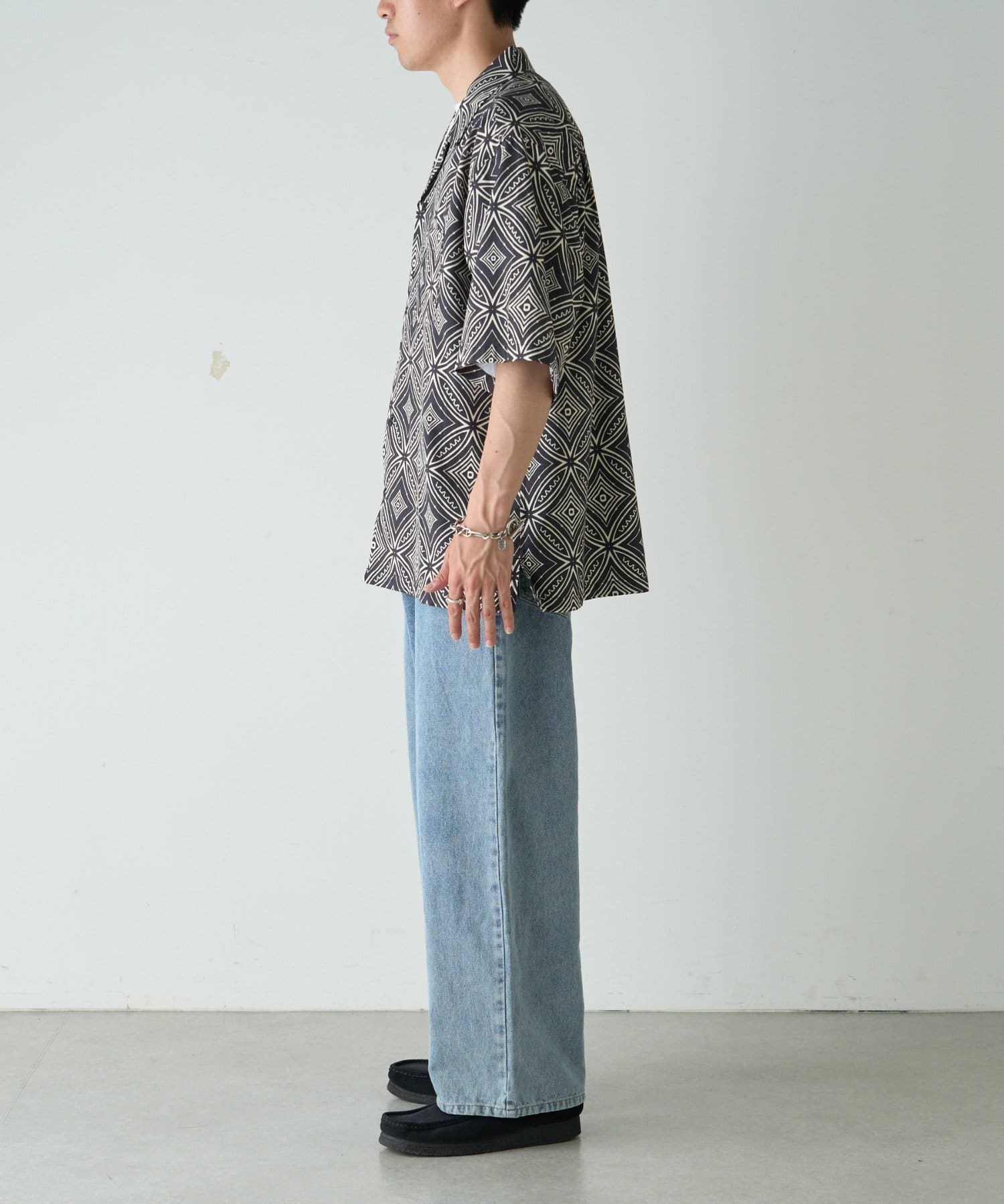 オープンカラーの抜け感と、軽やかな半袖のシルエットが夏らしいスタイリングにぴったり。