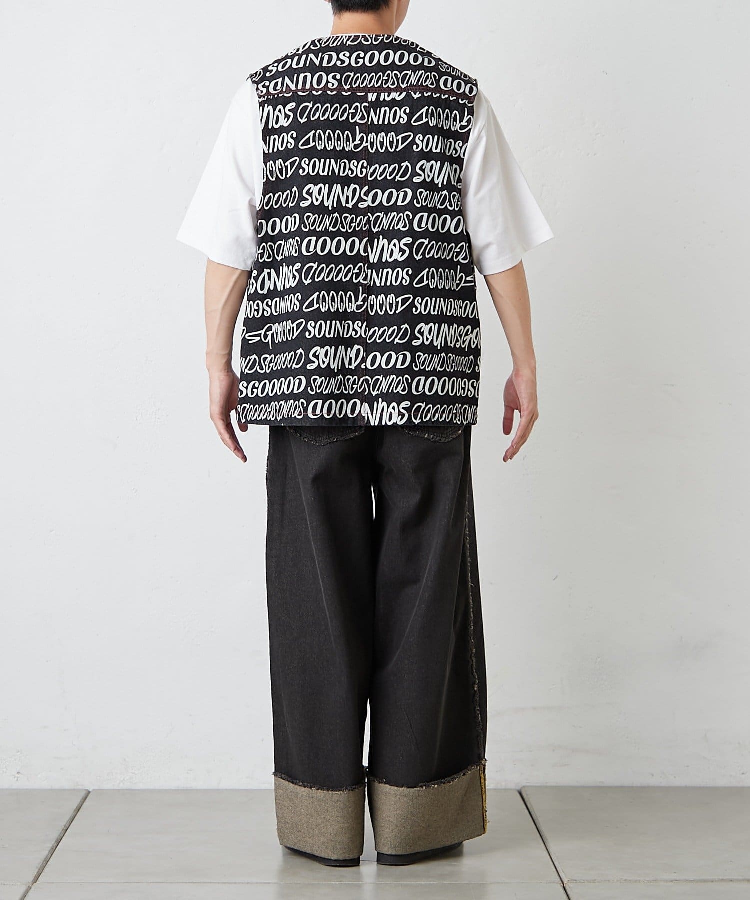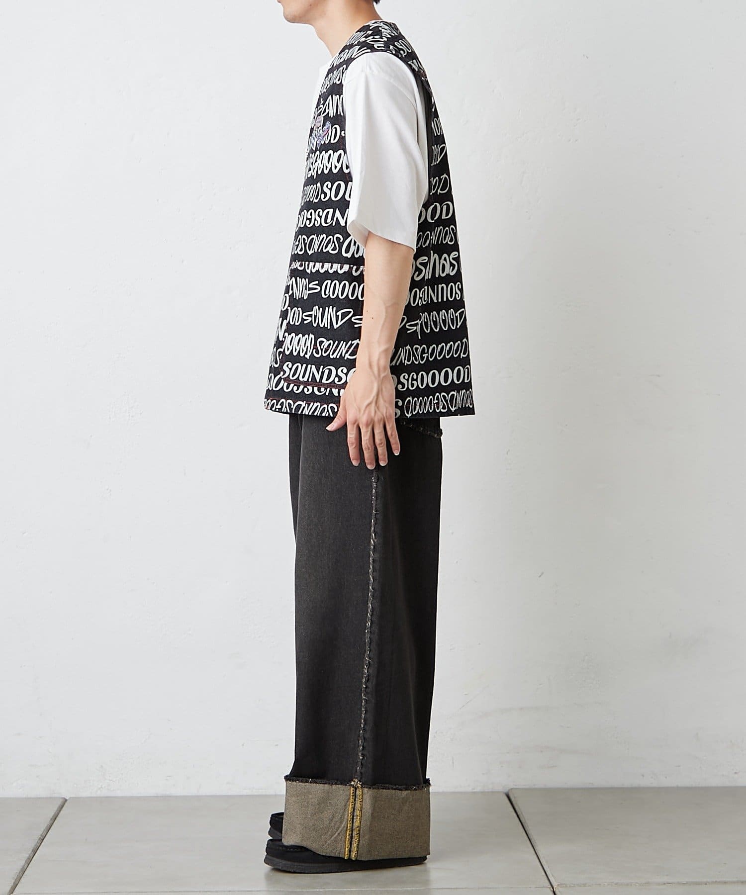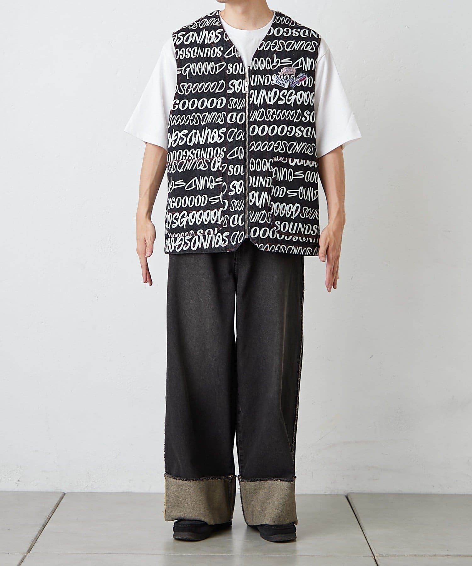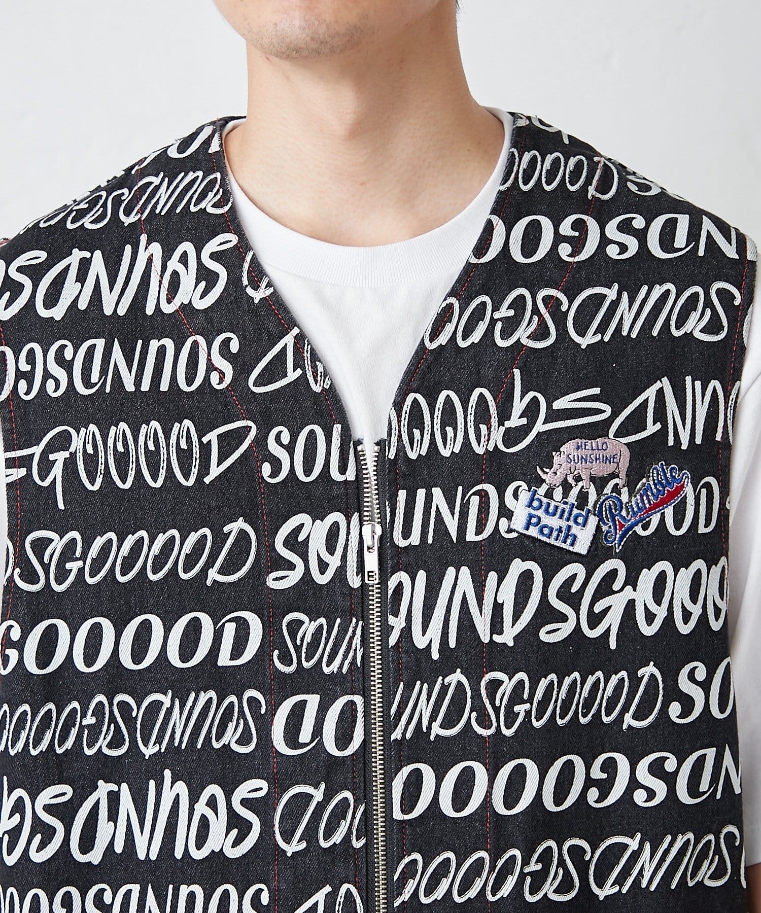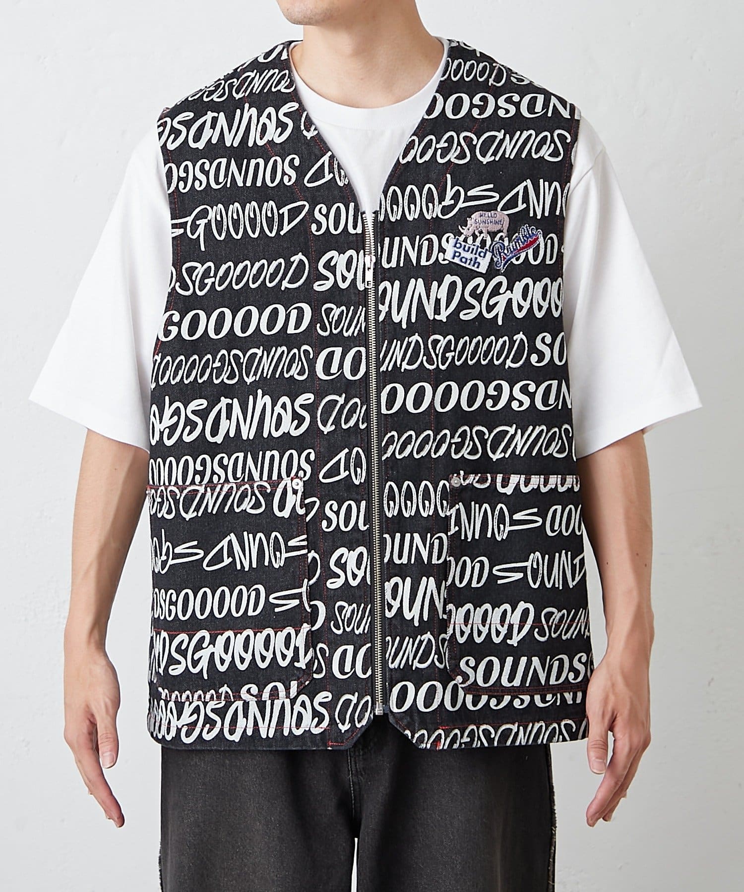 SOUNDS GOOOODらしい遊び心を詰め込んだ総柄ロゴベストが登場。