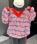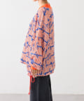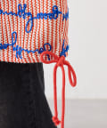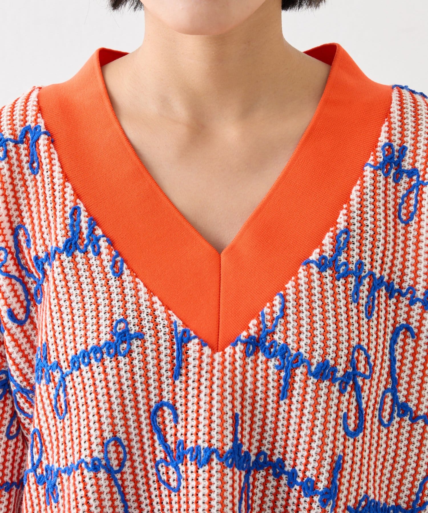 白地にオレンジの縦糸を織り込み、首周りと袖口にもオレンジを配色することで、シンプルながらも目を引く仕上がりに。