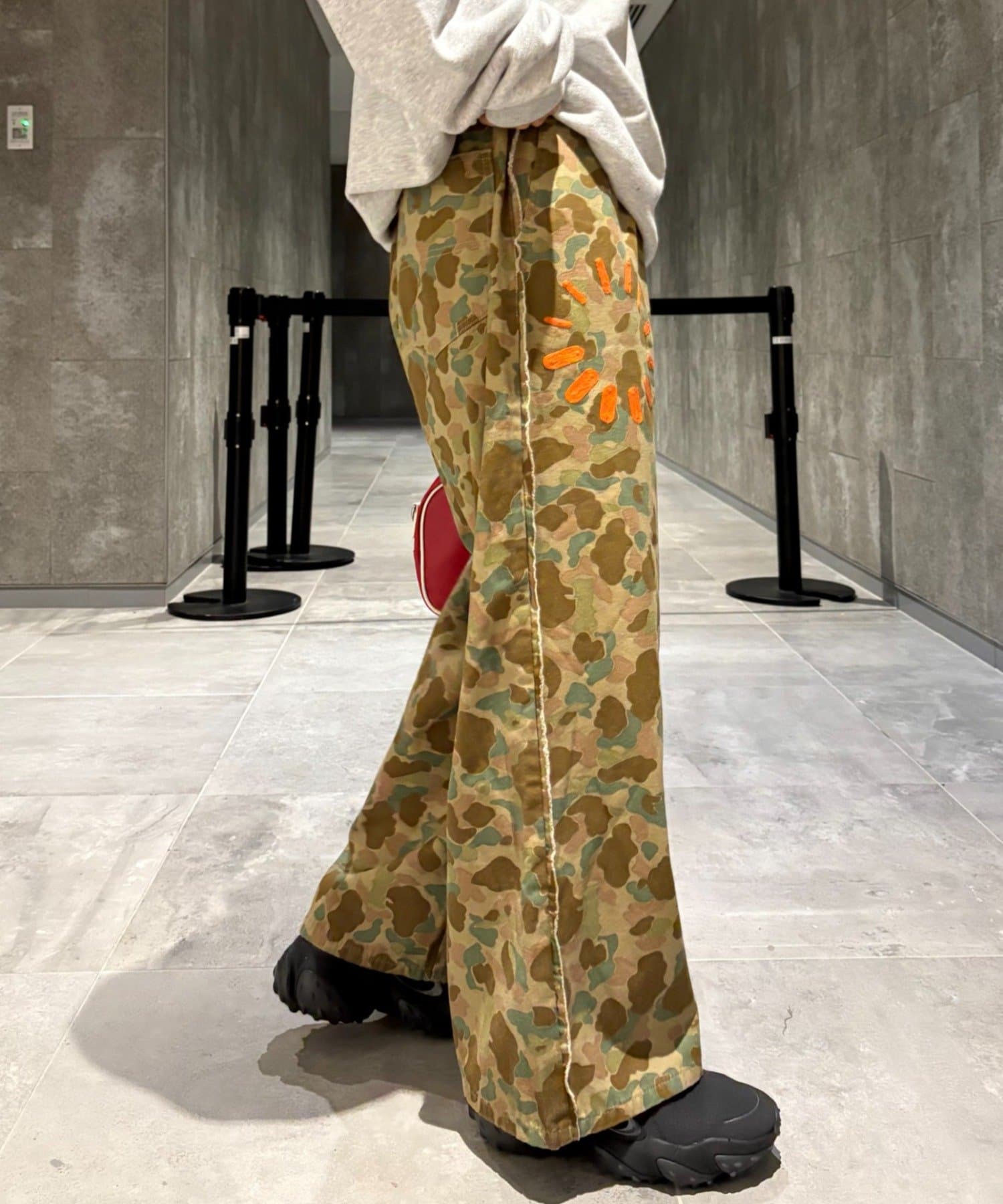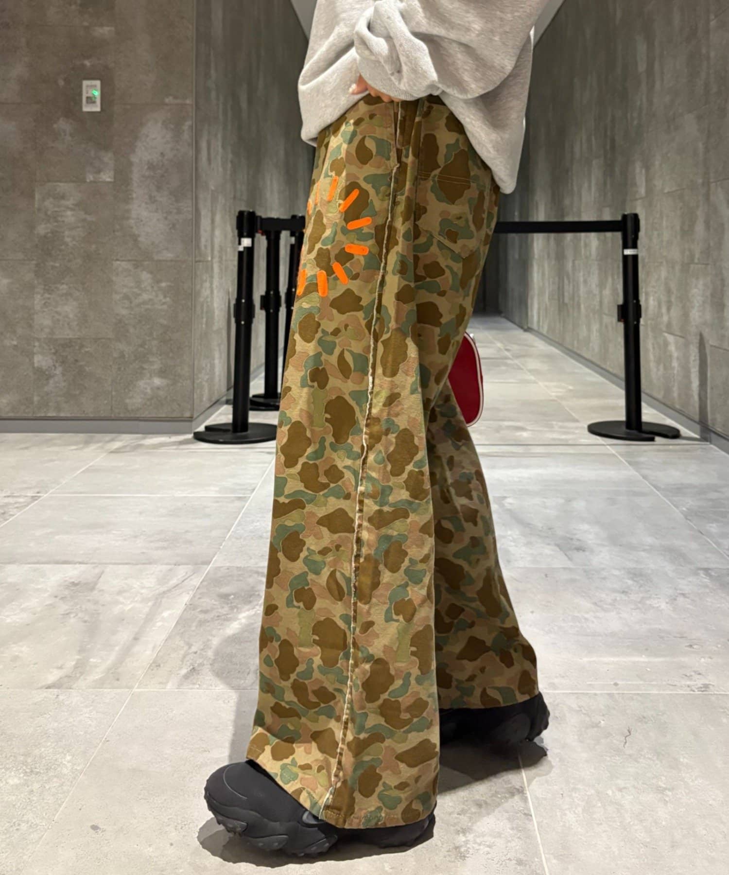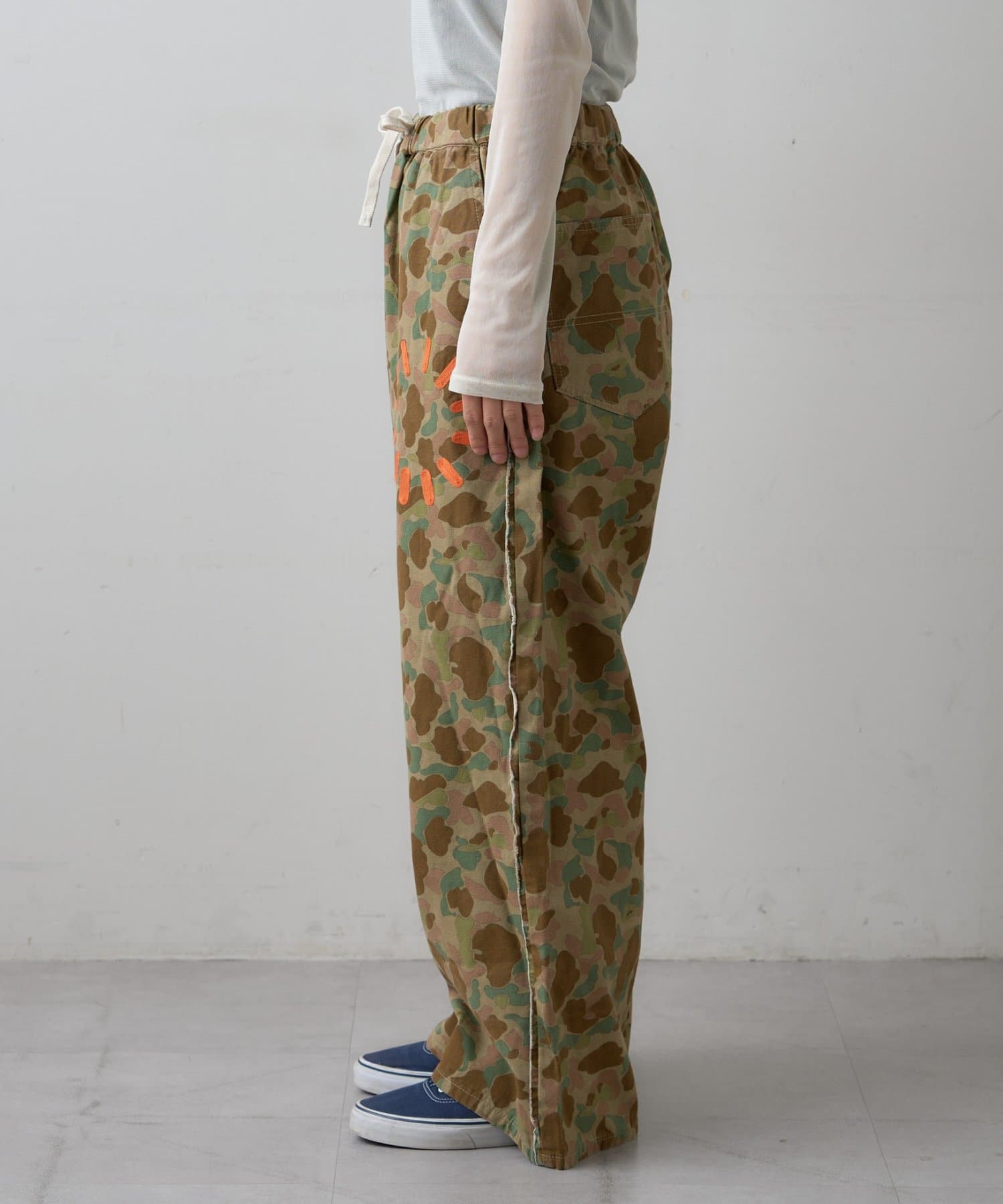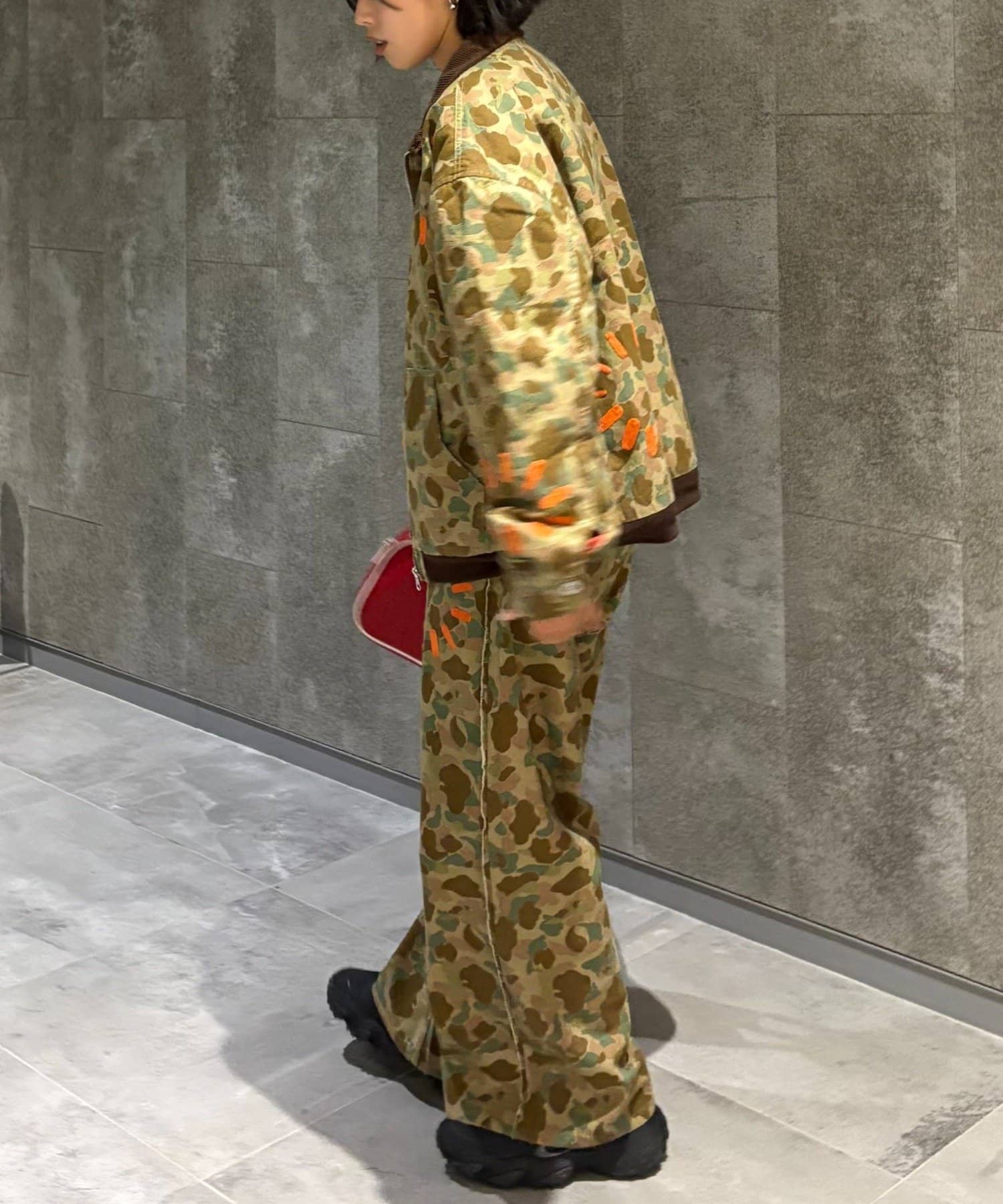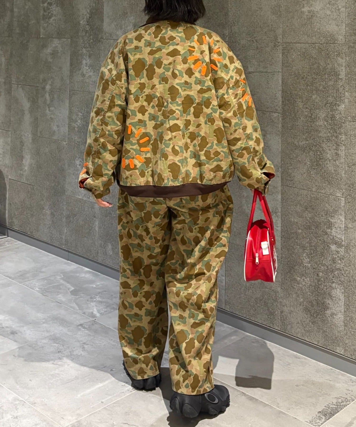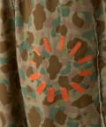 定番の迷彩柄をベースに、目を引くオレンジのアクセントをプラス。