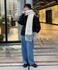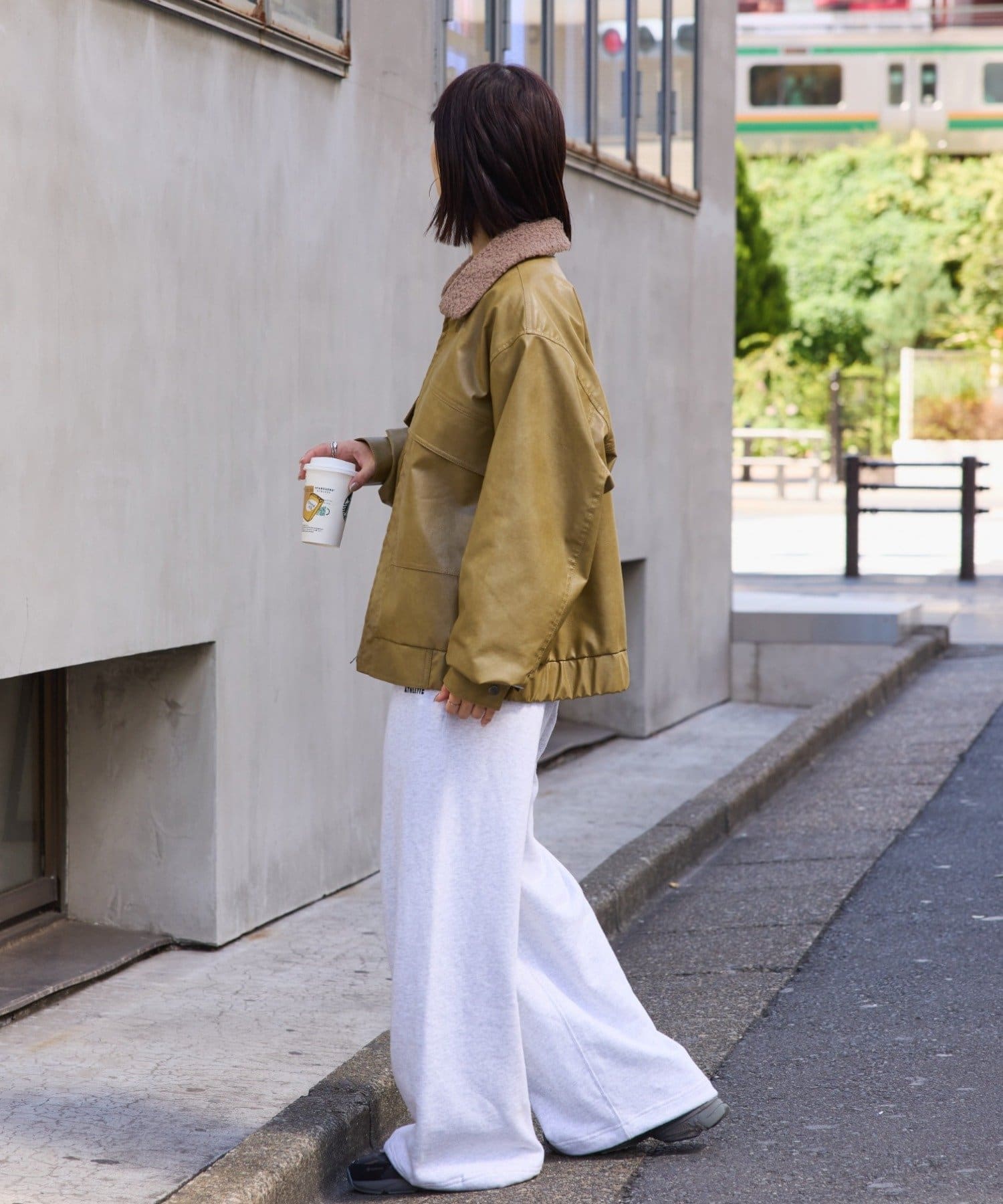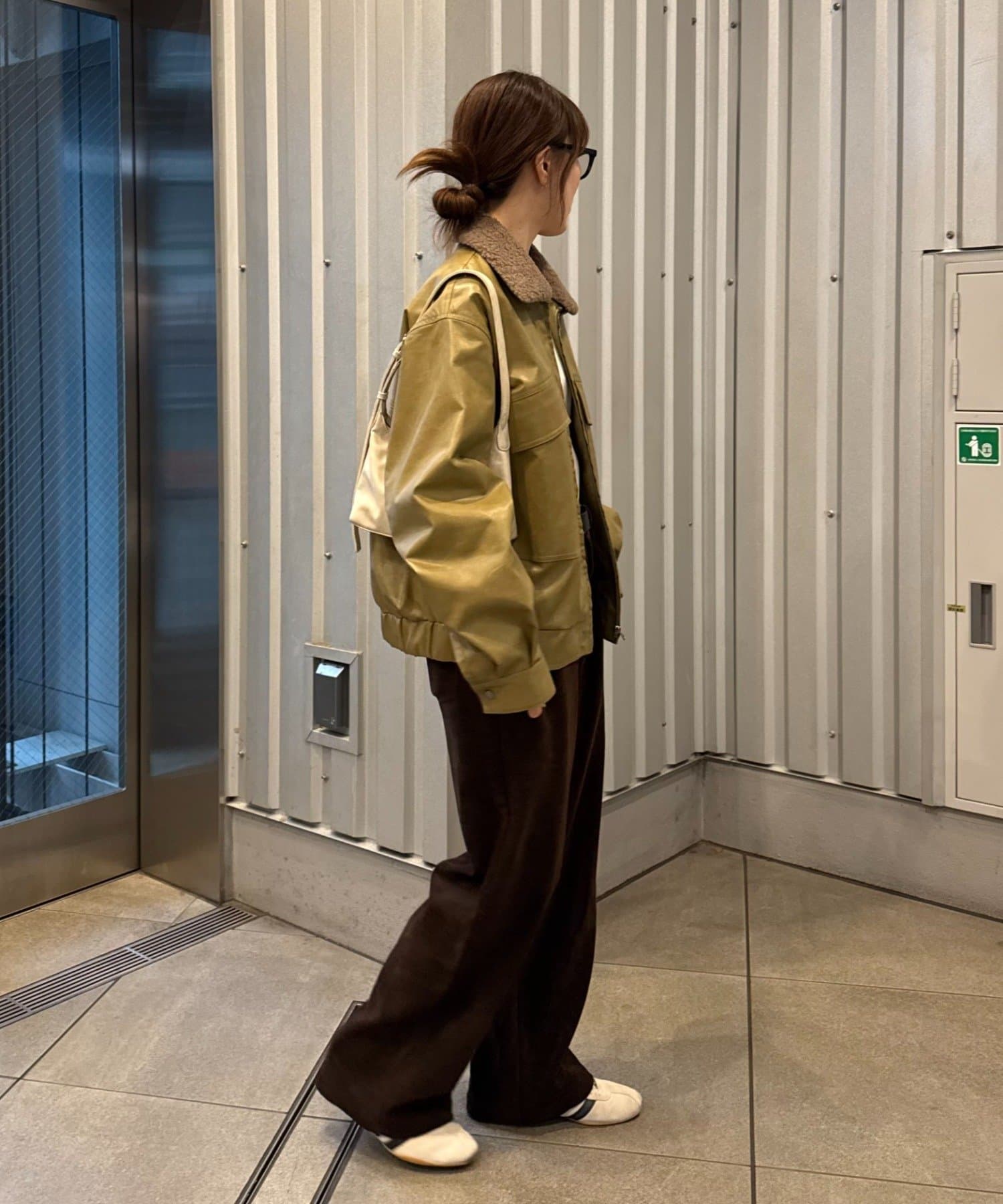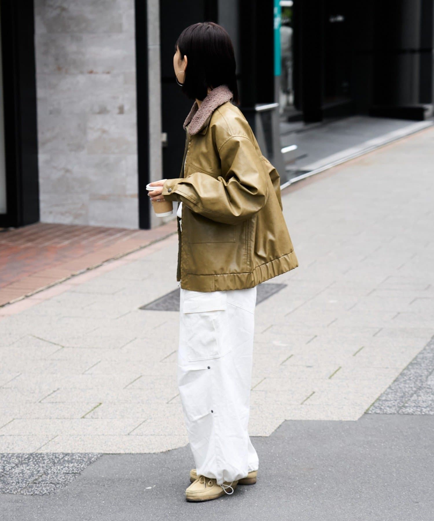 ボアを外してスラックスなどとモノトーンでまとめると、モードで都会的な印象、